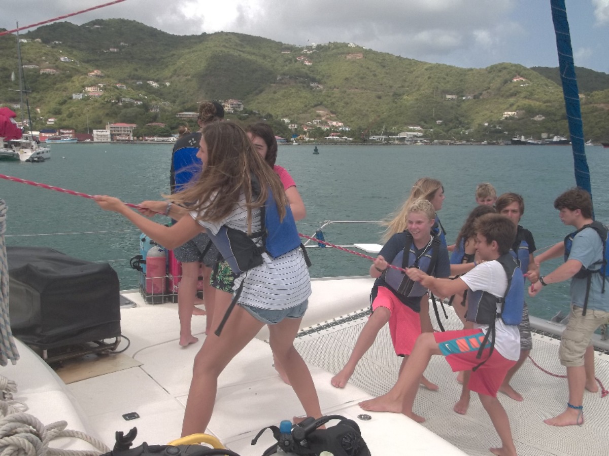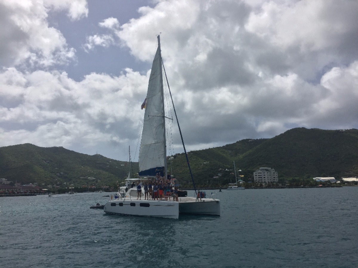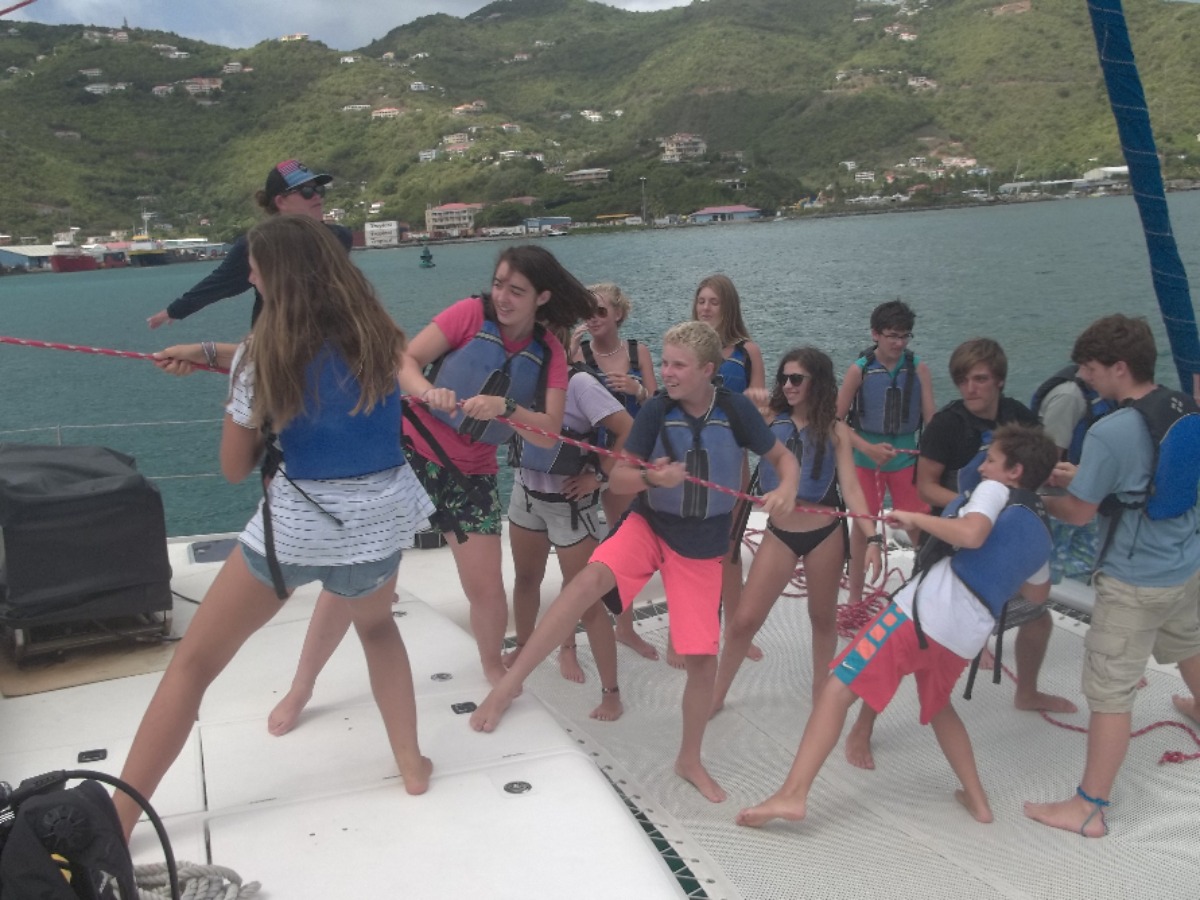 Today the staff and shipmates of Rangitoto Too woke up to the cozy aroma of pancakes. We eagerly jumped out of bed and sat down to breakfast all with the realization in the back of our heads that this is one of the last breakfasts we will share. After cleanup, the Neptunes went water skiing while the dolphins tagged turtles. At 10:00am, the two groups reunited back on board and we set sail for Road Town. Although most of the stores were closed in port, a great time was had by all as we caught up with friends from other boats, and restocked our snacks. After Road Town, the race between the catamarans was soon to begin. Rangitoto Too was off to a strong start as one of the first boats to hoist our main sail. However, we had some complications, and ultimately had to take down the main sail, and hoist again. But our moral was still high, and we hoisted again with even more enthusiasm than the first time. We then unfurled the jib with great haste as we knew our starting position was being compromised. Although our enthusiasm never wavered, we ended up starting and finishing the race in last place. After the race, we showered and sat down to our last dinner on the boat of cheddar broccoli pasta and biscuits. The day finished off with writing cards for our shipmates and staff while watching a double rainbow.