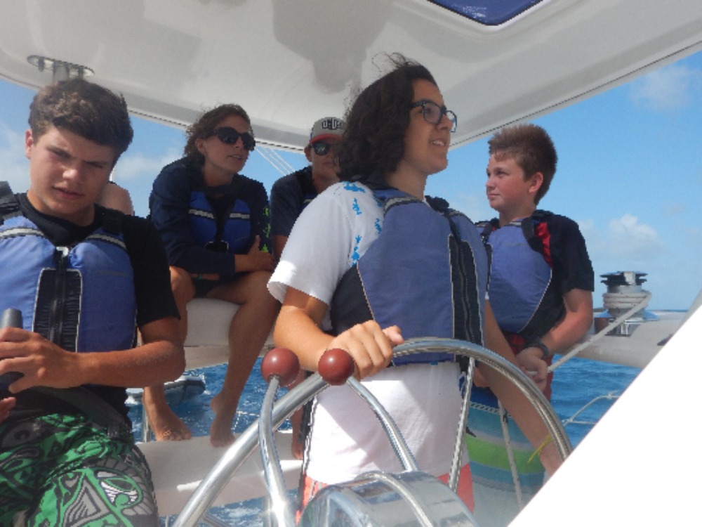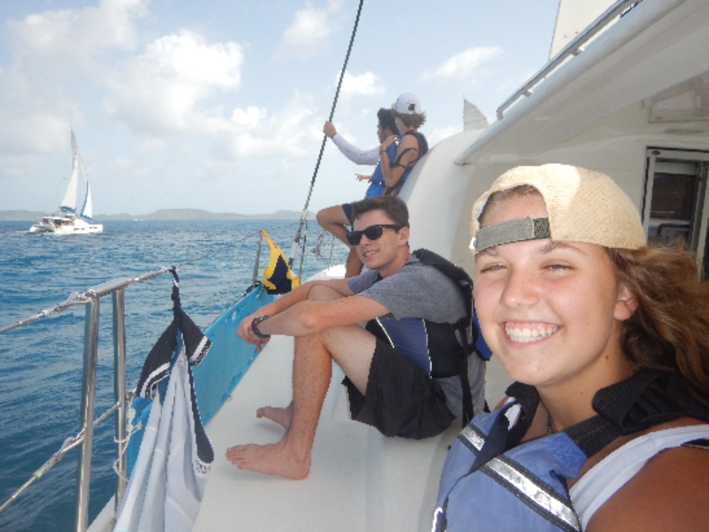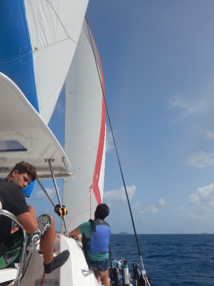 After we woke up to a breakfast of pancakes, we had a choice of what we wanted to do during the morning. The Dolphins chose to go turtle tagging the Rescues went diving with the Neptune’s. After we finished with the morning activities. We then motored to Road Town, the biggest city in the BVI. We had 2 hours of shore time. We were able to get food from a small little restaurant on the marina. After the food came an hour and a half later after we finished lunch we then got back on to the boat. Once we left Road Town we raised sails and raced the rest of the dive side cats. Even though we are the slowest boat in the fleet. We were still able to come in 4th on front of Rangitoto Too. After the race, we then caught a mooring ball in the bay we raced to.