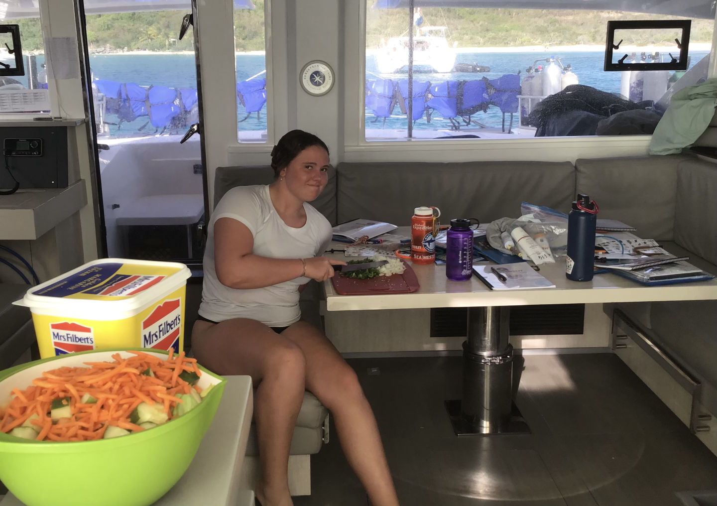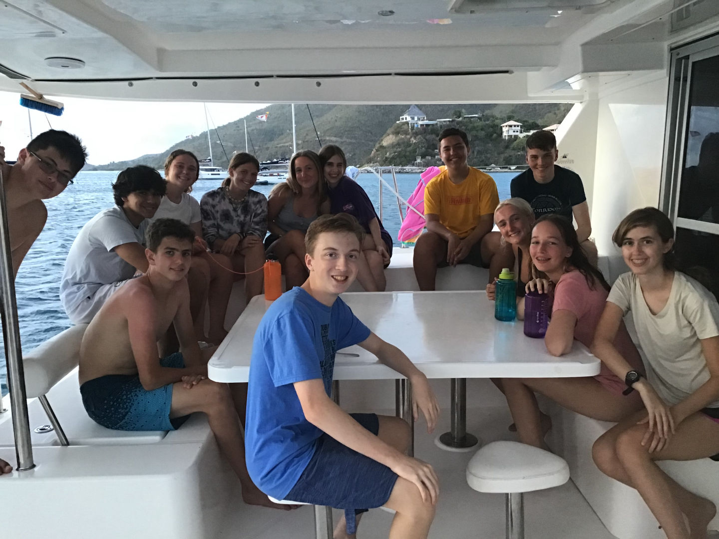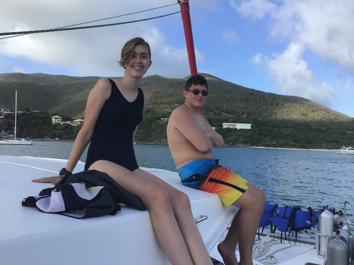 We started the day at 7:00 in the morning today, and our breakfast was yogurt and bagels. We sailed to Cooper Island, which took about two hours to get to. We had a briefing for our naturalist dive and how we were going to describe the life we see underwater. We then got our scuba gear on and headed into the clear warm water. We went down around 25 feet and saw a bunch of fish and coral. Once we got back to the surface, we had lunch which was peanut butter and jelly or deli meat. Josh made peanut butter and jelly with turkey in the middle. We got tan while we were sailing towards Savanna Bay. We had a really good dinner with pasta, sausage, peppers, and garlic bread. Now we are about to meet Cas.