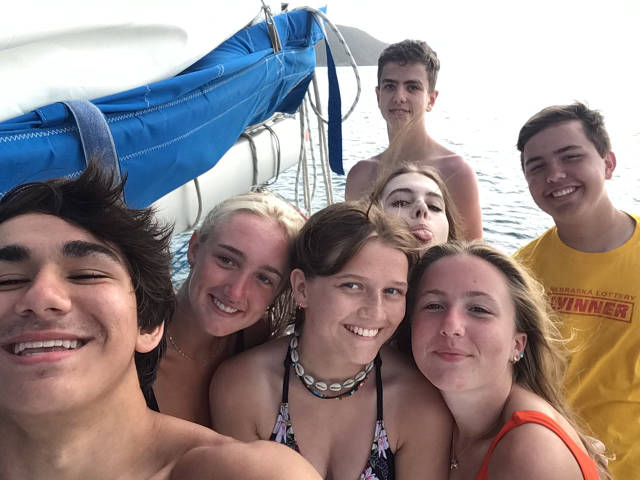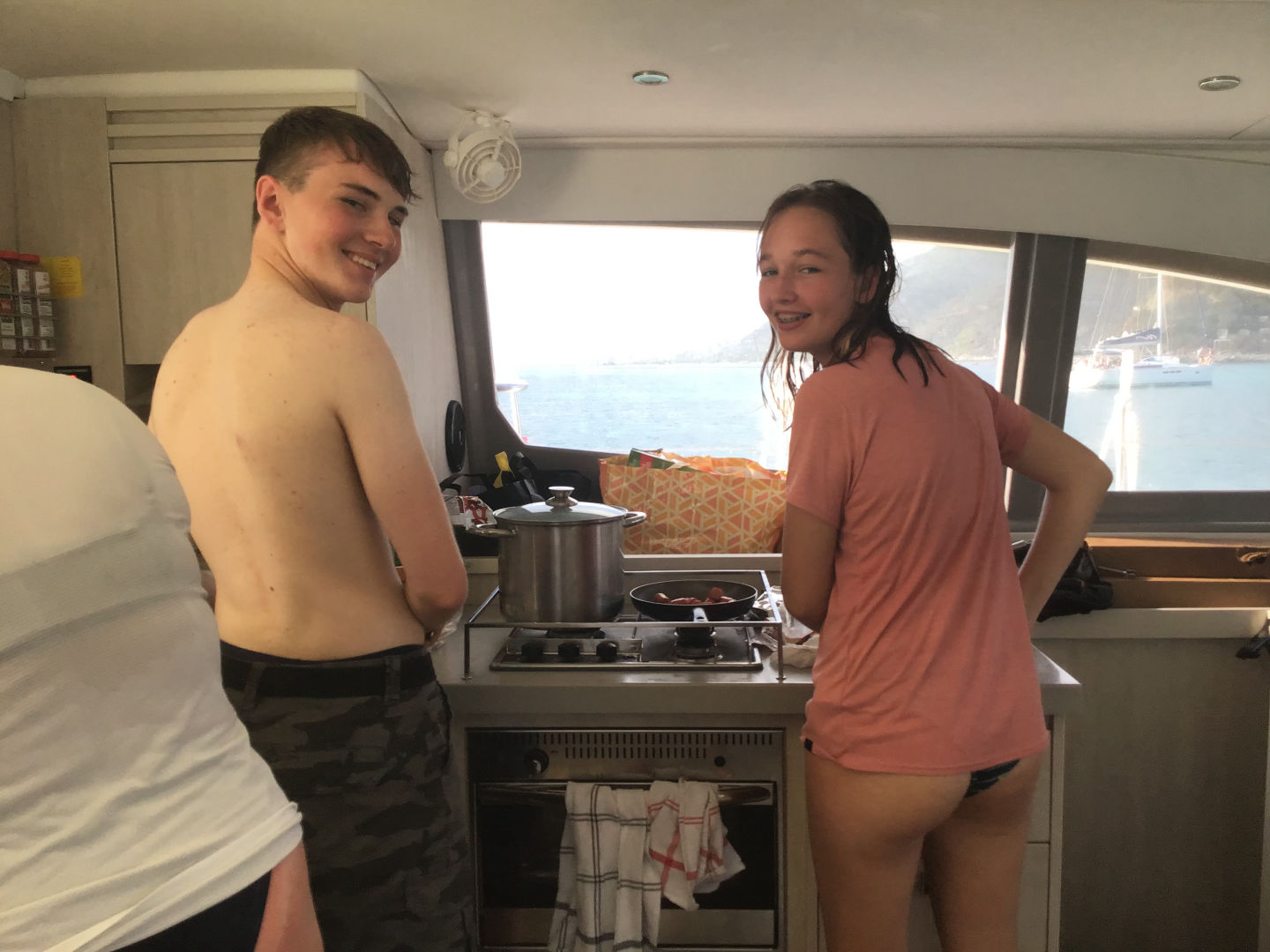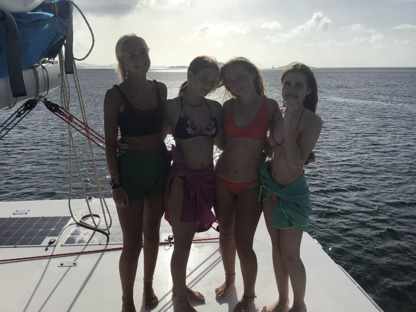 We started the day at 7:00 in the morning today, and our breakfast was yogurt and bagels. We sailed to Cooper Island, which took about two hours to get to. We had a briefing for our naturalist dive and how we were going to describe the life we see underwater. We then got our scuba gear on and headed into the clear warm water. We went down around 25 feet and saw a bunch of fish and coral. Once we got back to the surface, we had lunch which was peanut butter and jelly or deli meat. Josh made peanut butter and jelly with turkey in the middle. We got tan while we were sailing towards Savanna Bay. We had a really good dinner with pasta, sausage, peppers, and garlic bread. Now we are about to meet Cas.