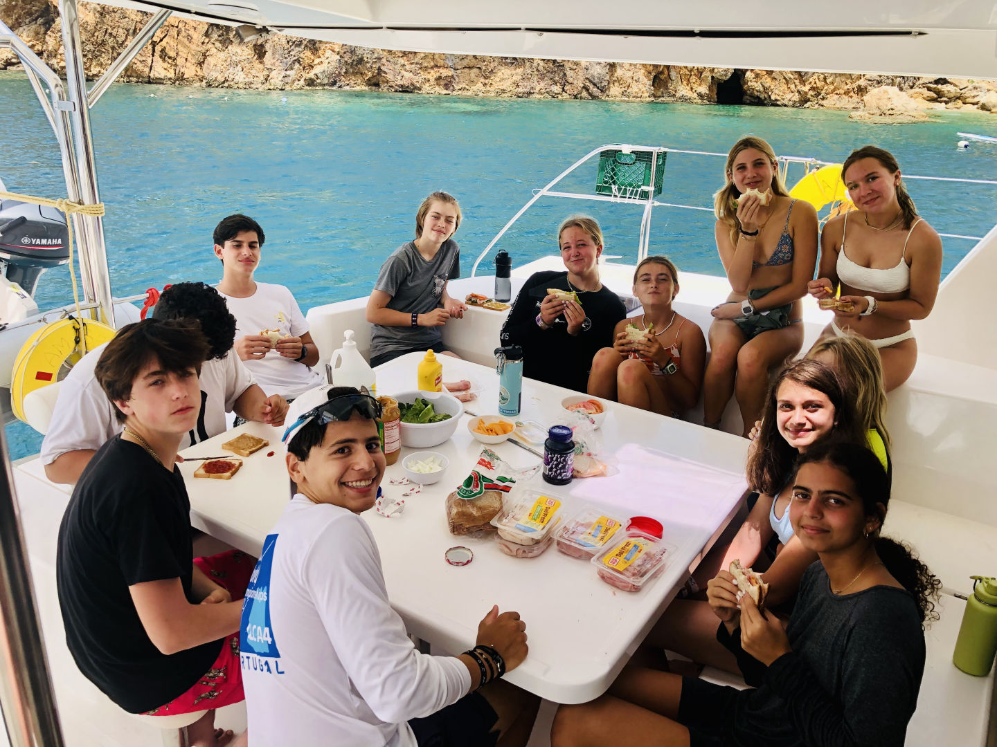 After we arrived at our destination- Norman Island- we had sandwiches. At the destination, we took a swim test. The swim test consisted of swimming four laps around the boat and treading water for 10 minutes. As soon as that was completed, we got ready to snorkel in some caves. There were lots of pictures taken by Zoe, Shane, Ana, and Lilly. These pictures consisted of numerous types of fish, an eel, coral, a beautiful clearing with rocks, and a school of fish. On the boat, after snorkeling, most of us went jumping off the dinghy. This was very fun, and people were trying front flips, back flips, gainers, front pikes, and more. We showered in the ocean. After showering and getting changed, all of us got changed and saw a turtle. While Riley and Ana were making corn, mashed potatoes, salad, and sloppy Joe’s, Carlo, Alta, Asa, Myles, and Julian sat around a table while talking and listening to music. When dinner was ready, we all ate a delicious meal while playing telephone. As soon as we all finished eating, we did a squeeze. We said our daily appreciation and asked if we ever broke a bone. Everyone answered the questions, and after we finished, we all squeezed each other’s hands and barked like a dog. That was a great way to end the day.