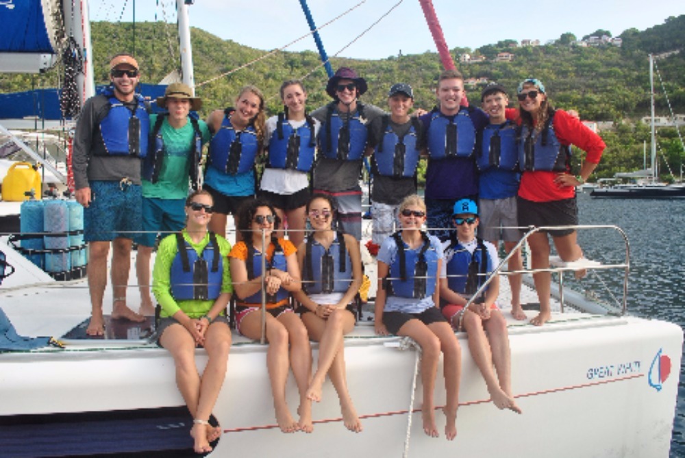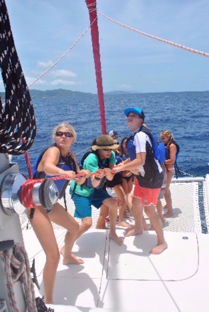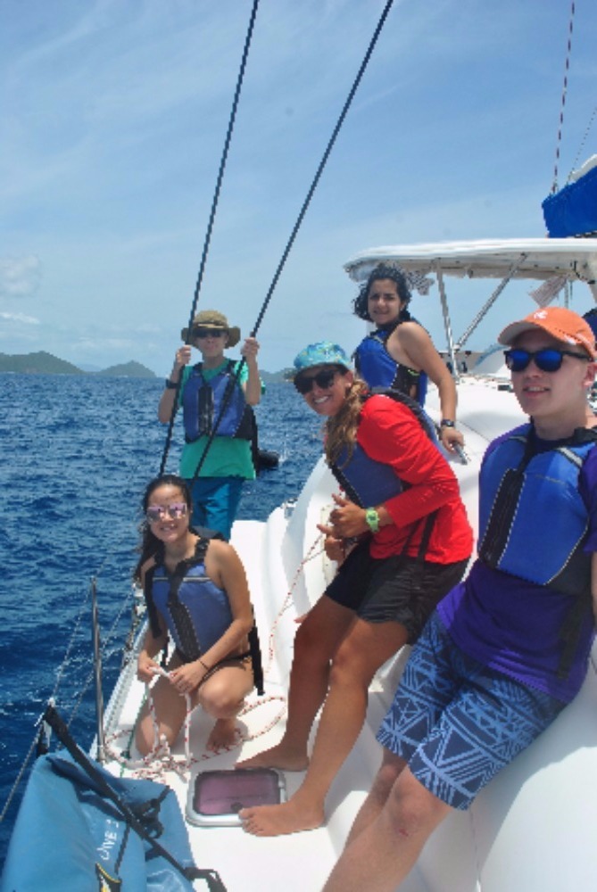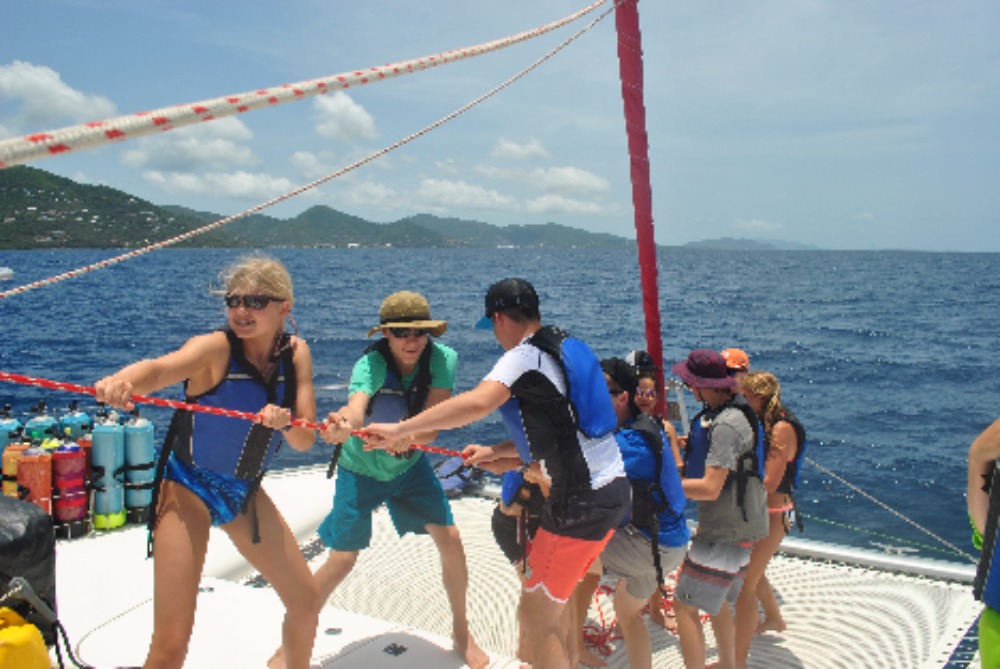 We woke up early at 6:30 to the beautiful view of the sunrise reflecting its colors onto the perfect Kool-Aid-blue water of the British Virgin Islands. After a bowl of cereal, my shipmates and I got together on the bow of the catamaran to get to know each other a little better. Mike, the director of ActionQuest, gave us a talk on what we could expect on each boat during this voyage. With the sun already showing its face, we set sail for the first time. Patiently I waited with my other shipmates to get into the ocean for the first time, but the wait was not that hard because until we sailed towards White Bay, Peter Island, we learned hot to tie the bowline knot, put up the sails, and ate lunch. Upon our arrival, after a turtle sighting, swim tests and a dive chat, it was time to do our first dive. We went over basic dive skills such as mask flood and clear, and ascent. It was showering time after the dive, but unlike the showers at home, these showers were salt-water showers and we were only allowed to use fresh water shower for only 10 seconds. After rocking out to some great music with each other, we ate dinner. Cleaning up after dinner is also different than at home, we have a job wheel that decides which jobs, we have for the day like a deckie, a salt-water washer and a skipper. The skipper has a special job because he/she is in charge of asking the squeeze question. The squeeze question is special because it is a chance to get together with your shipmates and get to know them better than you already do. Now we are filling out dive logs and starting to wind down after a radical day.