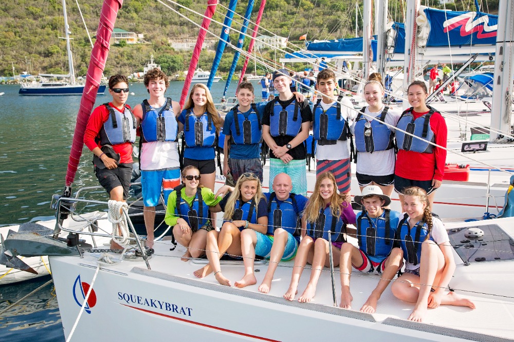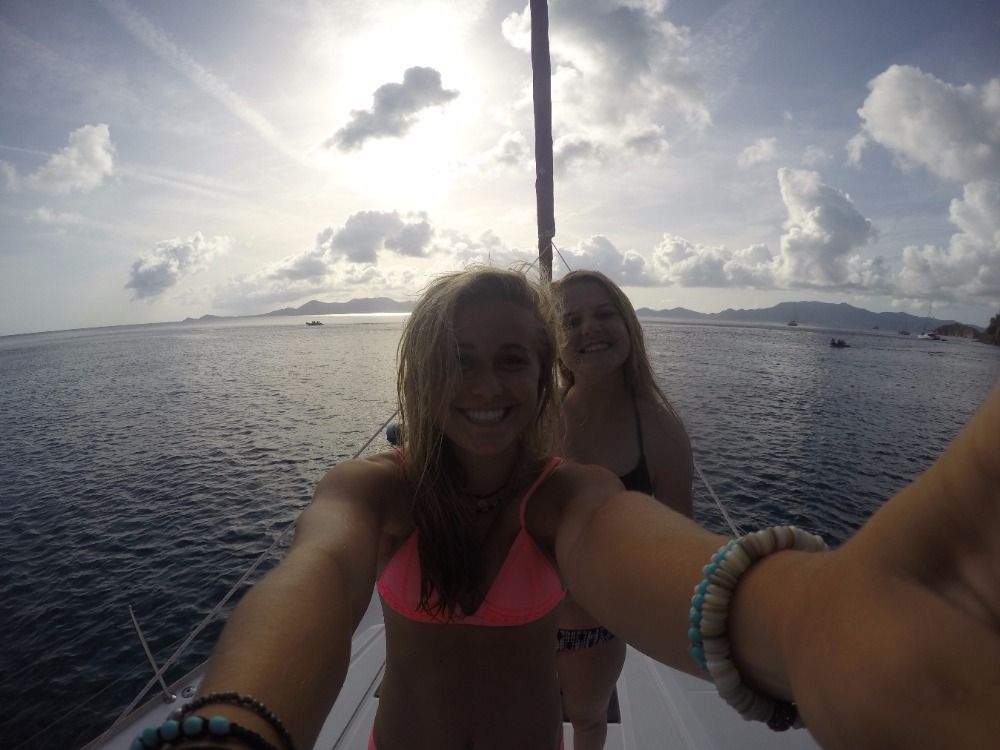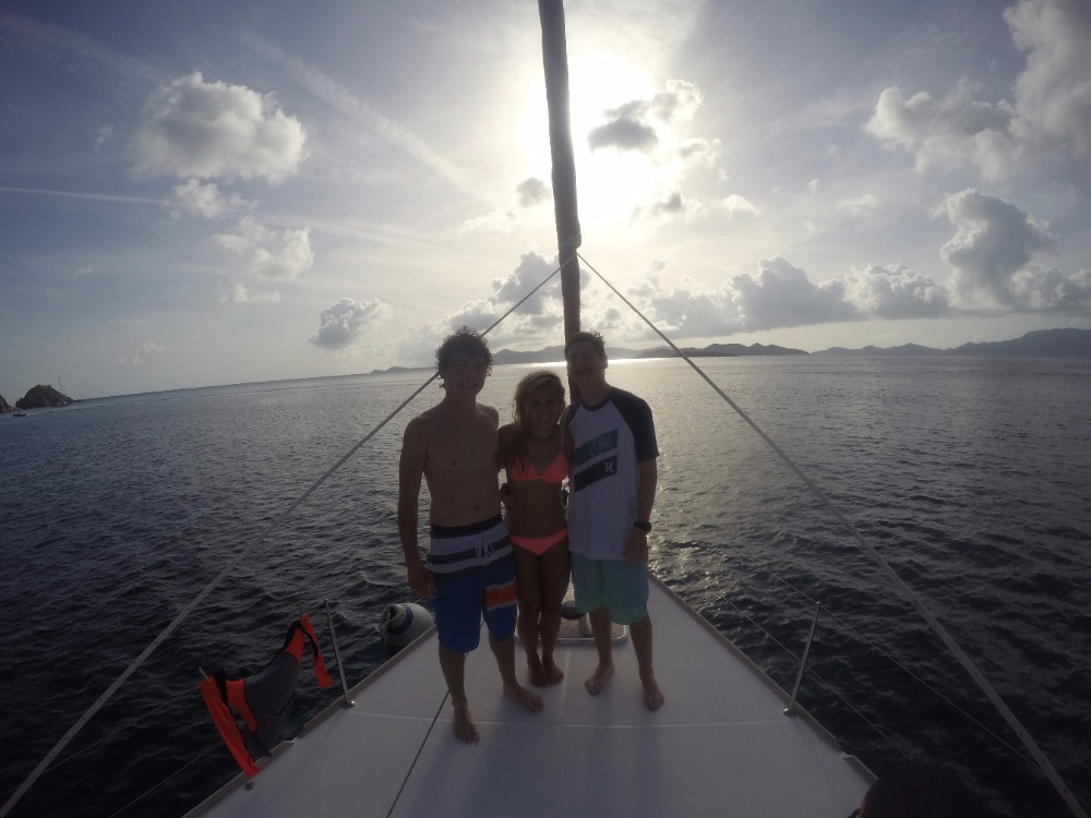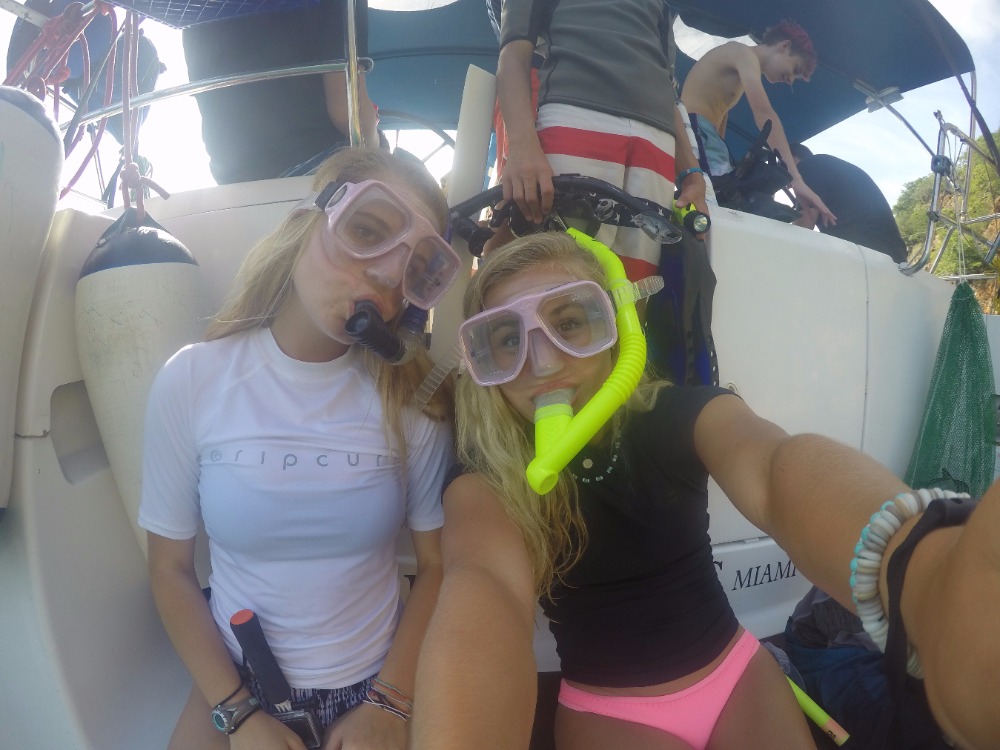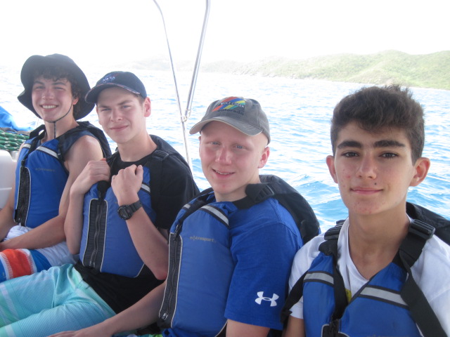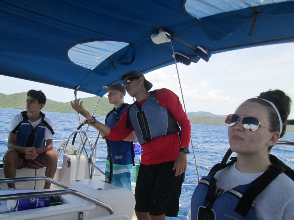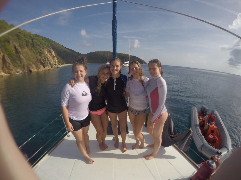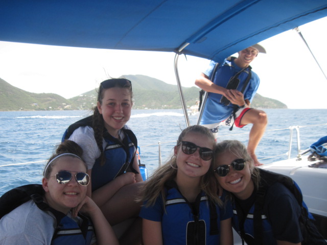 The day started around 5 o’clock this morning when an unsuspected cold breeze woke up most of the people who were sleeping on the deck in hammocks. We talked while waiting for the rest of the crew to wake up, and then ate a variety of cereals along with fruit for breakfast. After we cleaned the dishes, the director of AQ, Mike, explained to the whole program the basics of the trip and how to make it as memorable as possible. That took and hour, and then we shopped at the local grocery store for snacks! Yummy Oreos, chips, and more cereals now fill the extra galley storage compartment. Energy built as we all eagerly boarded our boats to head to the Caves on Norman Island. The sail over there was beautiful and took about 2 1/2 hours. Once there, we lathered on sunscreen, hopped in the turquoise ocean, and completed the swim test. Squeaky Brat made treading water for 10 minutes look easy! We swam for fun for just a little bit longer before snorkeling. The Caves were super cool because a school of tiny fish around our feet and lit up when we shone our flashlights on them. There were so many sea urchins too! Being underwater made the crew realize how awesome our trip is about to become. The ocean served as a giant bathtub as we showered tonight. Most of us dove in the water and were reluctant to get out. Dinner consisted of Sloppy Joe’s, corn, mashed potatoes, and salad. I felt at peace when another slight breeze flowed aboard the boat, and even more at peace while watching the evening sky become a canvas of pink and lavender pastels. Everything and everyone seems to be fitting into place, creating even more peace. A brief scuba chat awaits before sleep consumes us! We cant wait for tomorrow.