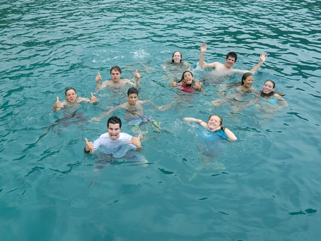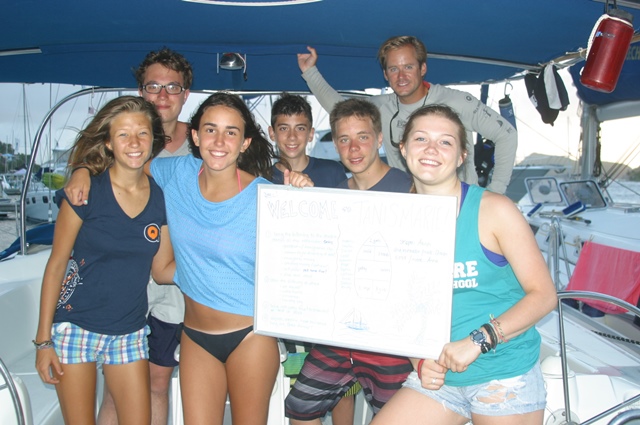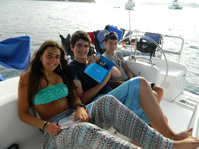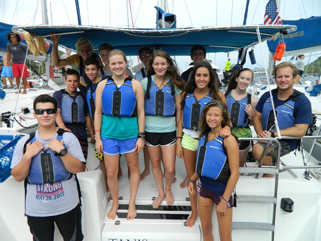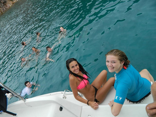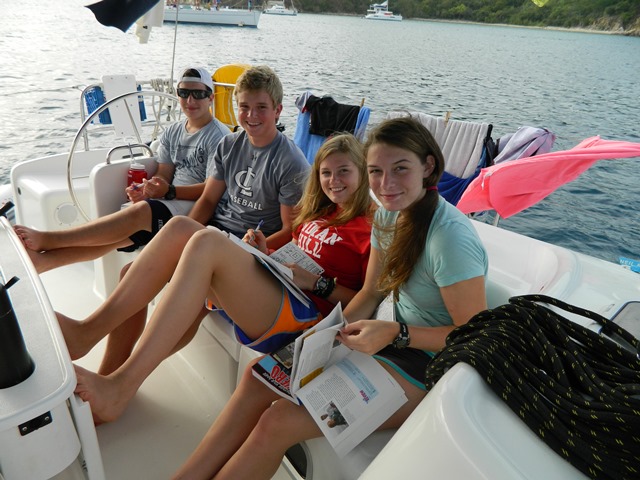 Today we finally departed from the dock! It was amazing to get out there and take in the scenery even though there was a bit of an overcast. We motored over to Norman Island to have lunch and take our swim test. The swim test consisted of 4 laps around the boat along with 10 minutes of treading; everyone passed! Later, we went snorkeling in caves with rumored lost treasure which we eagerly searched for, but had no luck. We came back to our boat to take our first shower. It was so refreshing!! Then we prepared for dinner and had our night squeeze question, “What are you most looking forward to on the trip?” A lot of us had the same answer such as scuba diving, sailing, making new friends and the beach parties! Tonight we had our first dive chat: one step closer to earning are certification! Well, that’s all for now!