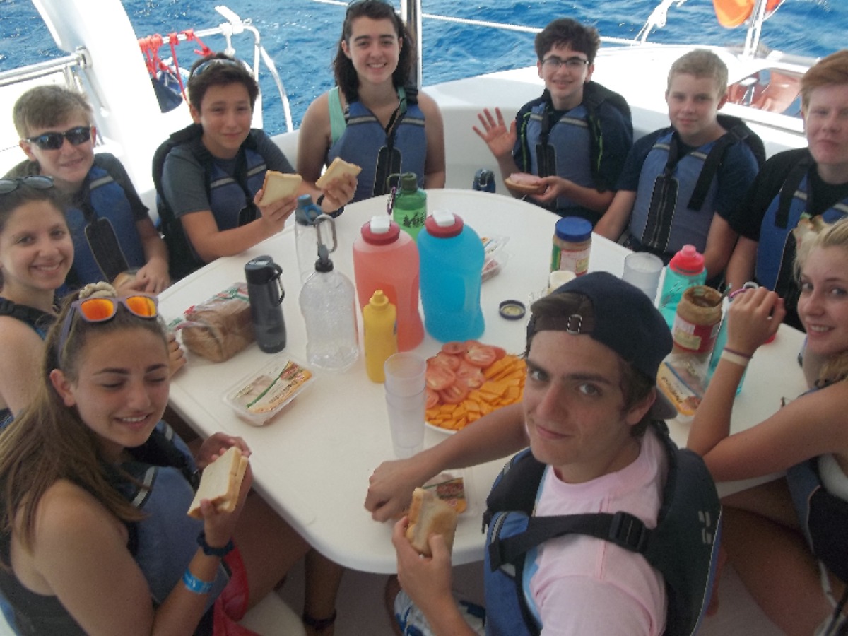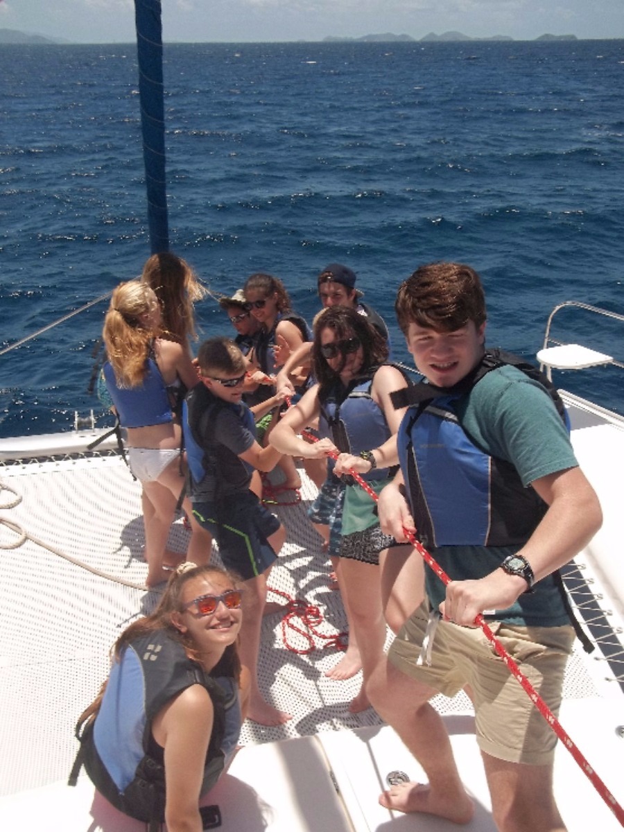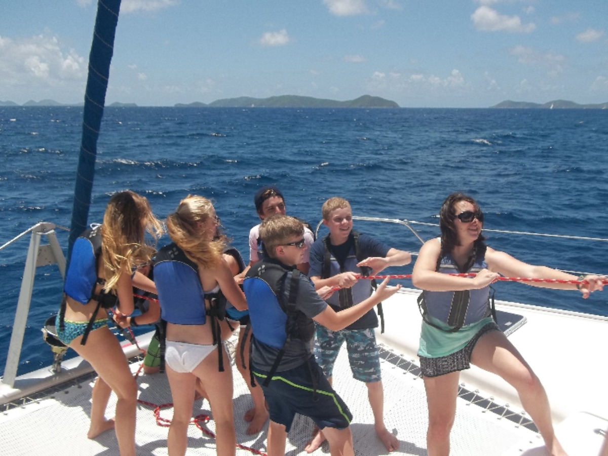 Today was the first full day of AQ! Today we woke up on the dock at West End, ate breakfast and had a long dock talk about rules and expectations. After that we set sail for White Bay on Peter Island. During the journey, friendships grew stronger, and all the shipmates worked as a team for the first time. We went over knots, sailing information and expectations for safety on the boat. When we arrived at White Bay, we jumped into the gorgeous clear blue water to start our swim test. This consisted of 6 laps around the boat, and 10 minutes of treading water. When we finished the swim test, we went to the bow to review scuba gear. Then we got our scuba gear together and put it on the safety rails. After that we went to the stern, and went over what we were going to do while underwater. Since this was our first dive, we reviewed skills and got back in the mode of scuba diving. We took showers after the dive, changed and got ready for dinner! The boat already feels like home, and the shipmates already feel like family! It’s a blast! P.S. Shoutout to the fam: Brooksie, Moe, Dani, and Tay… and Rocket!