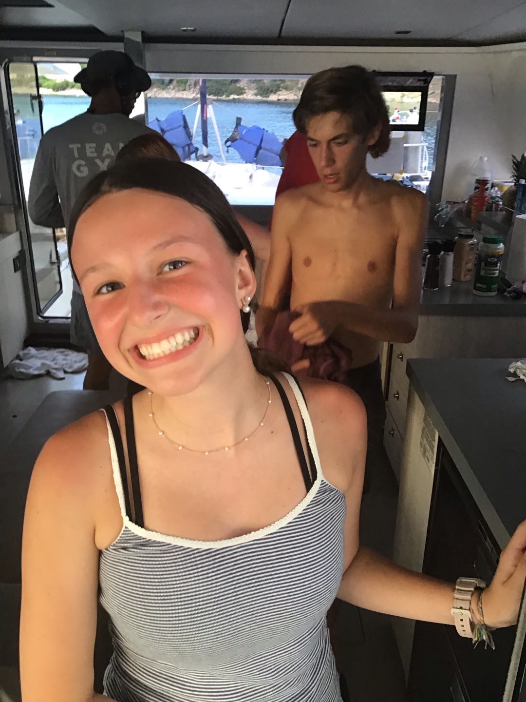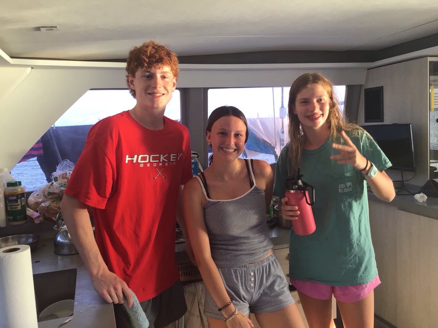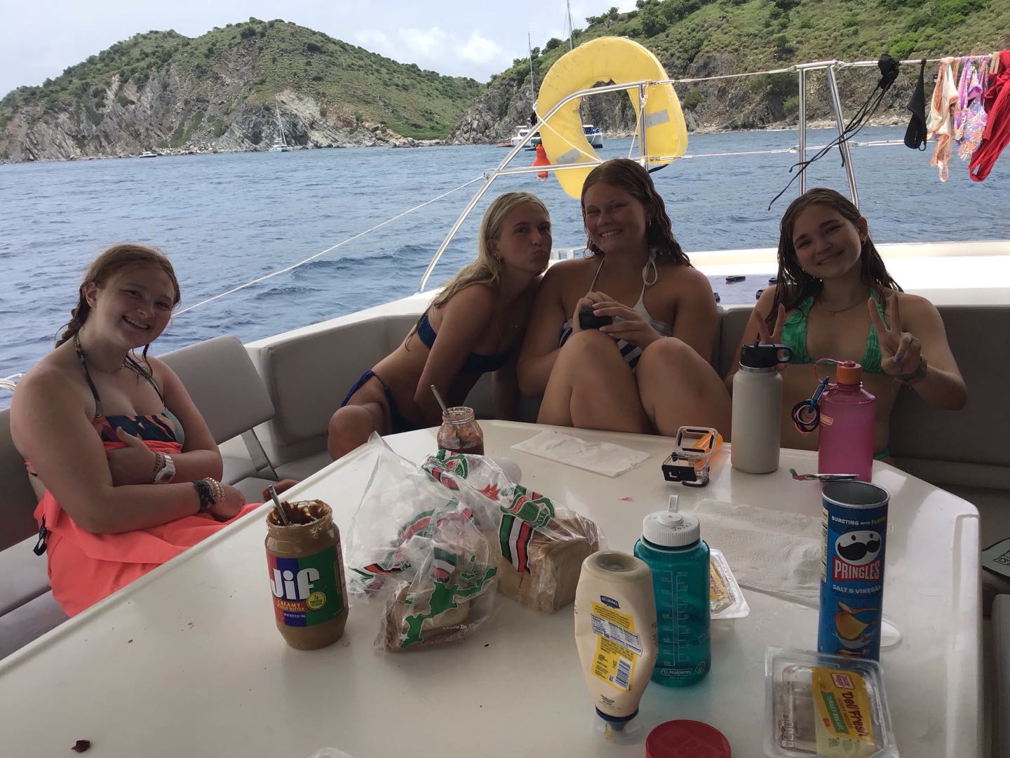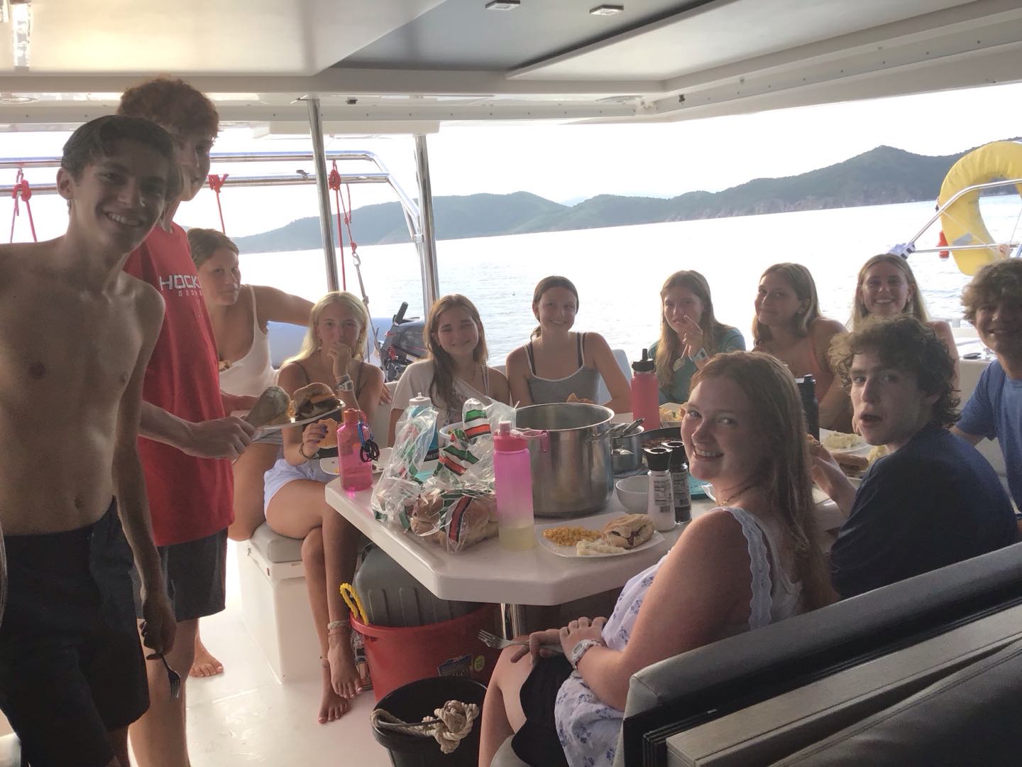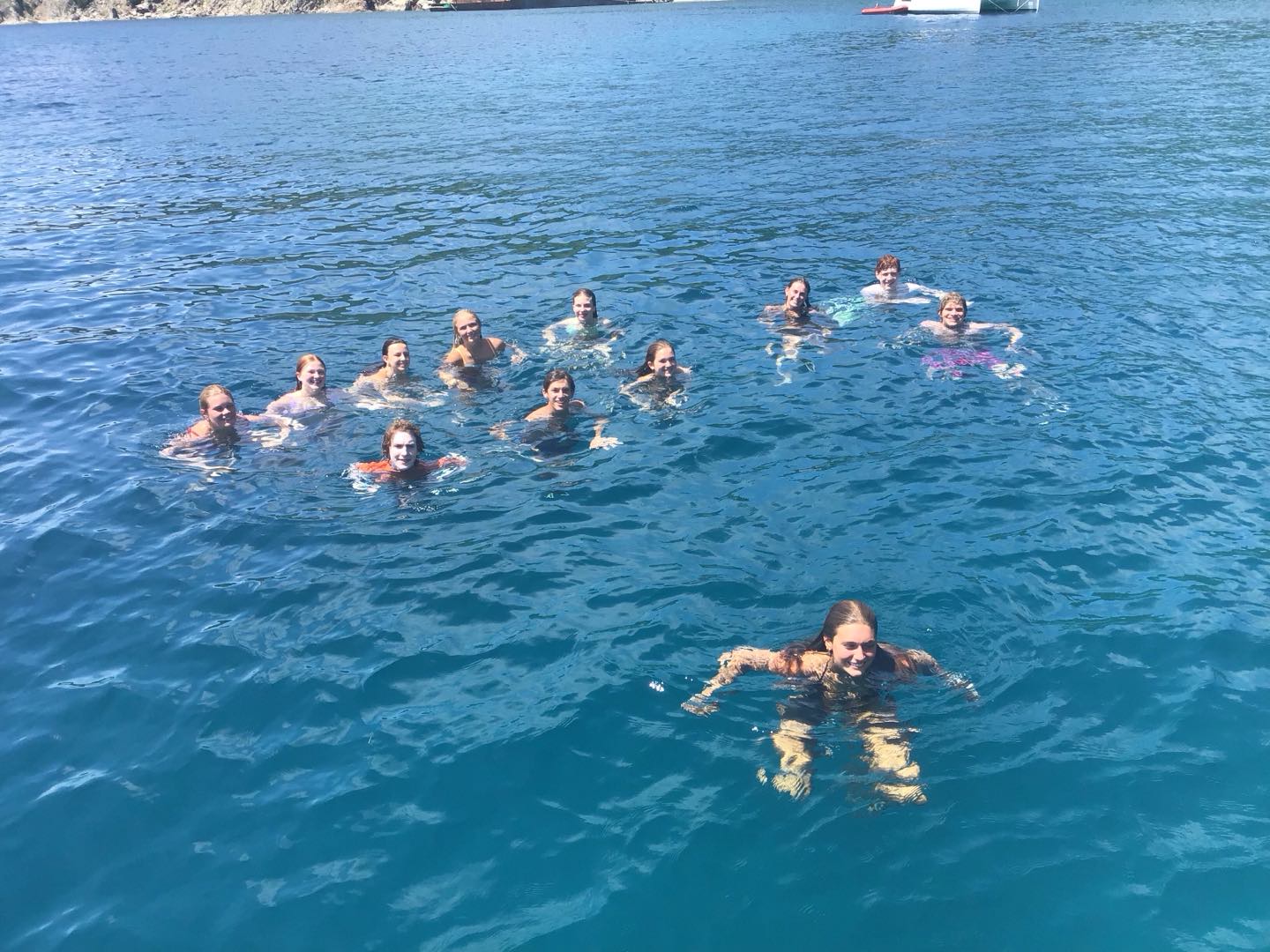 Today, we started the day at 6 am and made breakfast. We ate bagels and yogurt, and we got underway. We sailed to Blue Chromas, and then we scuba dove for 45 minutes at a max depth of 42 feet. We played underwater games and saw trumpet fish and made bubble rings with our mouthes. After that, we made lunch of PBandJ’s or leftover deli sandwiches we sailed to Savanna Bay and water skied, kneeboarded, or wake surfed. We took turns going on the dingy boat in groups of 5, and when we weren’t on the dingy boat, we jumped off the boat and swam, and all took saltwater showers. We are making dinner cheesy hotdog alfredo pasta with the boat next door, and then we are all talking and going to sleep.