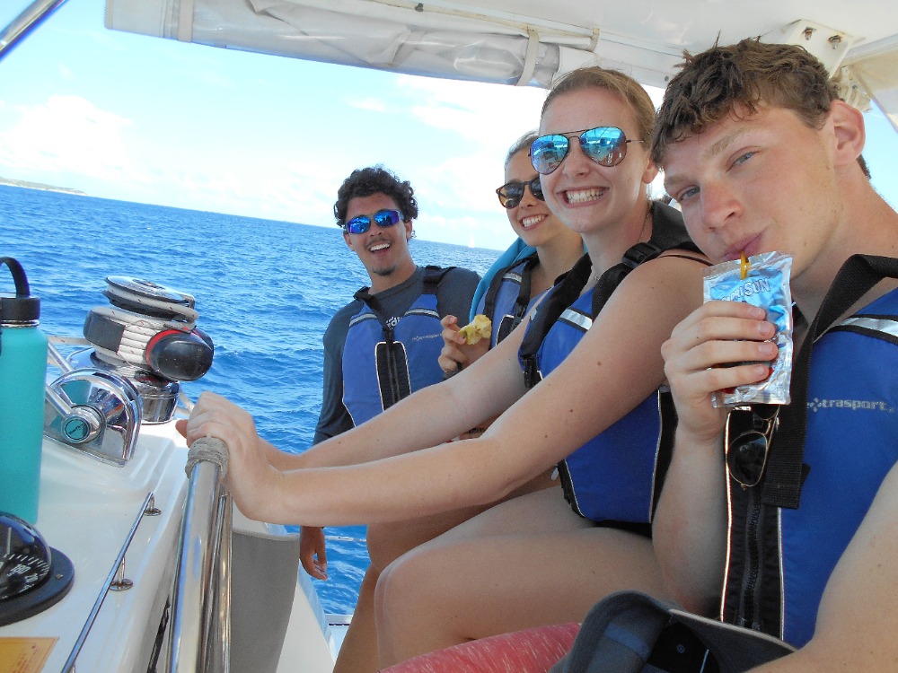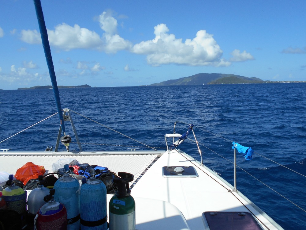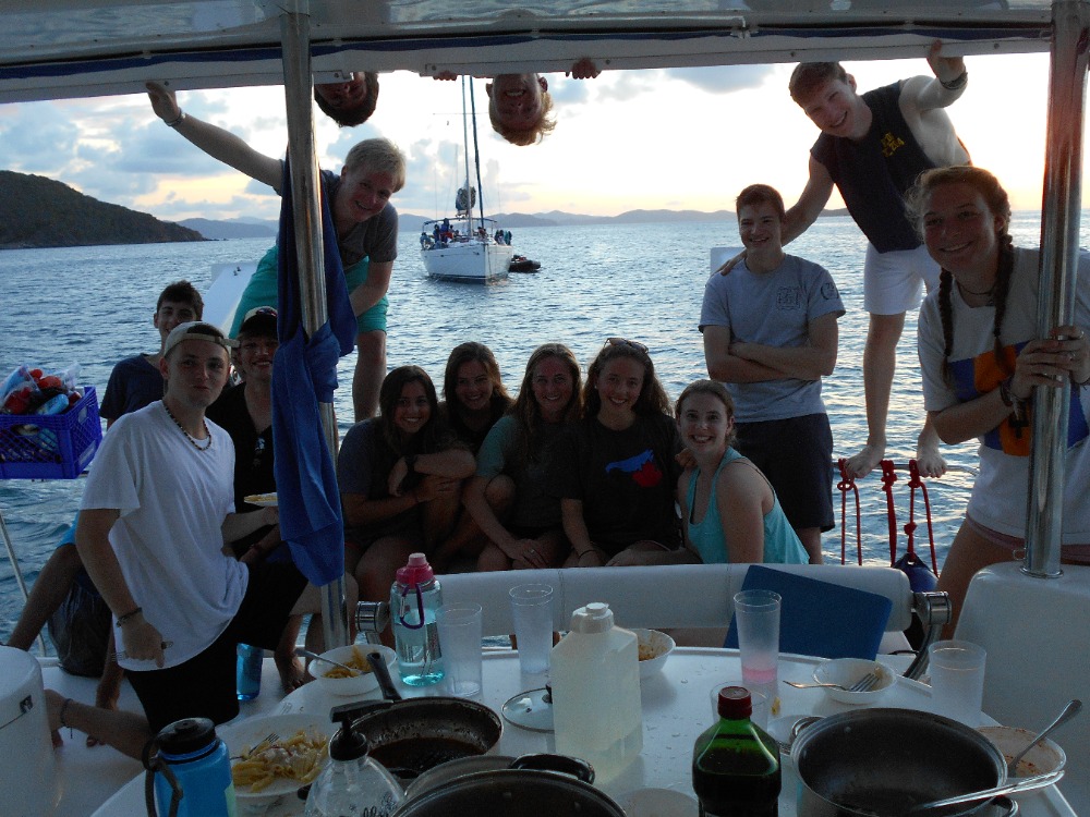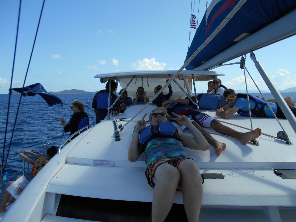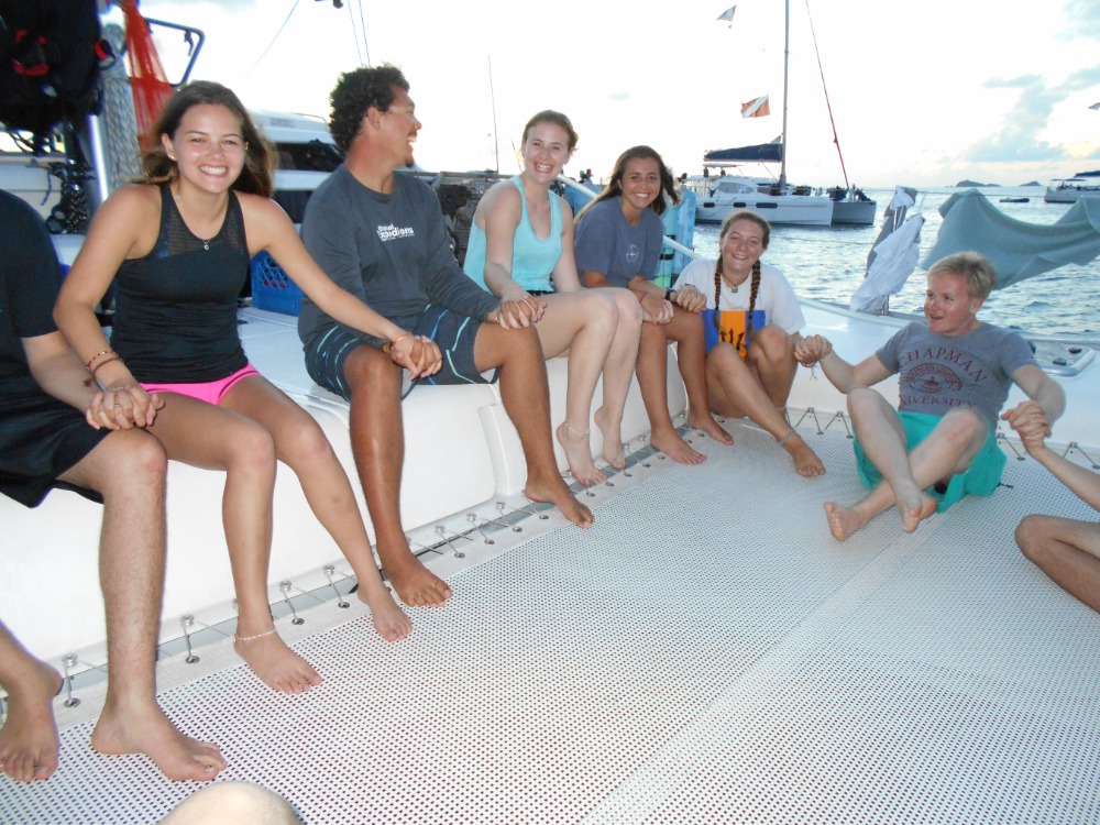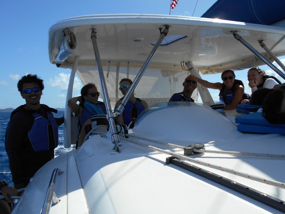 This morning we awoke in the Bight at Norman Island. Jared and Julianna cooked us a wonderful meal of eggs and muffins for breakfast. Then we all worked on our knowledge reviews for our divemaster certifications. Most of us finished the chapters due that day before we hauled up the anchor and set off for Ginger Island. Mid-sail our instructors surprised us with a stop at the RMS Rhone. Before we jumped in the water we practiced demonstrating setting up gear as we entered the water off the boat. The conditions at the dive site today were sublime! Great visibility and no current! As Jimmy, Emily, Hannah, JJ, Jules and I exited the swim through at the bow we encountered quite a large sea turtle that we followed around for a bit before it disappeared into the abyss. The other dive group encountered a large barracuda at the stern swim through. I surfaced from this dive in a blissful state knowing that that dive was probably one of the better Rhone dives I’ve ever experienced. After sandwiches for lunch and pumping tanks we set sail for Savanna Bay, Virgin Gorda. Everyone enjoyed a relaxing sail listening/singing along to some of the music. After a big of a snafu with our windlass we hopped in the water one more time to practice our diving skills (at demonstration levels) so we can help teach some of the younger students on Vega. After shower time everyone enjoyed some down time as we made Alfredo for dinner. Now we are about to start one of our many dive chats. I’m sure we will all sleep tonight!