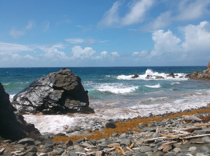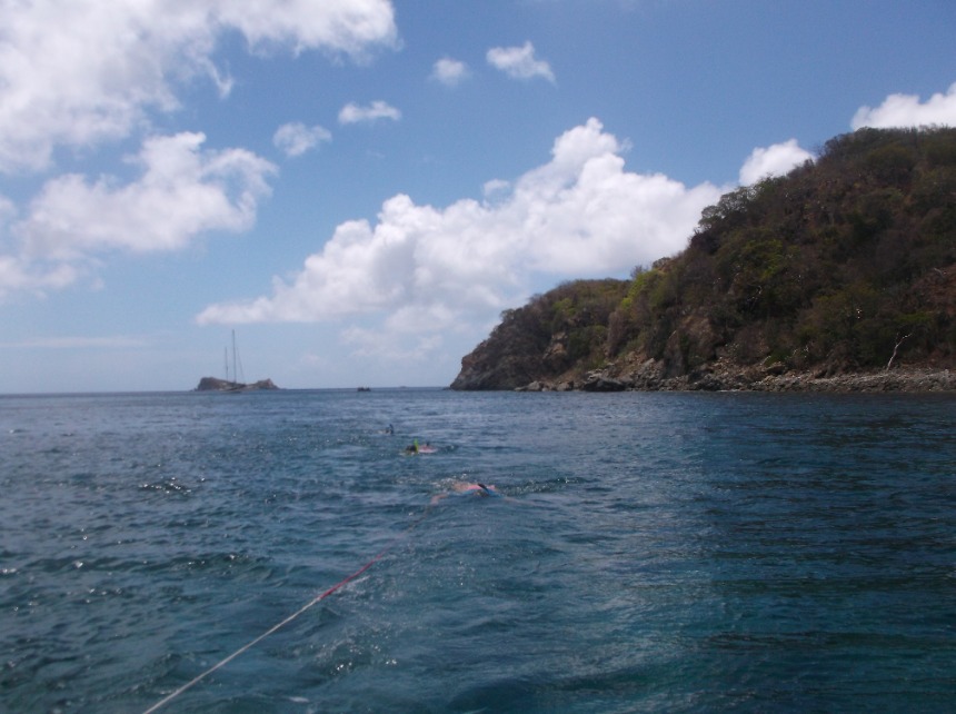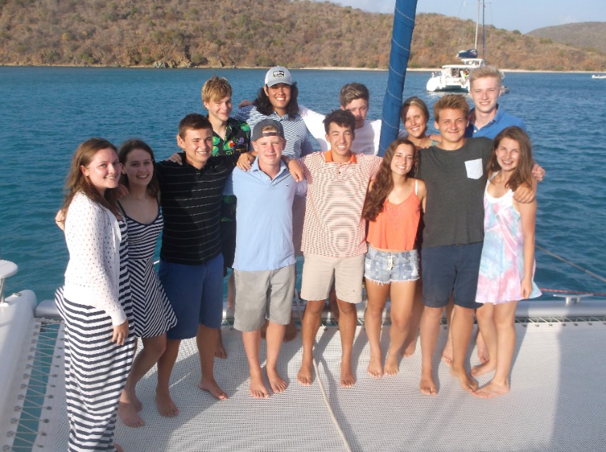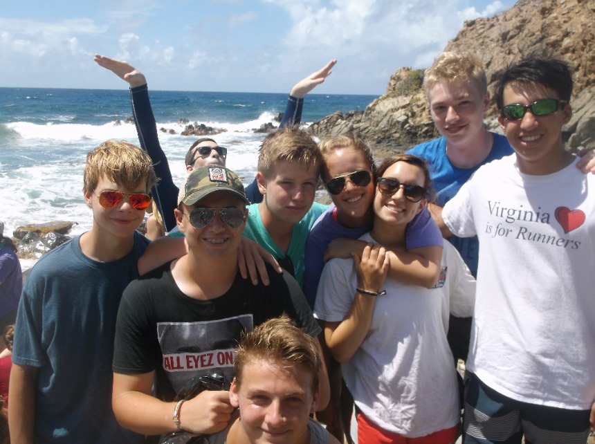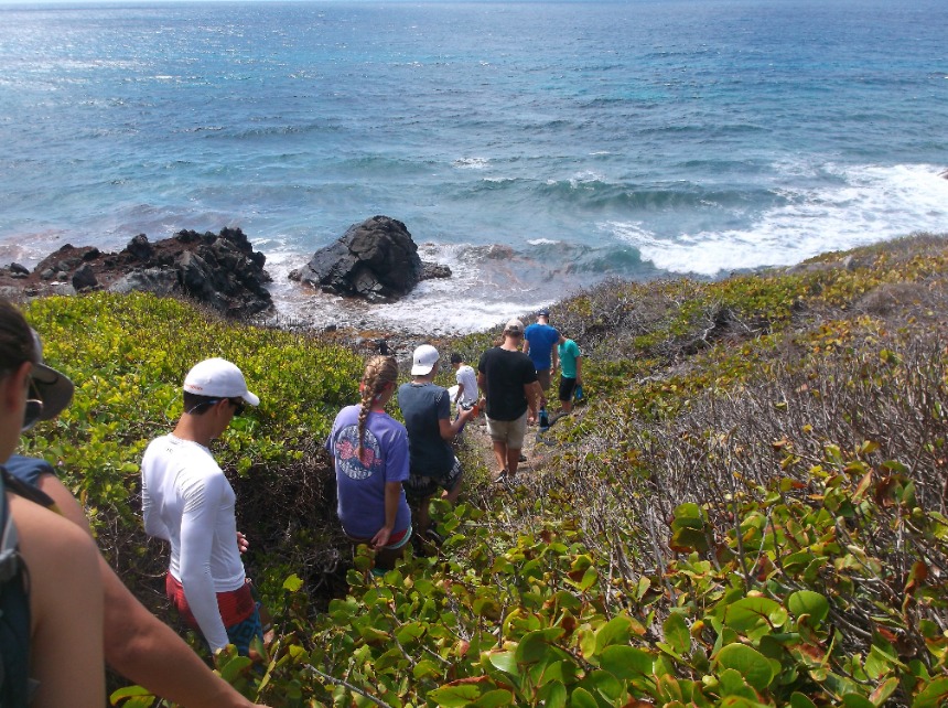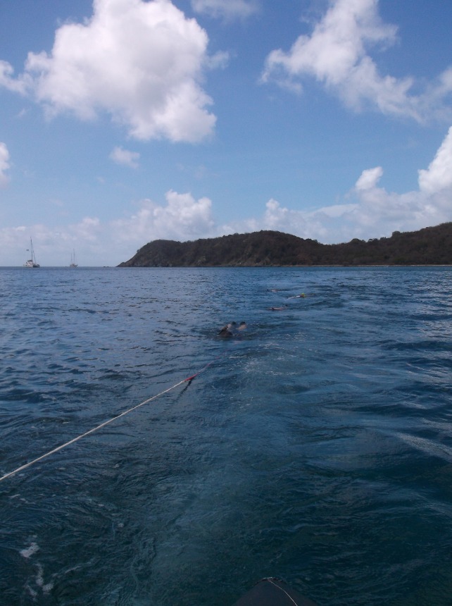 Today was a great day to catch up on some sleep, waking up at a rare 8 am. After we finished our delicious breakfast of pancakes and fruit, we headed for a hike up to Savannah Bay’s windy side. We took in the sights while talking about where our trash goes and finished with a group beach clean up. Once we finished our hike, we took our time making a hearty lunch of mac and cheese. After lunch, we headed to Mountain Point to get a lesson on turtle tagging. Once Elliot and Beezie gave their instructions, we headed out as we were dragged behind dinghies in snorkel gear to search for the elusive sea turtle. Unfortunately, we spotted one but were unable to catch it. For dinner, we headed to Vixen Point in Gorda Sound for a beach BBQ with the ActionQuest fleet.