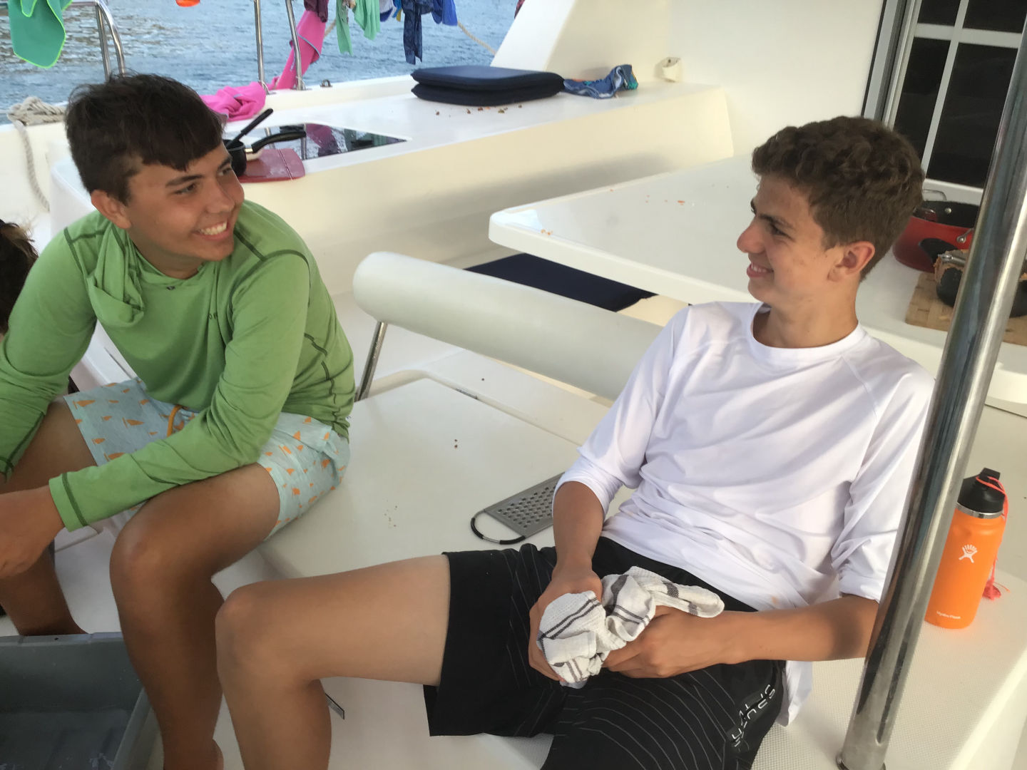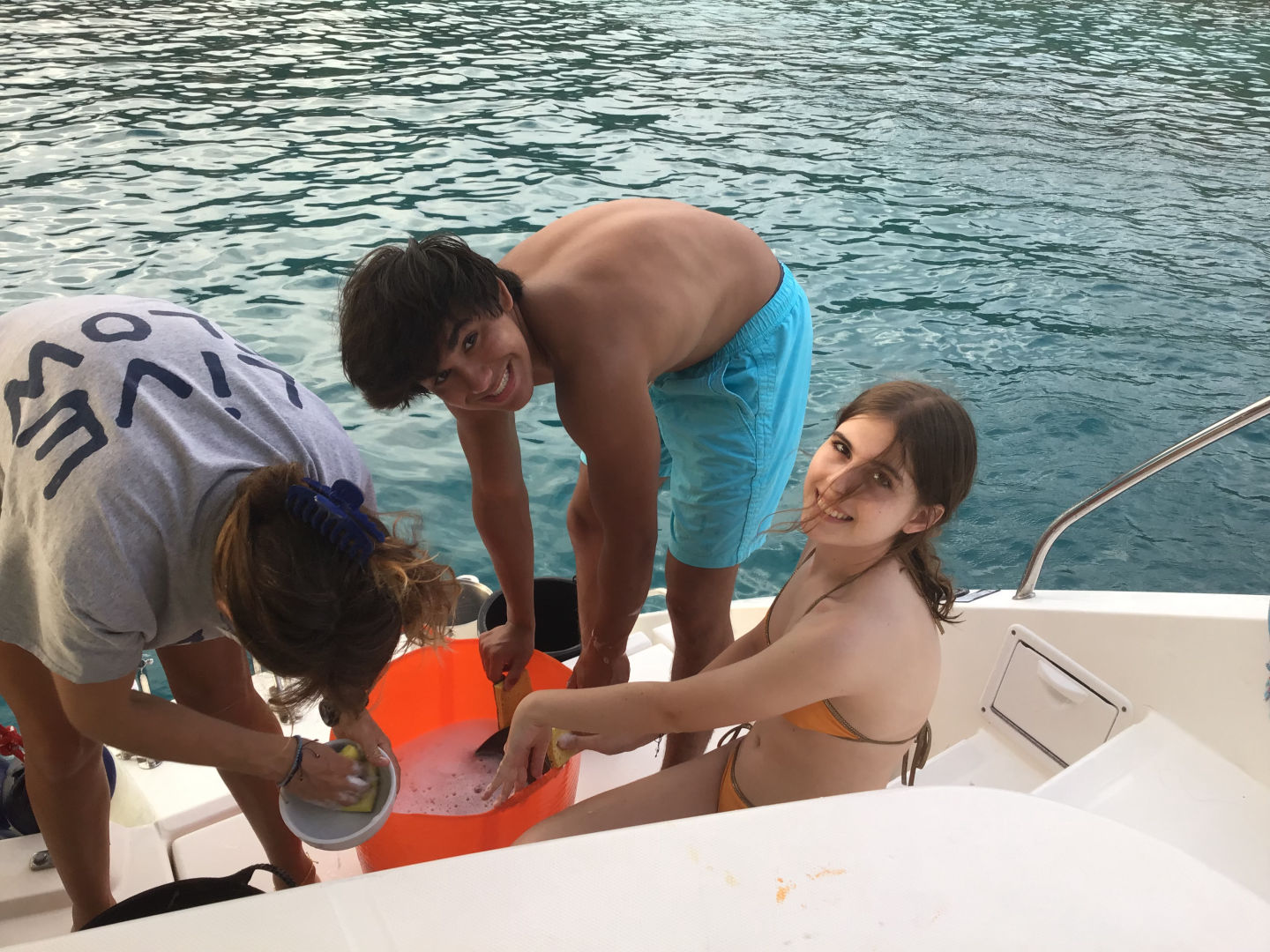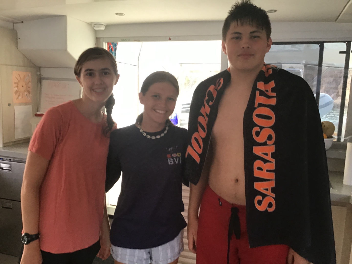 Today we woke up to the lovely sounds of the Lion King soundtrack, followed by the rest of our Disney playlist, and of course, I was the last one out of bed. We were up early and off to a new dive site after a breakfast of yogurt and bagels. I thought nothing would be able to match the unique beauty of the mangroves, but today’s dive site has to be my favorite so far. We dived at a dive site called ‘the wall.’ The wall had beautiful walls of coral. Mara and I saw a pretty big lionfish chilling on the reef! After that, we sailed across the bay to anchor for the night. Josh, Dylan, Daisy, and Lizzie went on the dingy to go kneeboarding before dinner. Dinner was burritos and was surprisingly good! Today was another amazing day! Miss you, Mom and Dad (and all the rest of my siblings).