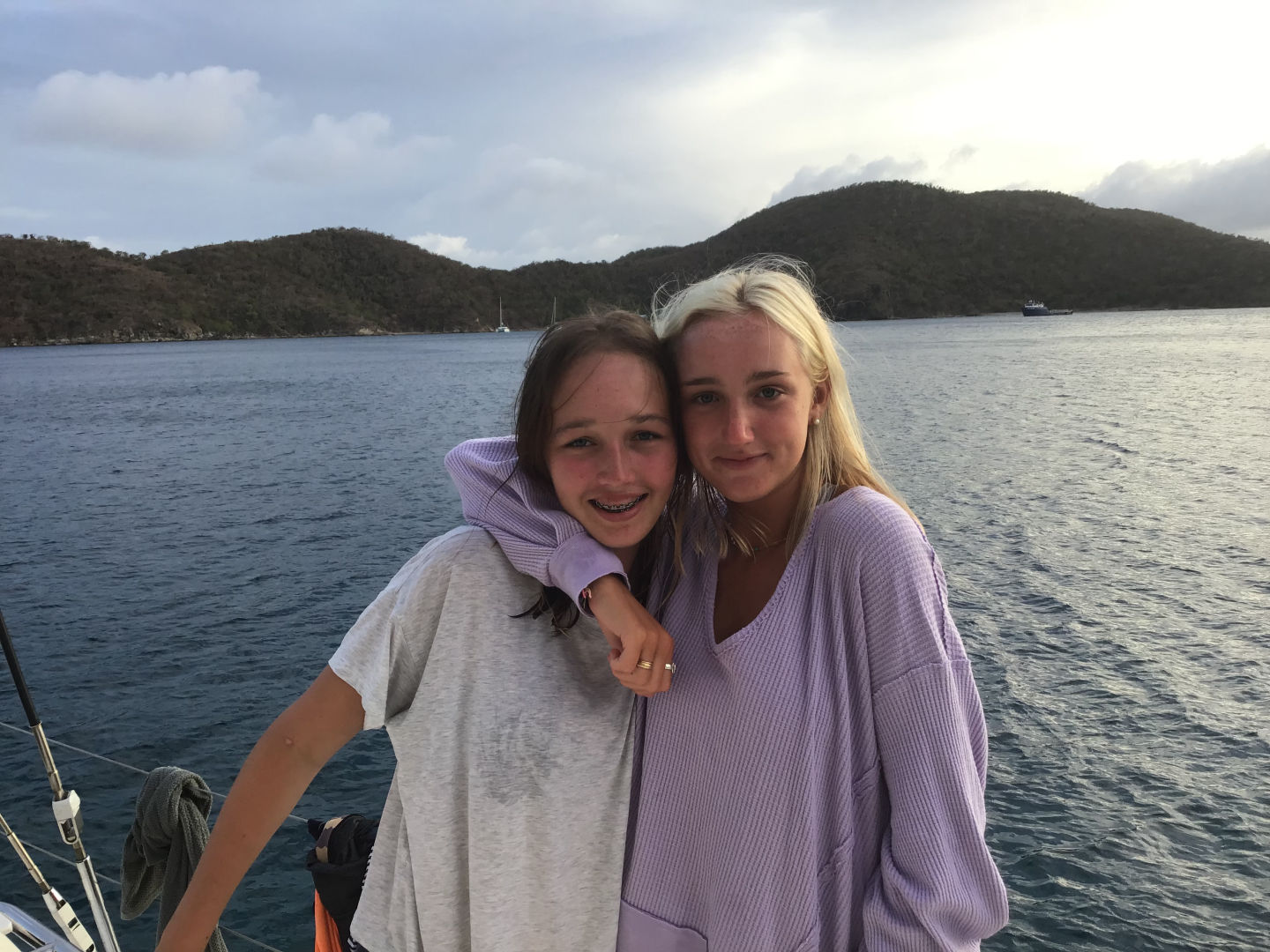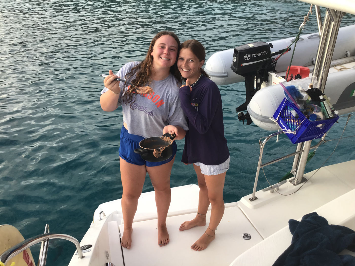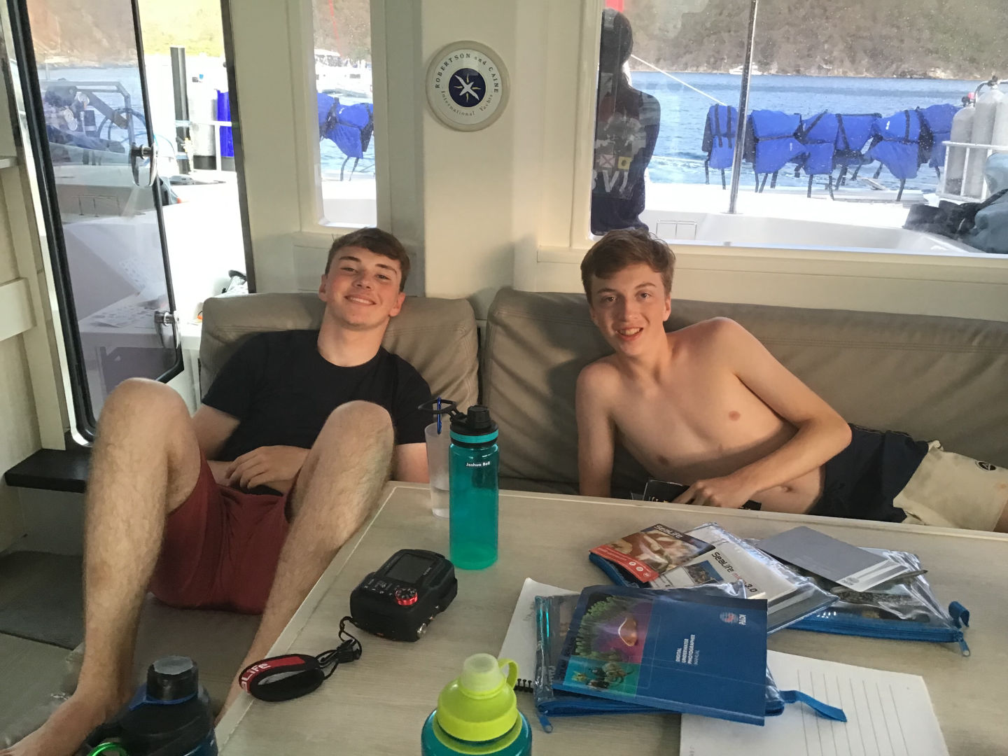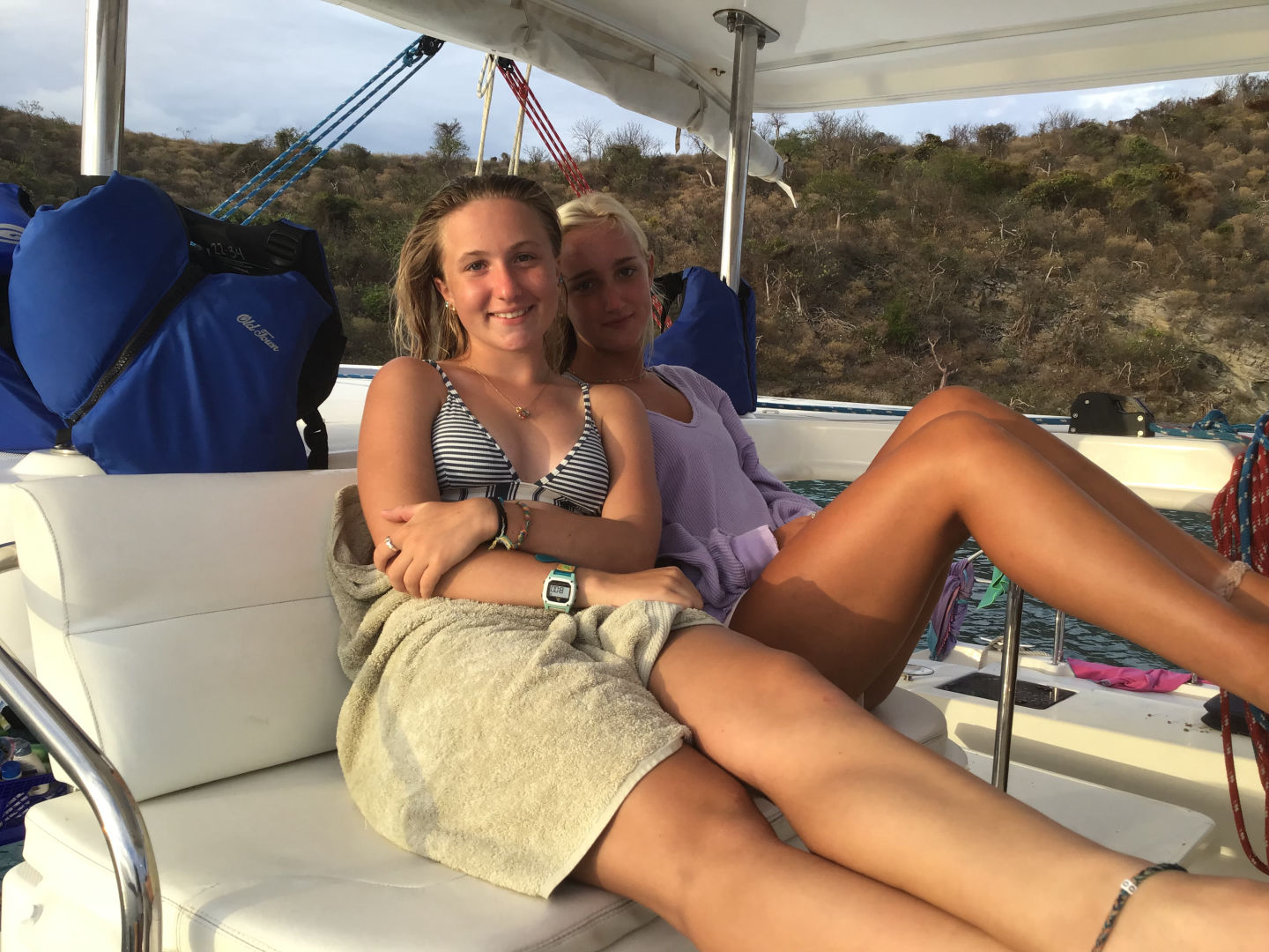 Today we woke up to the lovely sounds of the Lion King soundtrack, followed by the rest of our Disney playlist, and of course, I was the last one out of bed. We were up early and off to a new dive site after a breakfast of yogurt and bagels. I thought nothing would be able to match the unique beauty of the mangroves, but today’s dive site has to be my favorite so far. We dived at a dive site called ‘the wall.’ The wall had beautiful walls of coral. Mara and I saw a pretty big lionfish chilling on the reef! After that, we sailed across the bay to anchor for the night. Josh, Dylan, Daisy, and Lizzie went on the dingy to go kneeboarding before dinner. Dinner was burritos and was surprisingly good! Today was another amazing day! Miss you, Mom and Dad (and all the rest of my siblings).