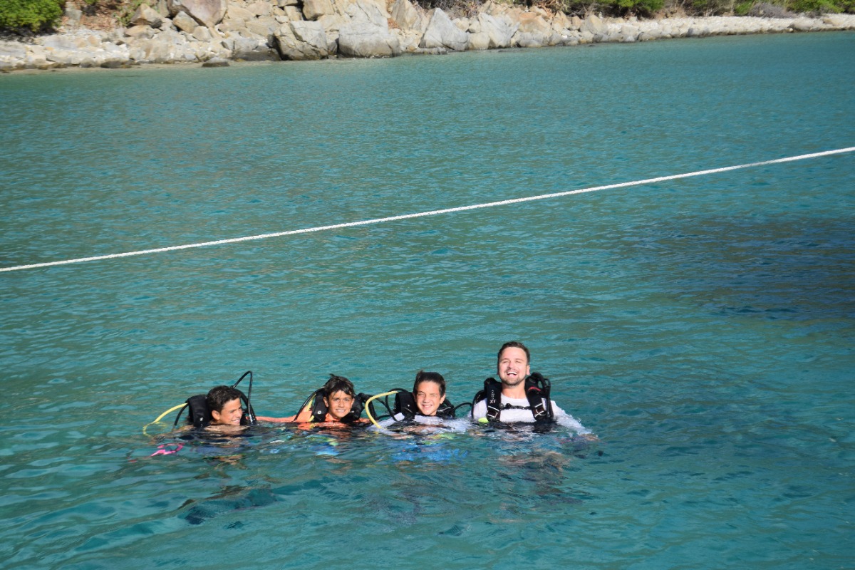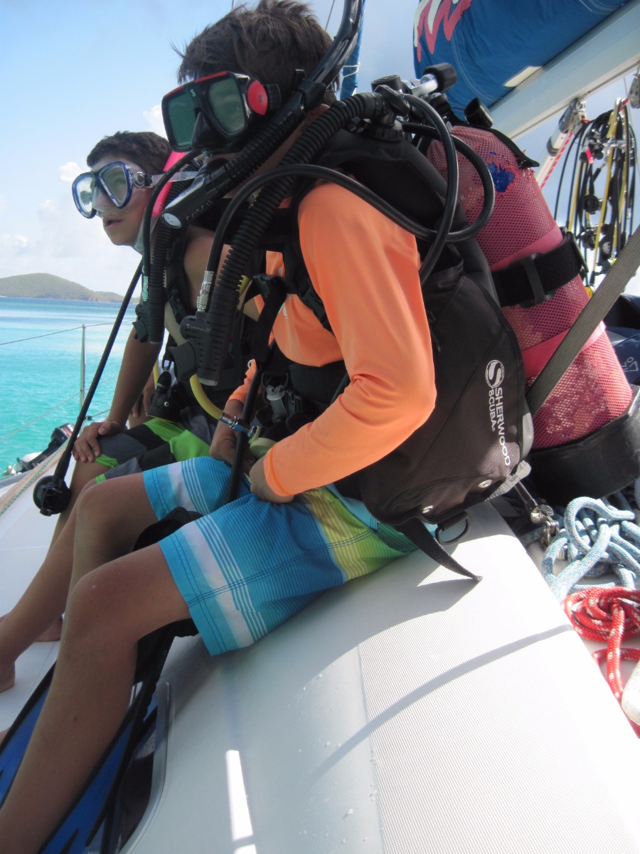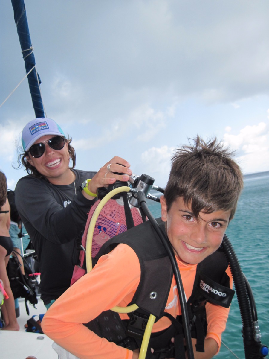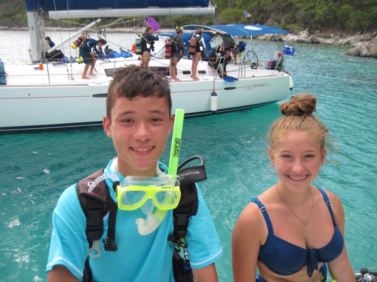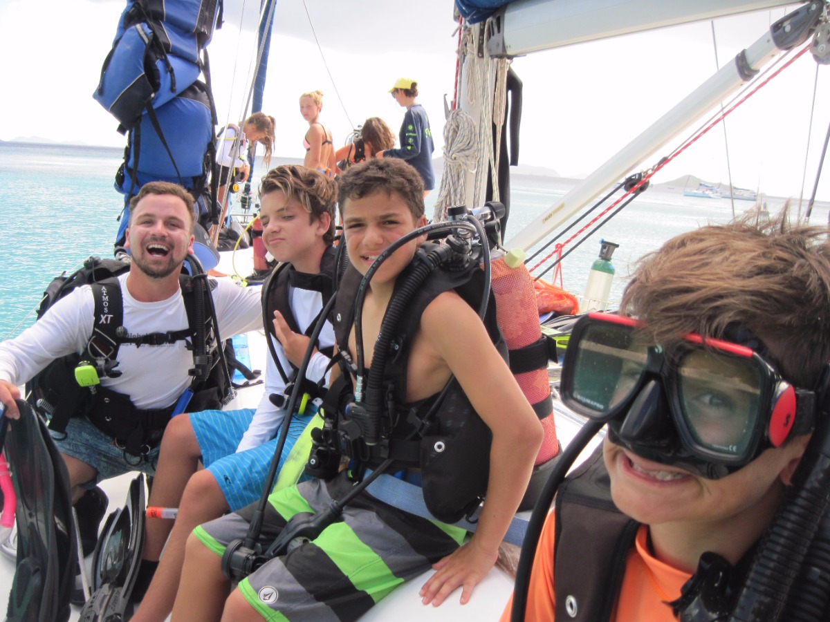 At 8:00 am, Jess and Fritz guided us on how to tack and jibe with the jib all by ourselves! Although we were an hour late for practicing this because of breakfast, we still had a lot of fun. After that, Jess taught us types if ships, formations of lights and what different types of buoys mean. Once we were done with that, we had Tuscan White bean soup for lunch. After lunch we went to go practice scuba diving, it was very fun. We learned many ways to assist divers when they’re distressed, how to help yourself when you’re in distress and how to put back on your gear if it falls off underwater. Once we were done with diving we came back to the boat to find out that we didn’t have to do any more sail chat! Instead of class we all got to sit out and go swimming and review knots that we have been learning for the past couple of days. After hanging out for two hours, we had chicken Caesar salad and rice for dinner. Wondy and Fritz made most of the dinner and it was delicious! After dinner we had the squeeze, which is an activity we do after dinner. The question I asked was ‘If you only had day to live, what would you do?’ In the squeeze, everyone holds hands and answers the questions. Overall was an extremely fun day, scuba diving was my favorite!