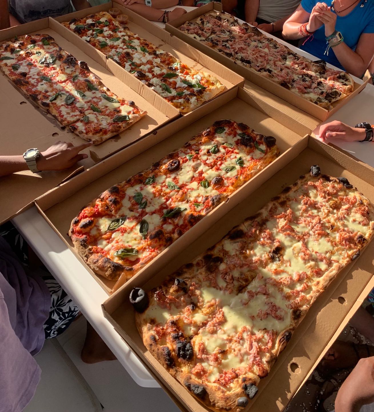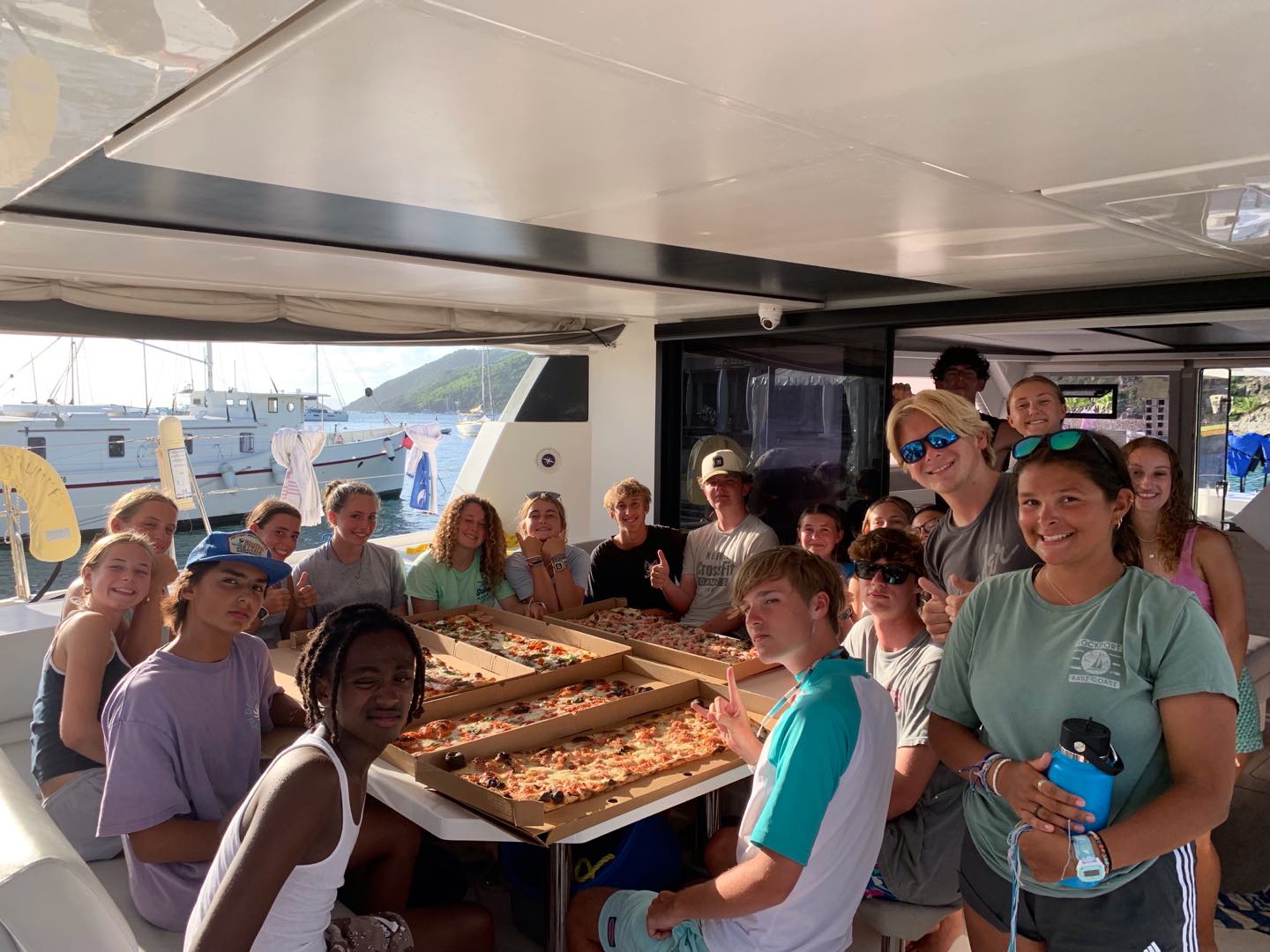 At this point in the day, it was time for dinner. We had a nice treat of pizza for dinner, and it was a combined boat dinner, so everyone was on our boat, which is always entertaining and chaotic. The pizza was so good and a nice treat after a busy day. After dinner, we did a group squeeze, which ended with one of the boys from Frenchie being challenged to eat the last seven slices of pizza. During this challenge, we were told that we were going to go out and get ice cream from this one ice cream shop that had been hyped up all trip. Let me just say it lived up to the hype and was very good.