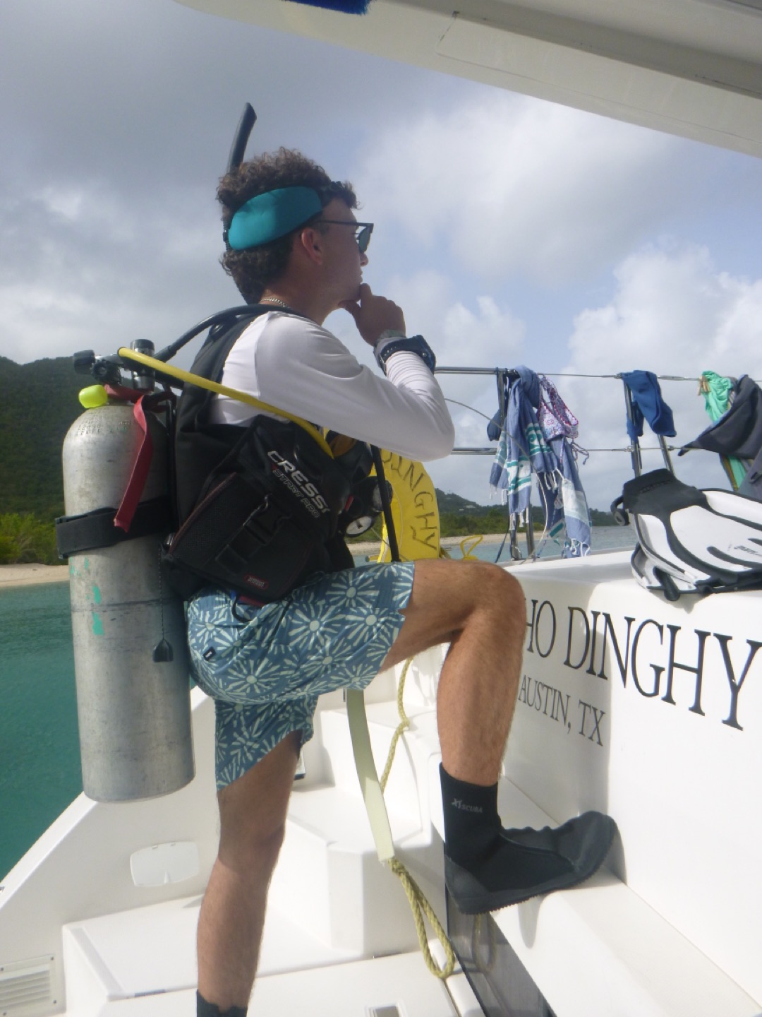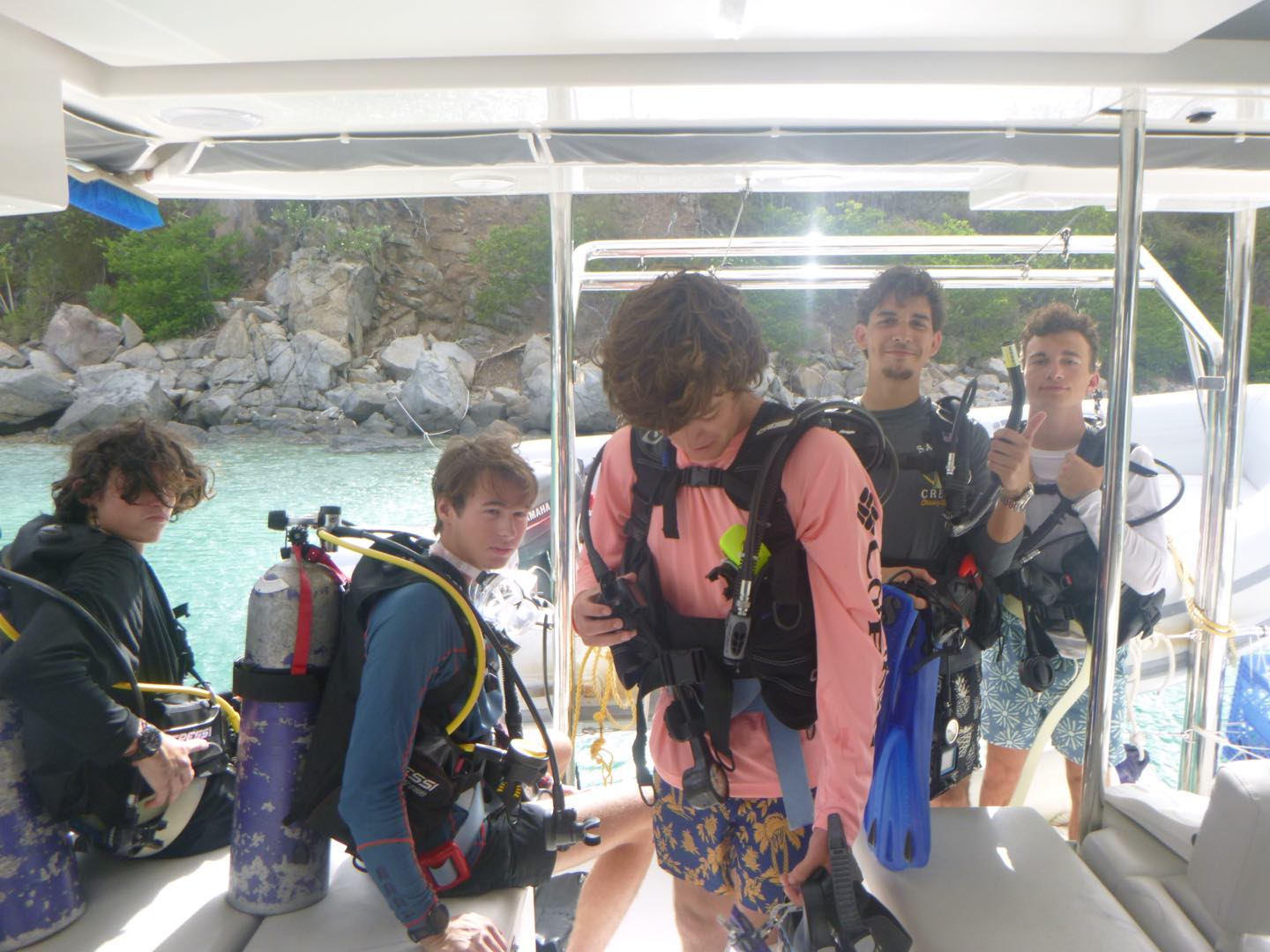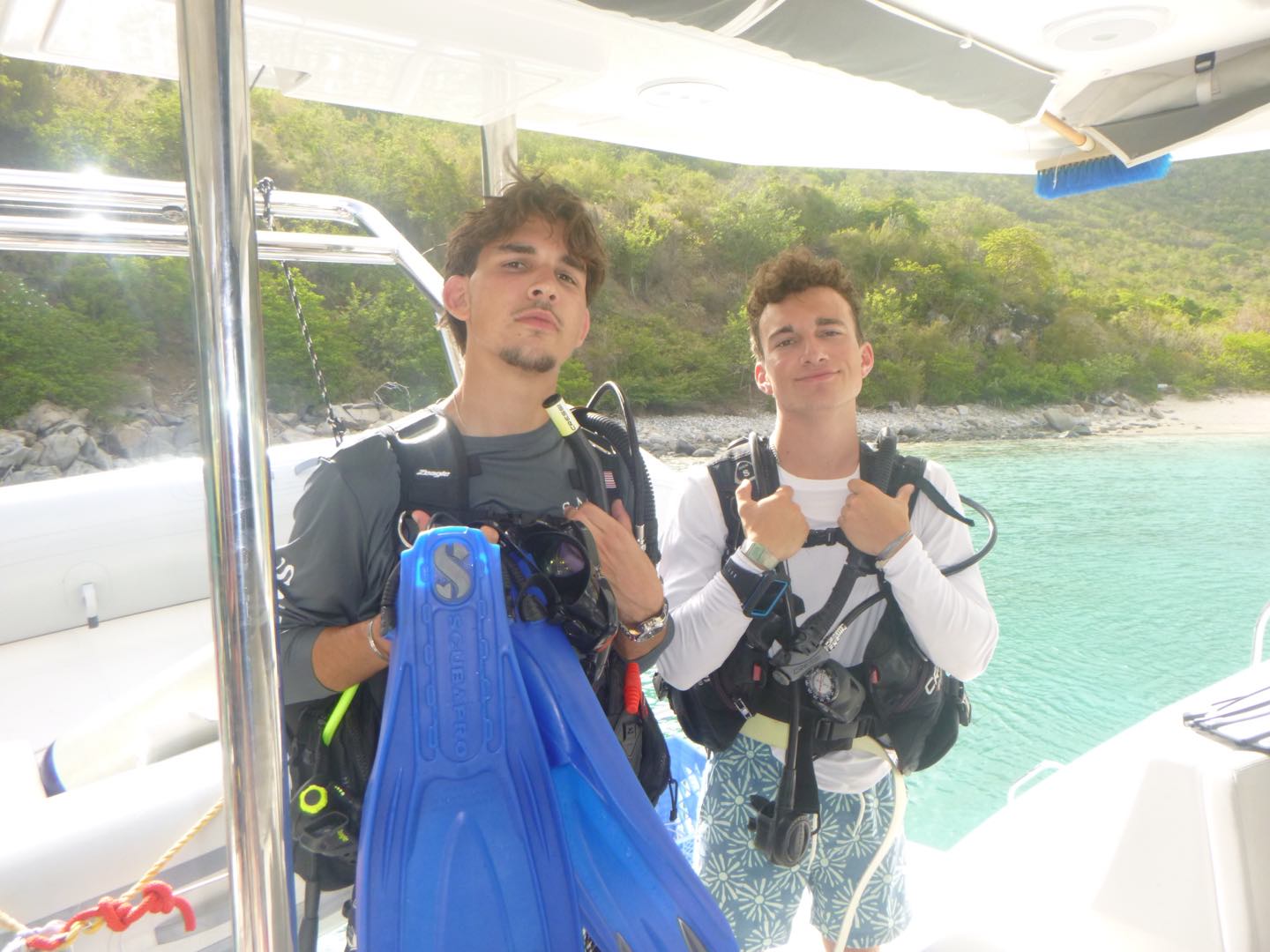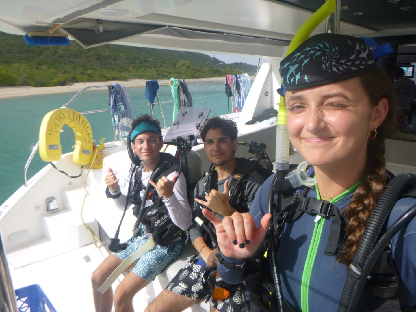 Lila, Tyler, Avi, and I kitted up and swam over to Hope, our neighboring baby boat, to help them learn how to dive.