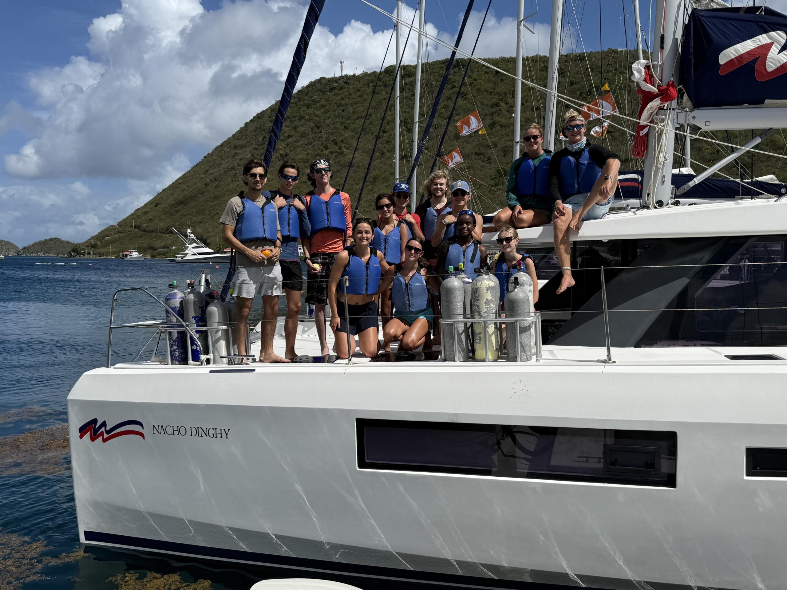 After all of our diving, Aggie, Lily, Juliette, and Alli learned the essential sailing knots. The divemasters were forced on a 400-meter swim with Alex winning in 6:56 minutes. We were cooked after this๐