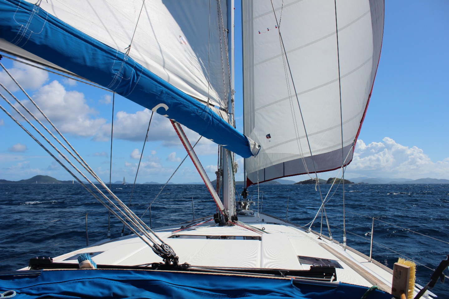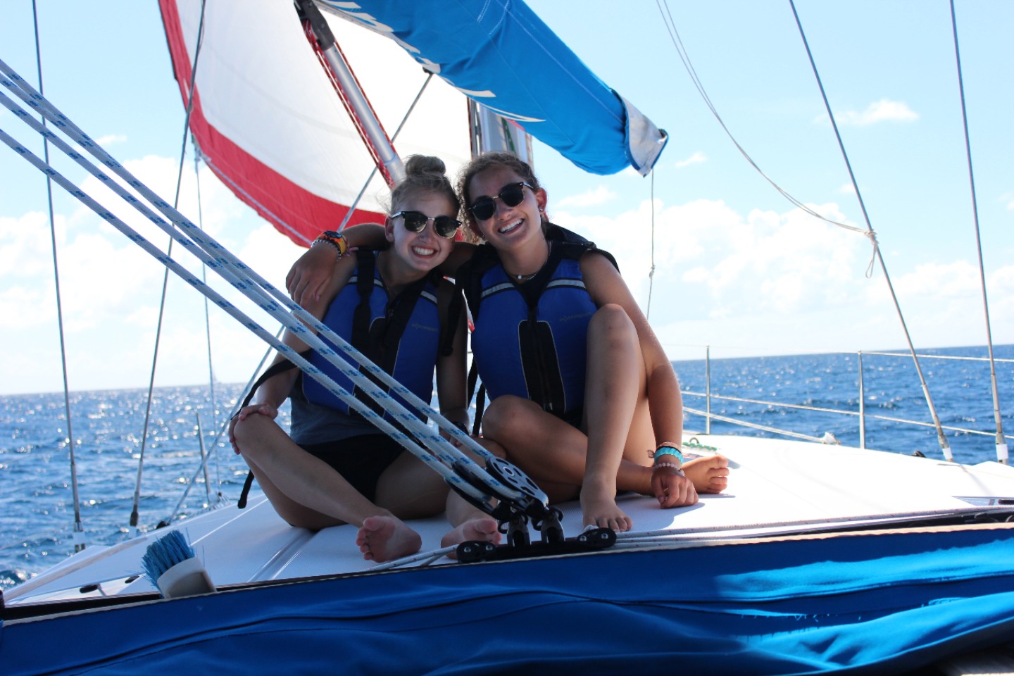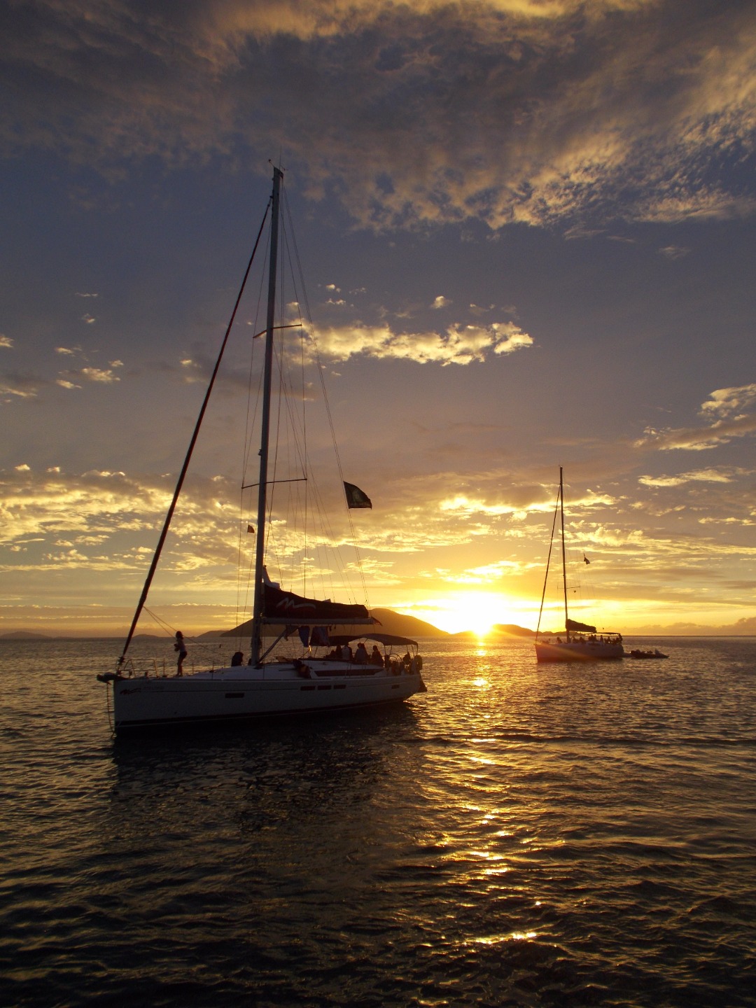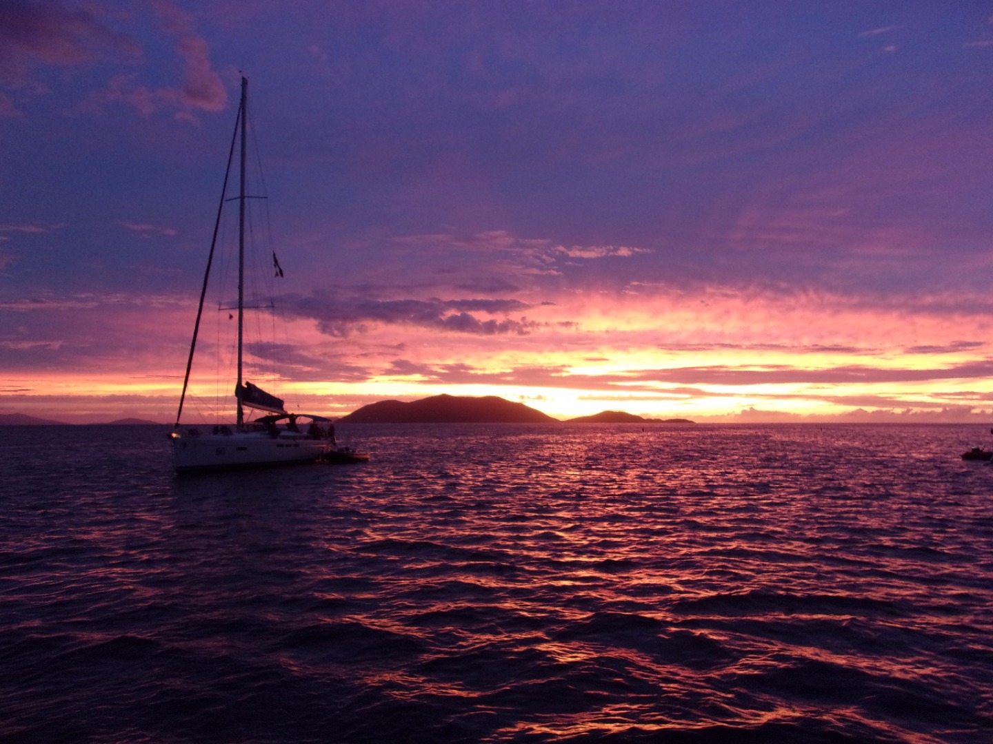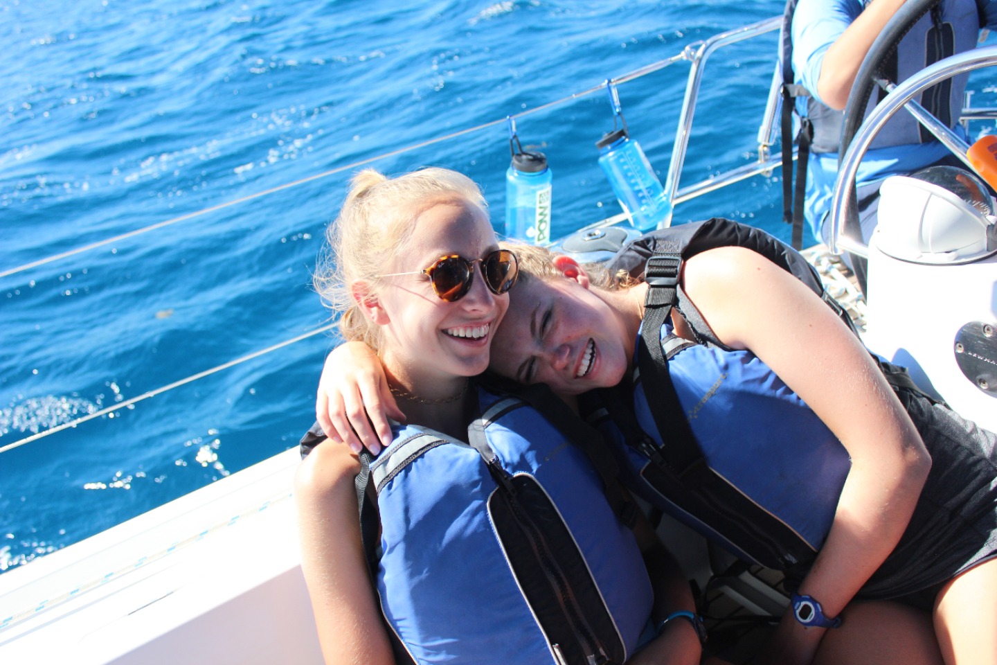 We had a bit of a late start this morning as we cleaned the boat and prepped to sail for the day. As we raised anchor we motored out of the bay and began to sail. Not too long after we put the jib up, we noticed a huge storm right ahead of us. We put on our rain jackets and prepared to sail through the storm. Bella took the helm and steered us safely through it, while the rest of us attempted to keep our balance on deck and stay dry. After a lunch, we got more water for the boat and took fresh water showers. Then we anchored at the place we would be staying that night. While we were getting dinner ready, we saw some dolphins swimming right next to the boat! We all scrambled up on deck and watched in wonder as they swam by. Following a delicious dinner of Thai peanut chicken, we saw even more dolphins at the bow of another boat. Accompanying the sight of the majestic dolphins was the most beautiful sunset we have seen all trip. We are all looking forward to the “longest day ever” tomorrow!