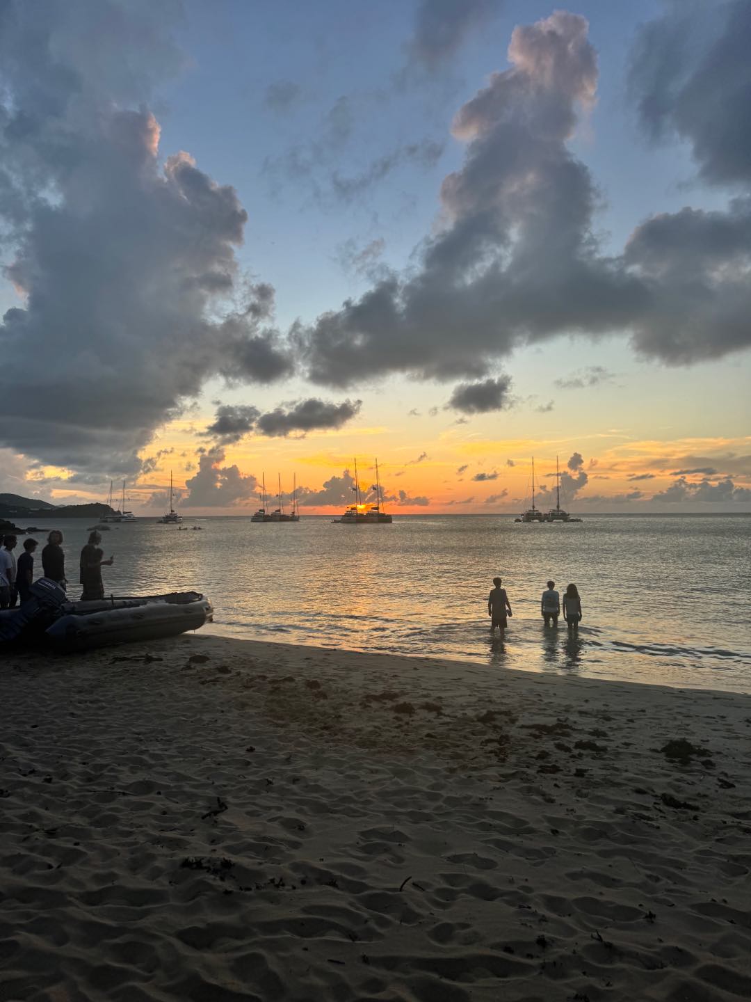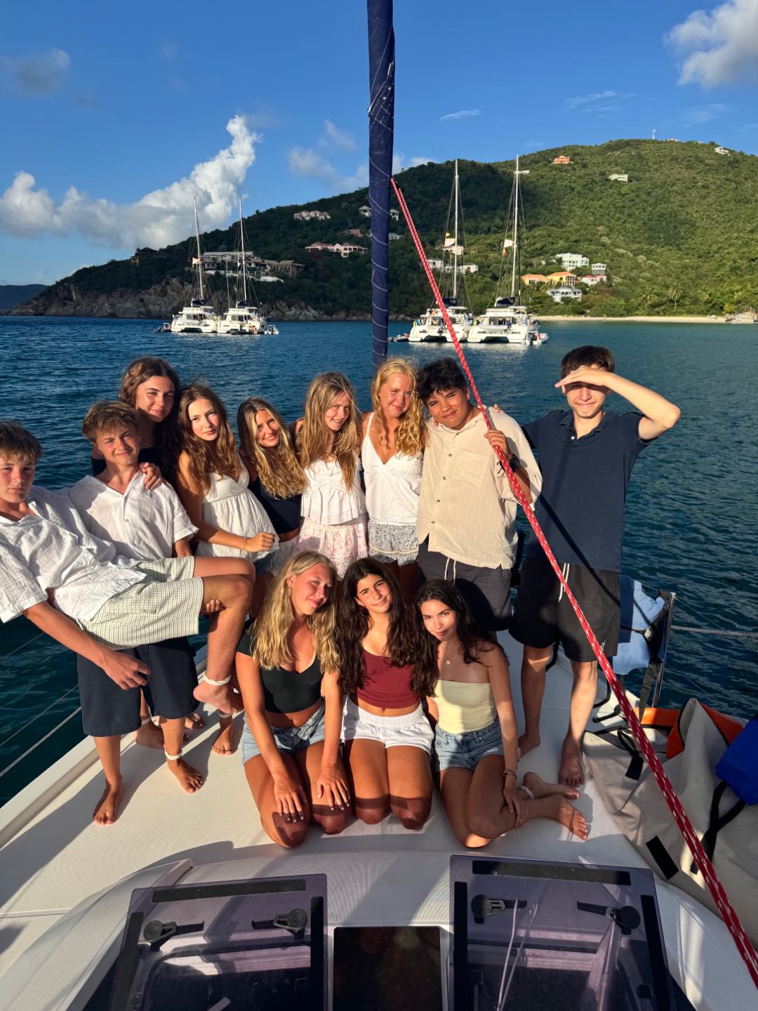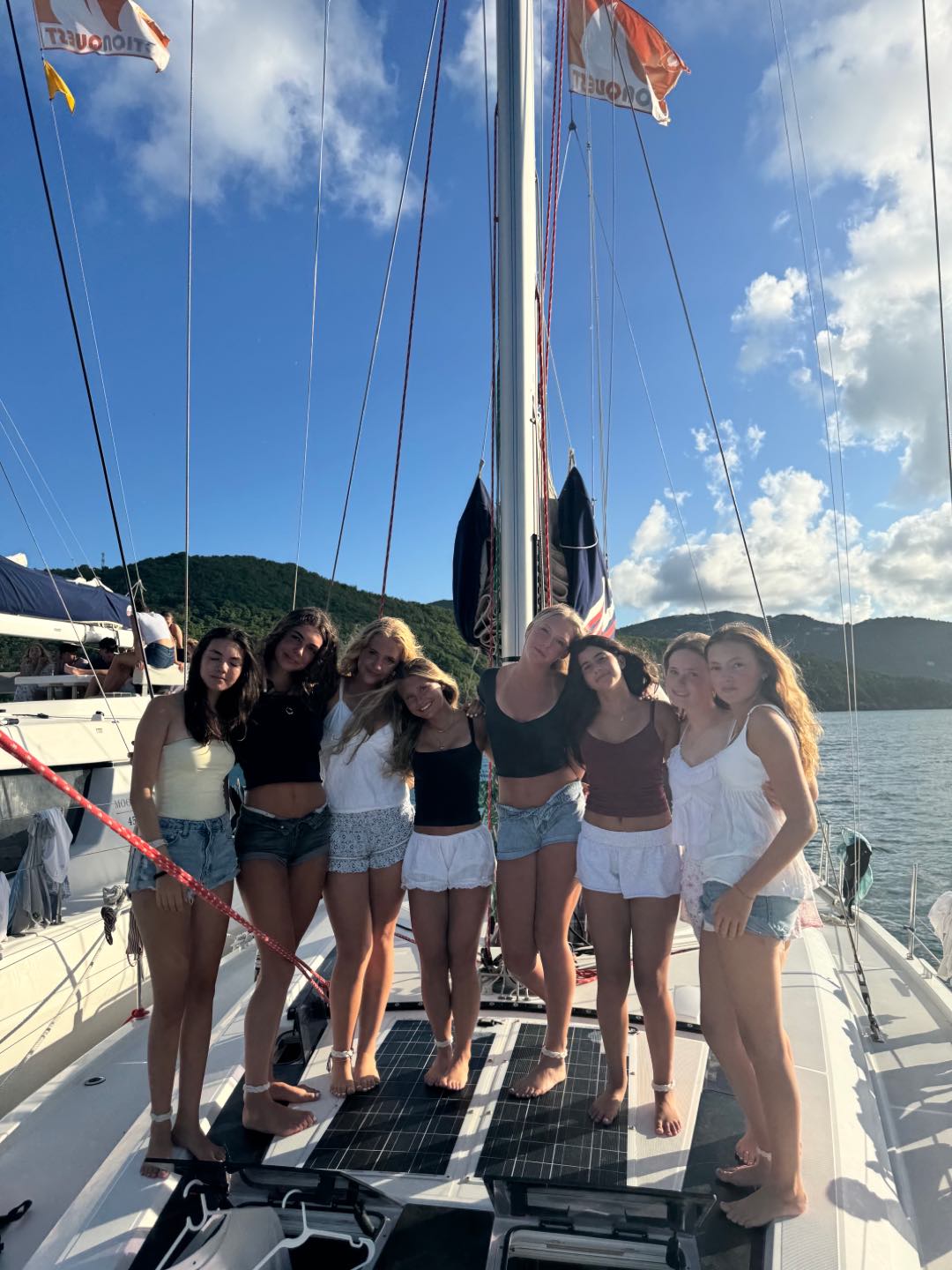 After the hike, we went back to our boat to use the boom swing and get some rest. We saw dolphins at the bay, and they were so cool. Aliya, Margo, Bea, and Lulu were tanning inside the dinghy beside the boat. After, we left the bay to go to the beach BBQ. We triple rafted with Second Wind and Vela Vita while getting ready. We went to the BBQ and it was so fun. While there, Max, Jorge, and Raiden were tackling our counselors into the water. We also saw dolphins again during the sunset. We got back and talked to the other boats until 10:30. Everyone was so tired and fell asleep fast on the bow of the boat. Bye guys!