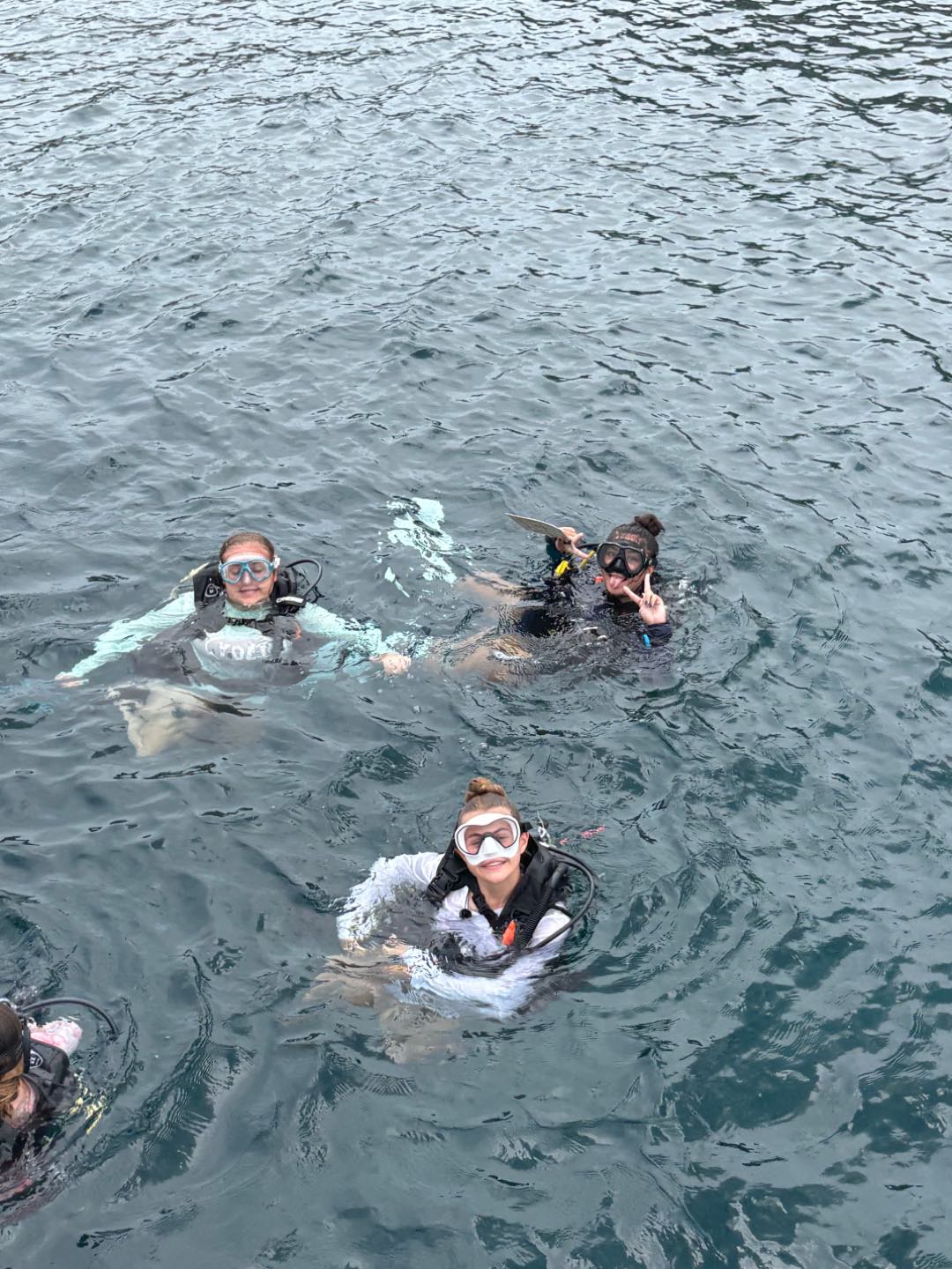 We started our day off today with a group study session, filling out our fish ID journals on the way to our first dive at Shark Planes. Once we were kitted up, we jumped into the sea and descended to 3 sunken planes made to look like sharks. We saw many fish living inside and around the planes. This being our first dive with our mate, Emma, she spotted the first turtle of our trip! Once we got back on the boat, a lot of us went back to our fish IDs, and the rest took a nap to get ready for our next dive of the day at The Chimneys. Here we got to test our buoyancy control while we went through a small hole in the walls surrounding us, and we all succeeded amazingly! During this second dive, we had to identify three examples of mutualism, commensalism, and parasitism as part of our neutral diver course. Although Mahe, Josie, and Emi got a bit distracted looking at flamingo tongue and ended up following another boat group with our instructor Perry and having to ascend them four. When we got back on board, everyone sat on the top of the boat and ended up all falling asleep during our return to Mountain Point. We all woke up about 2 hours later and had a chat about fish anatomy and species taxonomy. After we finished, we ate veggie burgers, mashed potatoes, and salad for our dinner, prepared by our chefs Emi and Sonja. We ended our day with listening and singing along to Hamilton, and a forum for us to get to know each other better.