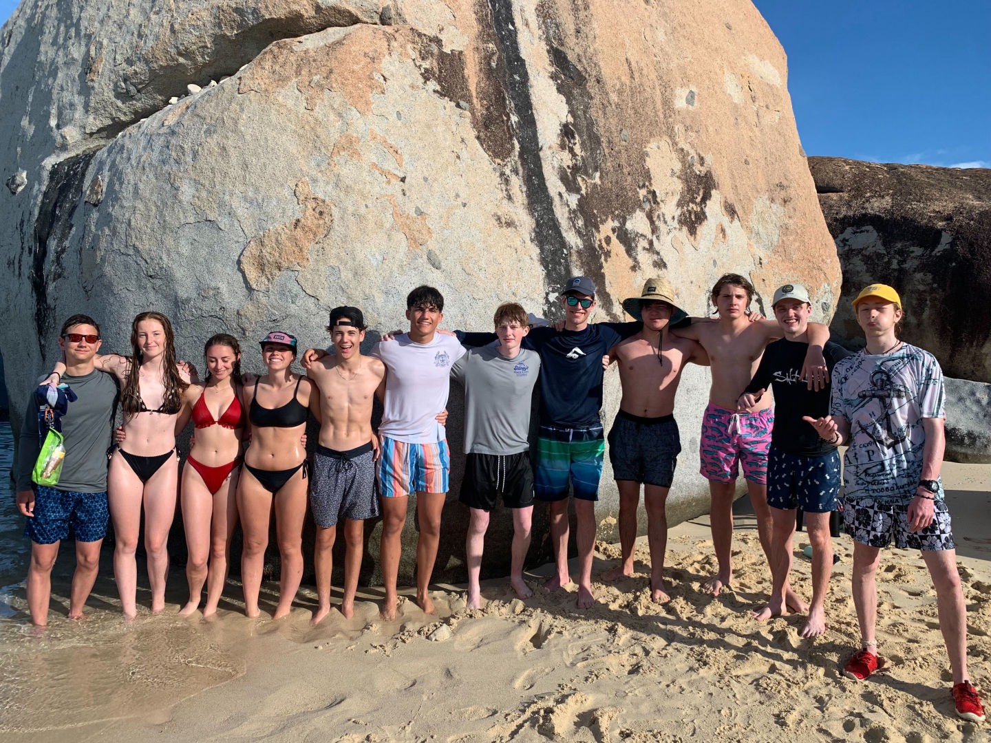 After a short sail to the “visible” dive sight, we began kitting up for our second dive of the day. This time, we were lucky to not have to worry about an overall objective, but instead, we could treat it as a free dive. We dove in and swam to the bow, where we descended together and began our dive. Shortly after descending, we rounded a curve, and out from below a mountain of coral came a 5-foot nurse shark. Everyone was quick to take photos, and the shark minded its own business and swam away shortly after to avoid interaction. We rounded the final curve and surfaced after our second safety stop of the day. Shortly after we finished the dive, we came to find out that all the video and photographic proof of our adventure had been wiped from Andrew’s GoPro! We were disappointed to find out the footage was gone, but the experiences were far from gone. The cooks began work on a very thick yet delicious Mac and Cheese. After lunch, the dishies (Rhiannon, Rooks, Trey, and Mireille) quickly cleaned our plates, and we set sail back for Mountain Point. Underway, we finished the last section of our EFR training and took some short naps. We arrived after another 45-minute voyage. Most crew mates hopped in the water and enjoyed some free time to swim and jump off the boat.