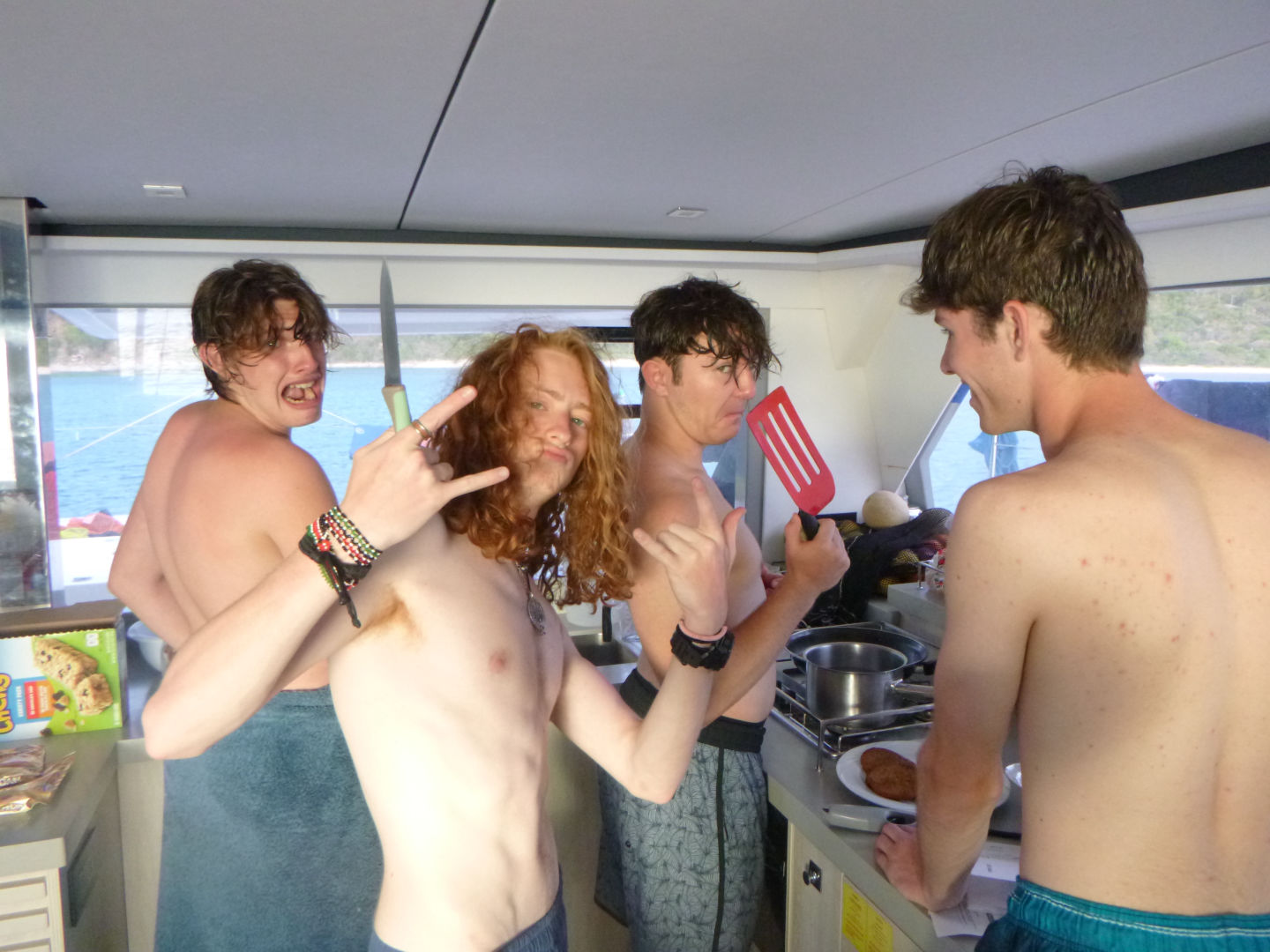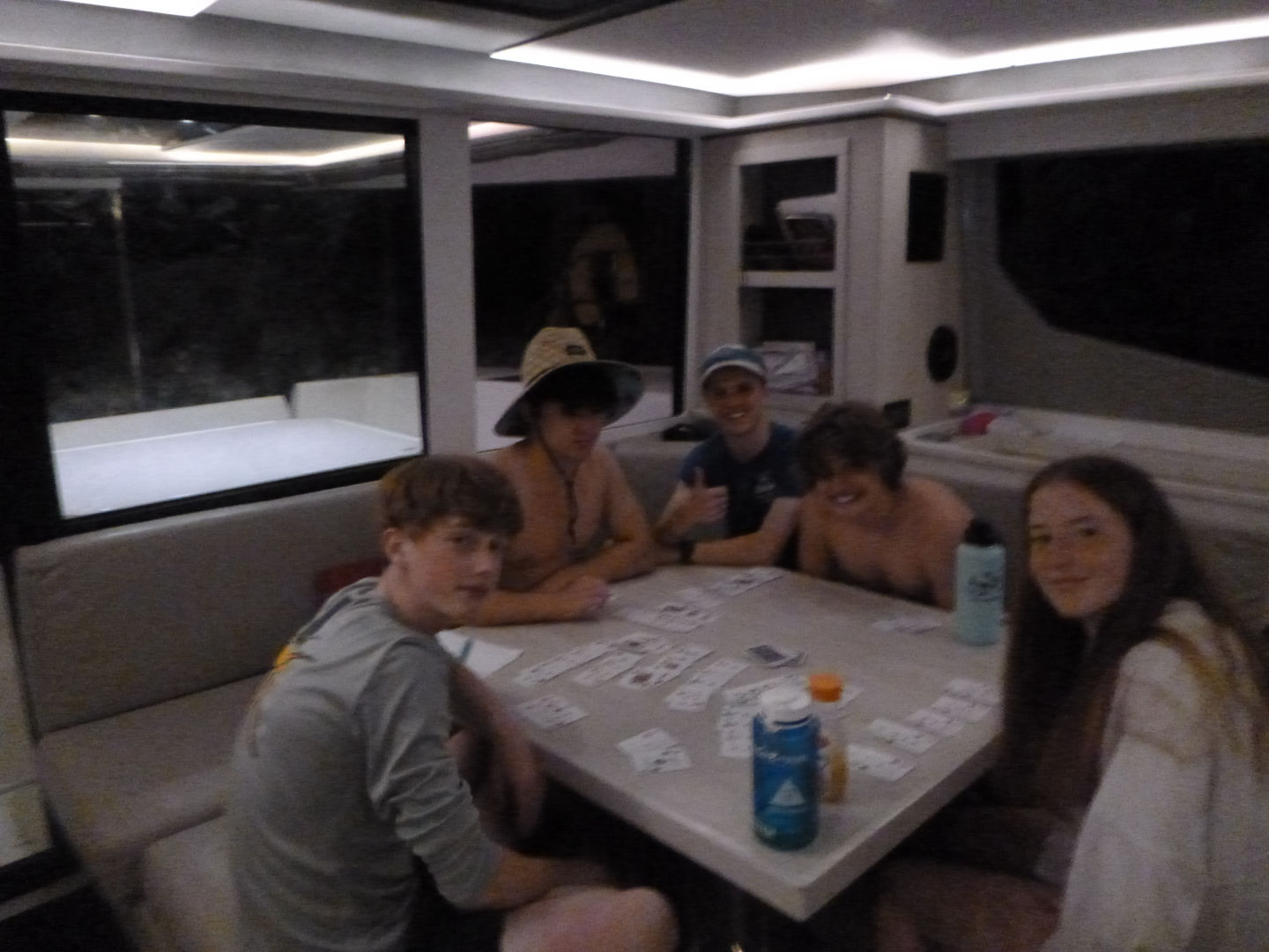 After some fun water activities, we dried off and had a quick discussion of our plans for the rest of the afternoon and evening. We separated into groups of 4 and began rotations between CPR training with Matt, Shock, Severe Bleeding, and Spinal Injuries with Bianca, and arguably the most exciting Wakeboarding and knee boarding with Griffin in Shaka. The first group to go out for water activities was Scott, Ryan, Simon, and Shay. After getting back the rotation following water sports was CPR with Matt while Lucas, Trey, Nico, and Rhiannon went for water sports, and shortly after the last group, Rooks, Andrew, Alicia, and Mireille finished off the day with their not-so-fair turn of water sports after being cut short due to time crunch for dinner. While the last group was out with water sports, our chefs began work on a delicious Veggie Burger with Mashed Potatoes and Beans masterpiece. We finished dinner and ended with a group squeeze, and got right to work on the dishes. The rest of the evening involved playing cards, group discussions, and time to ourselves before heading to bed.
