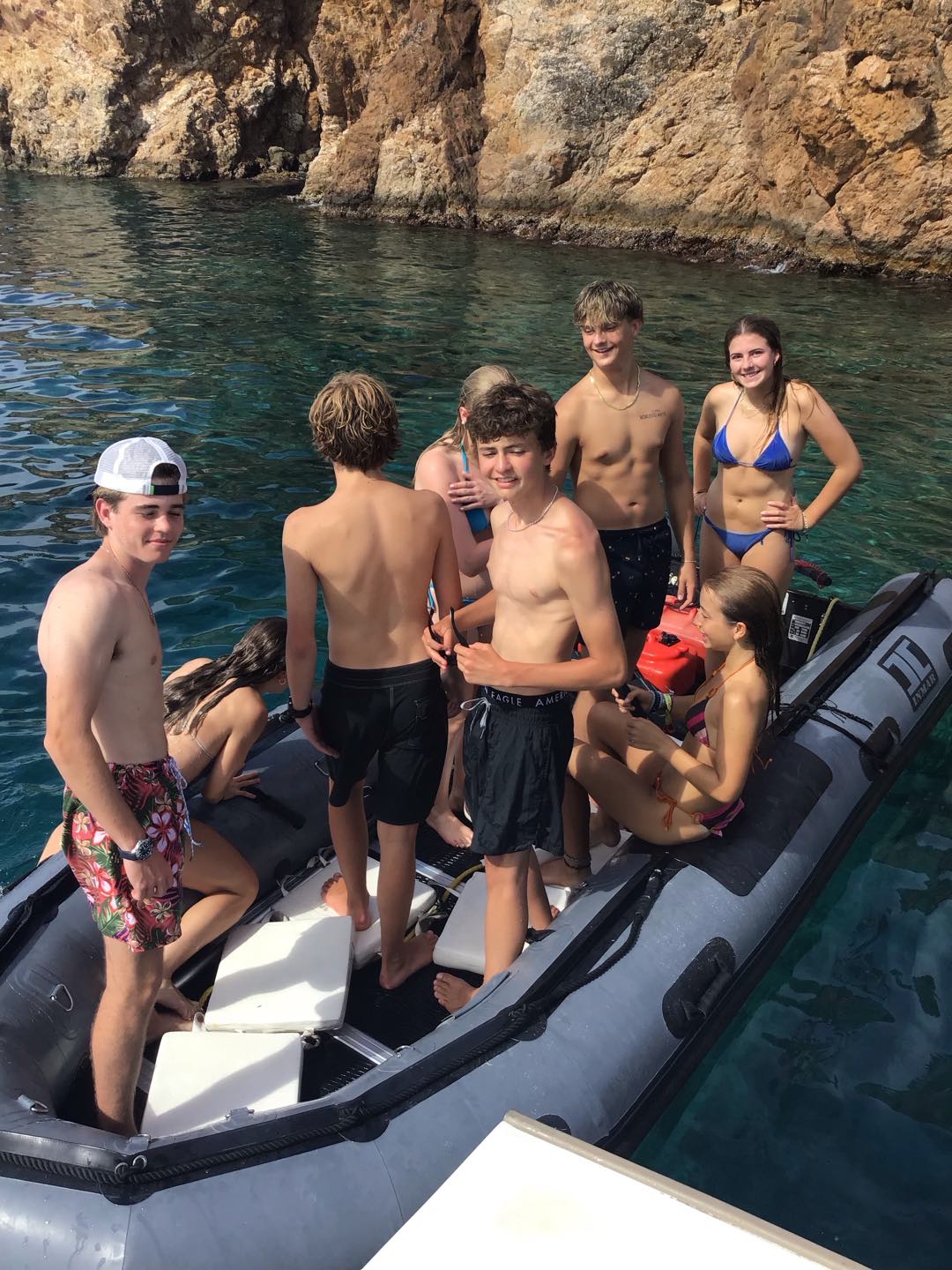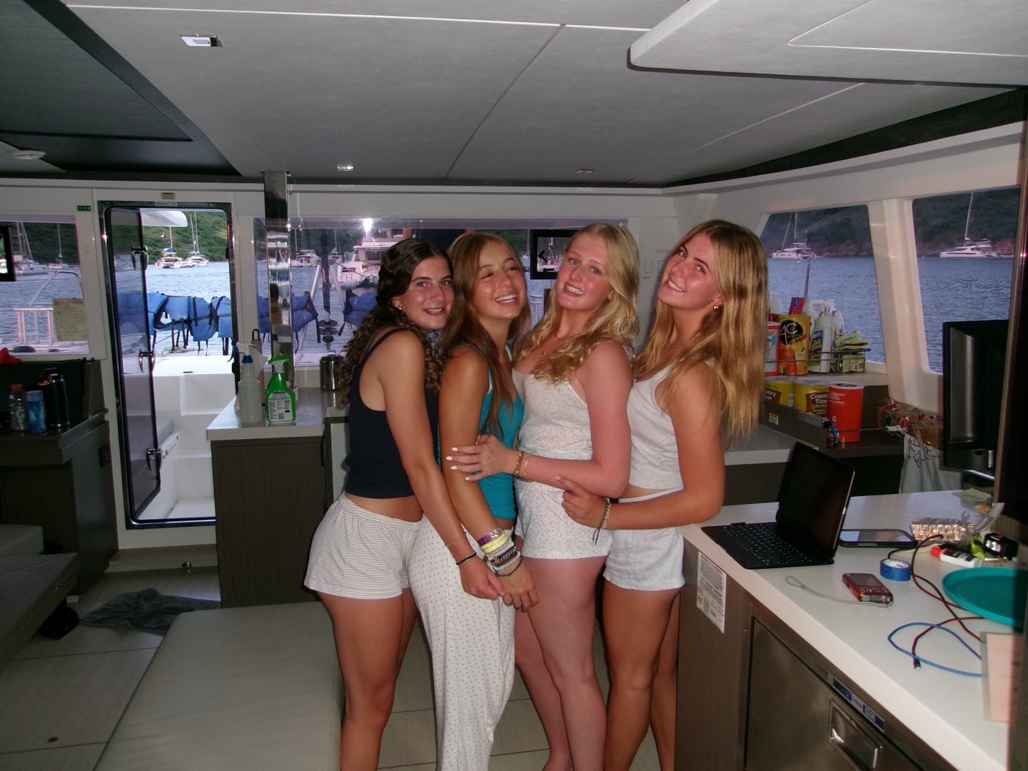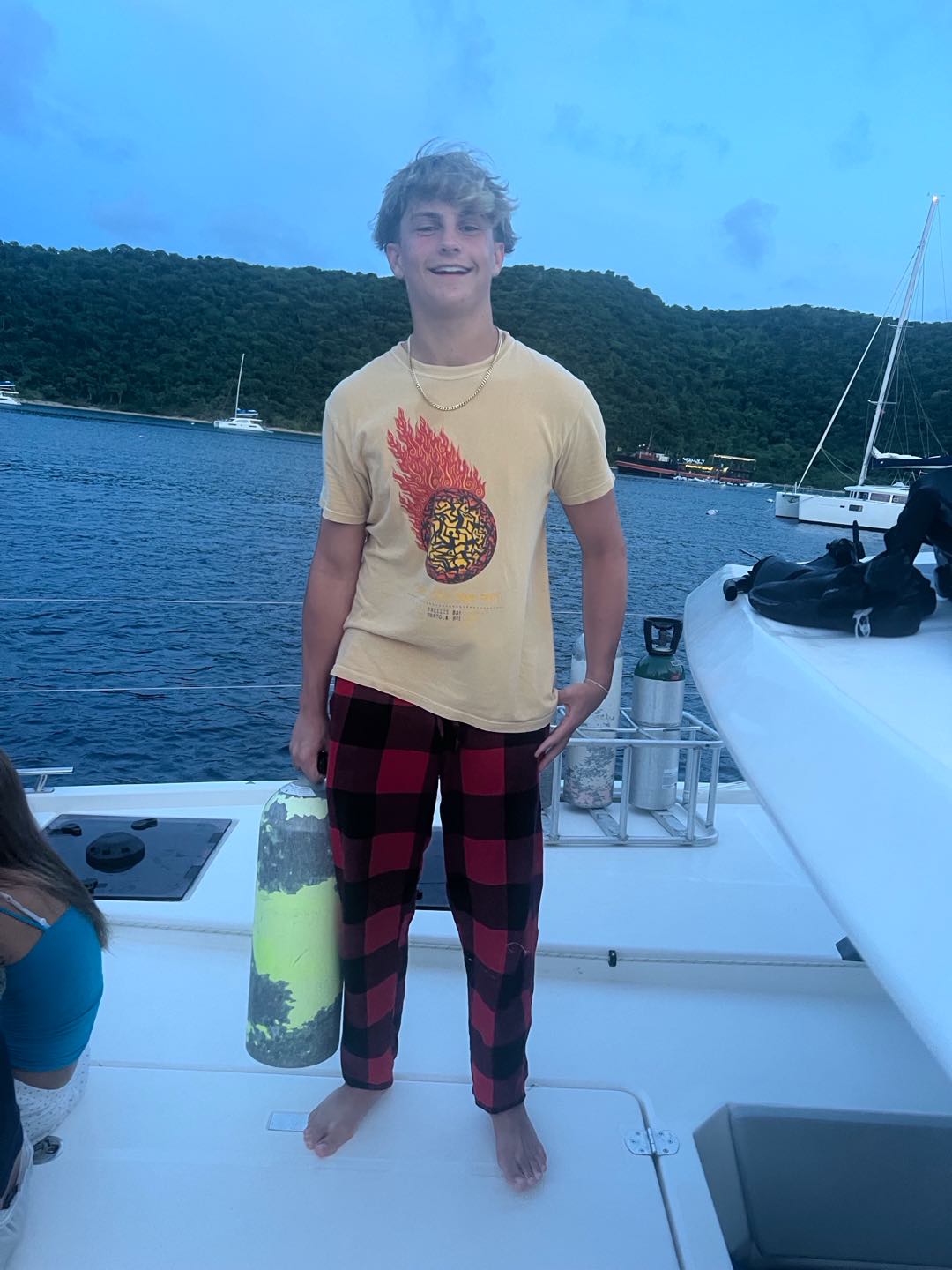 This morning, we woke up at 7 am, got ready for a busy and fun day, ate cereal for breakfast, and met up with director Mike for our briefing. After learning about safety and the rules to keep us safe, we set sail. Chase, Greyson, and Jack M raised our main sheet, and Lyla used the winch to pull our sail the rest of the way up. Around 2, We arrived at Norman Island. We anchored and then enjoyed the sun. Andrew B, Andrew D, Caroline, Lyla, Emilia, and I practiced our flips off the dinghy while Sofia and Sloane practiced their free diving. Then we went snorkeling, and LJ (Jack H) brought his GoPro, so we got lots of great videos of us diving and a group photo. We snorkeled a couple of really cool caves and saw a bunch of unique fish. Lyla and Sloane made sloppy joes for dinner. Andrew D says hi to Uncle Tom and Uncle Scott. Overall, we had a great first full today and are exited for many more to come.