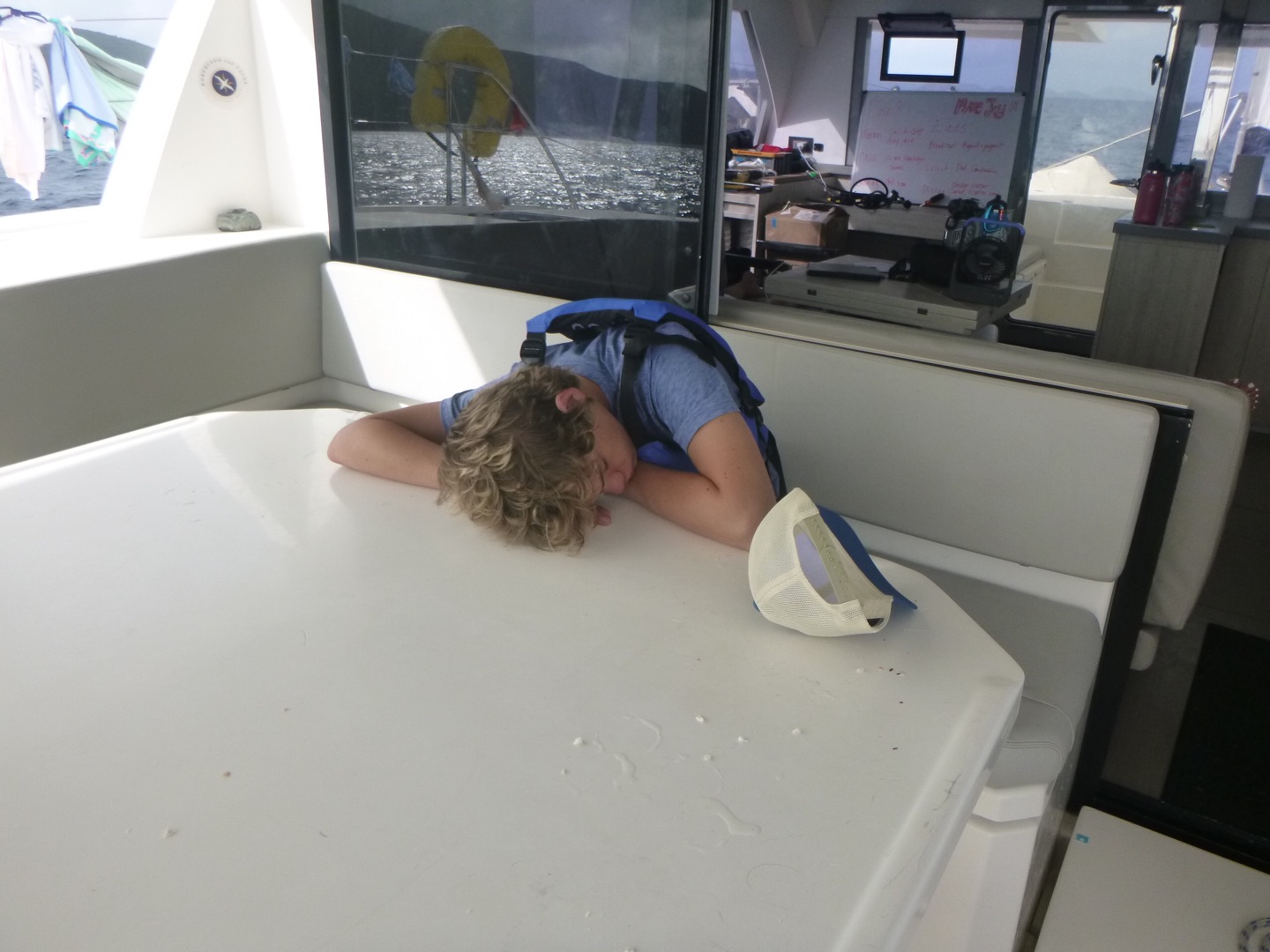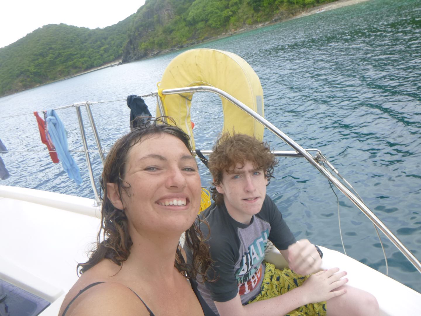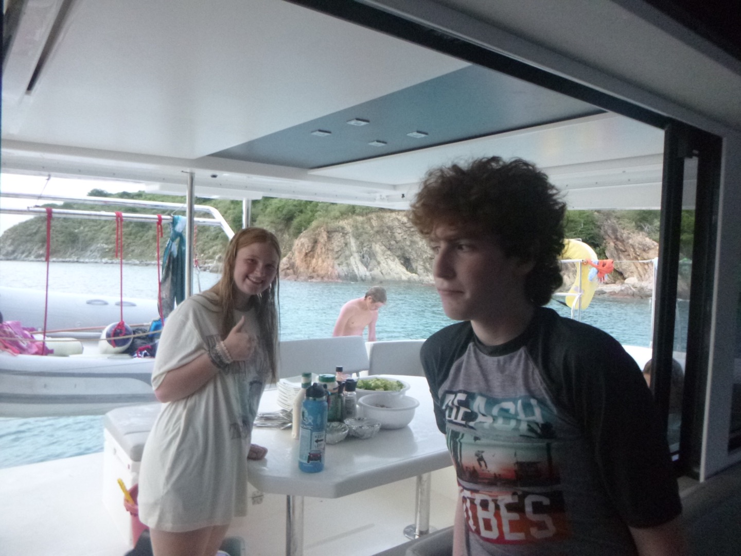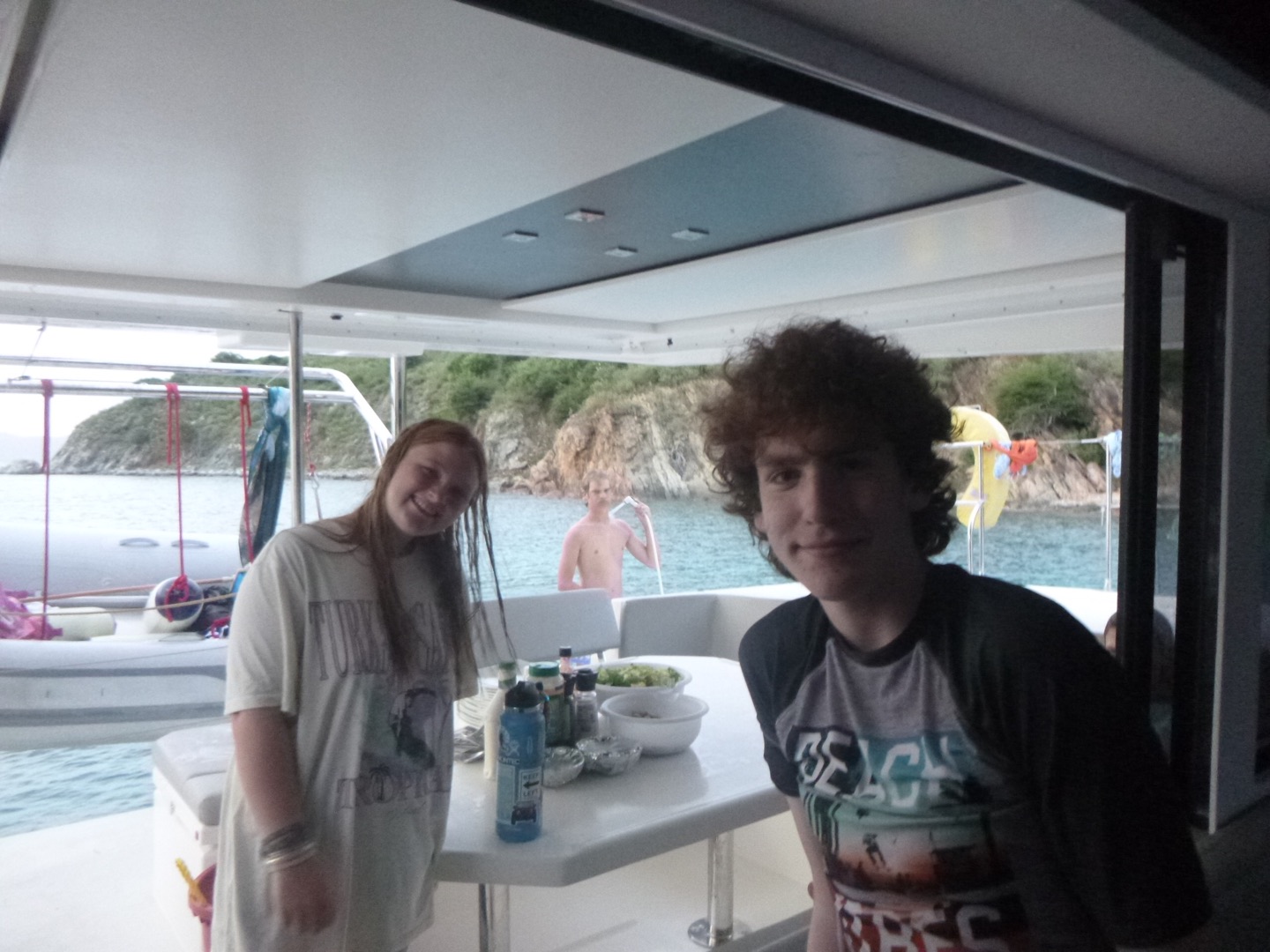 Today was yet another day of sailing and diving but to new extremes. We woke up at about 7 am after the party in Leverick Bay last night. We had over a 3-hour sail this morning to Great Harbor Point, so we had no time to waste. We decided to eat breakfast while underway to save time. Today, for breakfast, we had bagels and yogurt. I personally took advantage of the long sail to catch up on some sleep, as did the others. When we got to GHP, we ate lunch, which were deli sandwiches today. After that, we set up our gear for diving, and students from other boats came over so we could dive with them. As we got ready to go, a huge thunderstorm came through, so we had to wait a little bit for the rain to pass. What made today’s dive so special was that it was our first deep dive of the session. Today, we reached a maximum depth of 81 feet! We later had some post-dive fun when Jake set up a boom swing for us to jump off of the side of the boat. It also started pouring rain again during this time, which was nice after being in the saltwater all day. Everyone just hung around and did various things, and eventually, the rotation of water sports began. Some people went to go water skiing, knee boarding, and wakeboarding. At the same time, others stayed on the boat and lounged around for a little longer. Once the water sports people came back to the boat, we ate some dinner, took some showers, and wrapped up the night. We are about to see Pirates of the Caribbean because, surprisingly, many people have not seen it before.