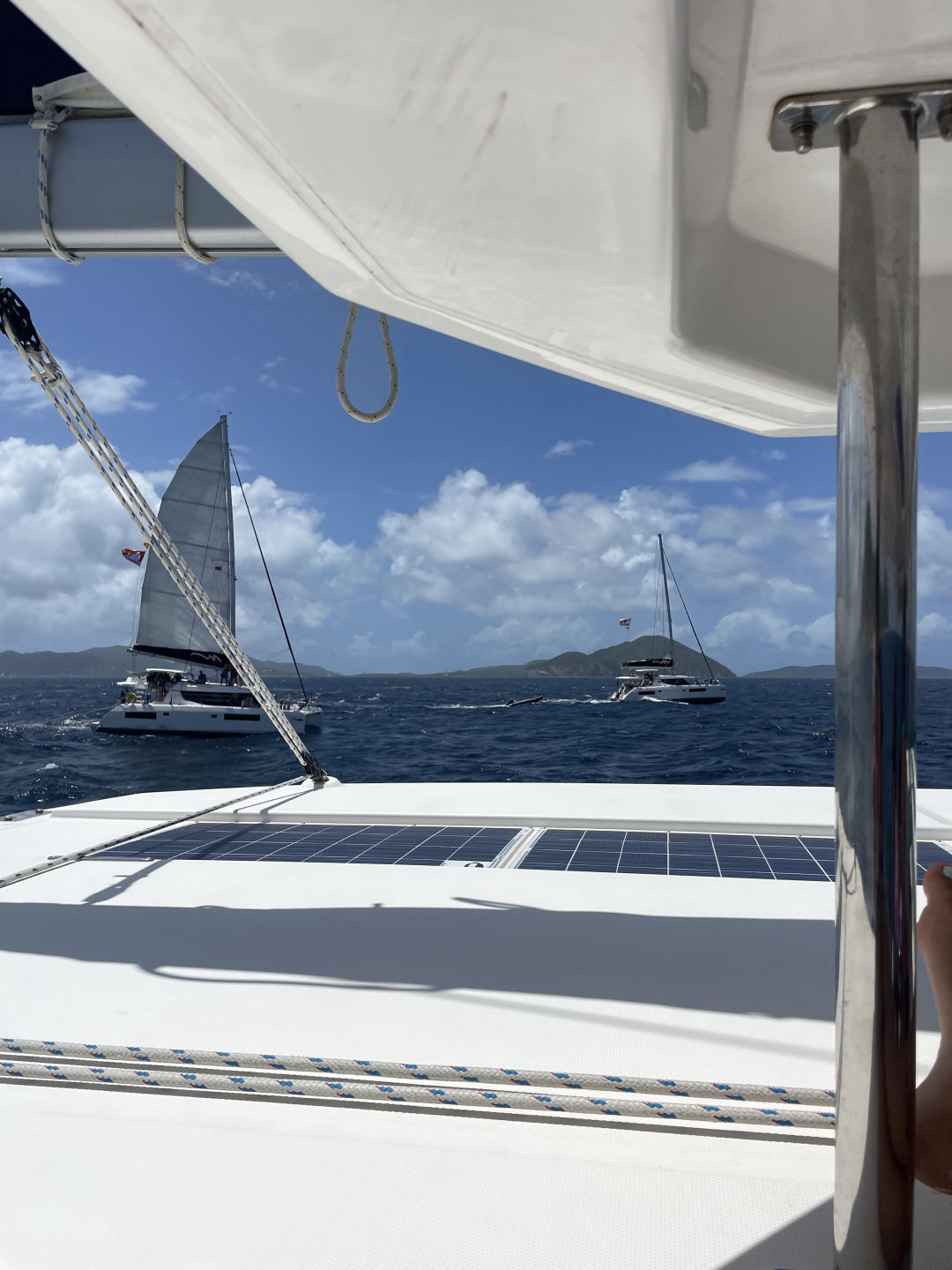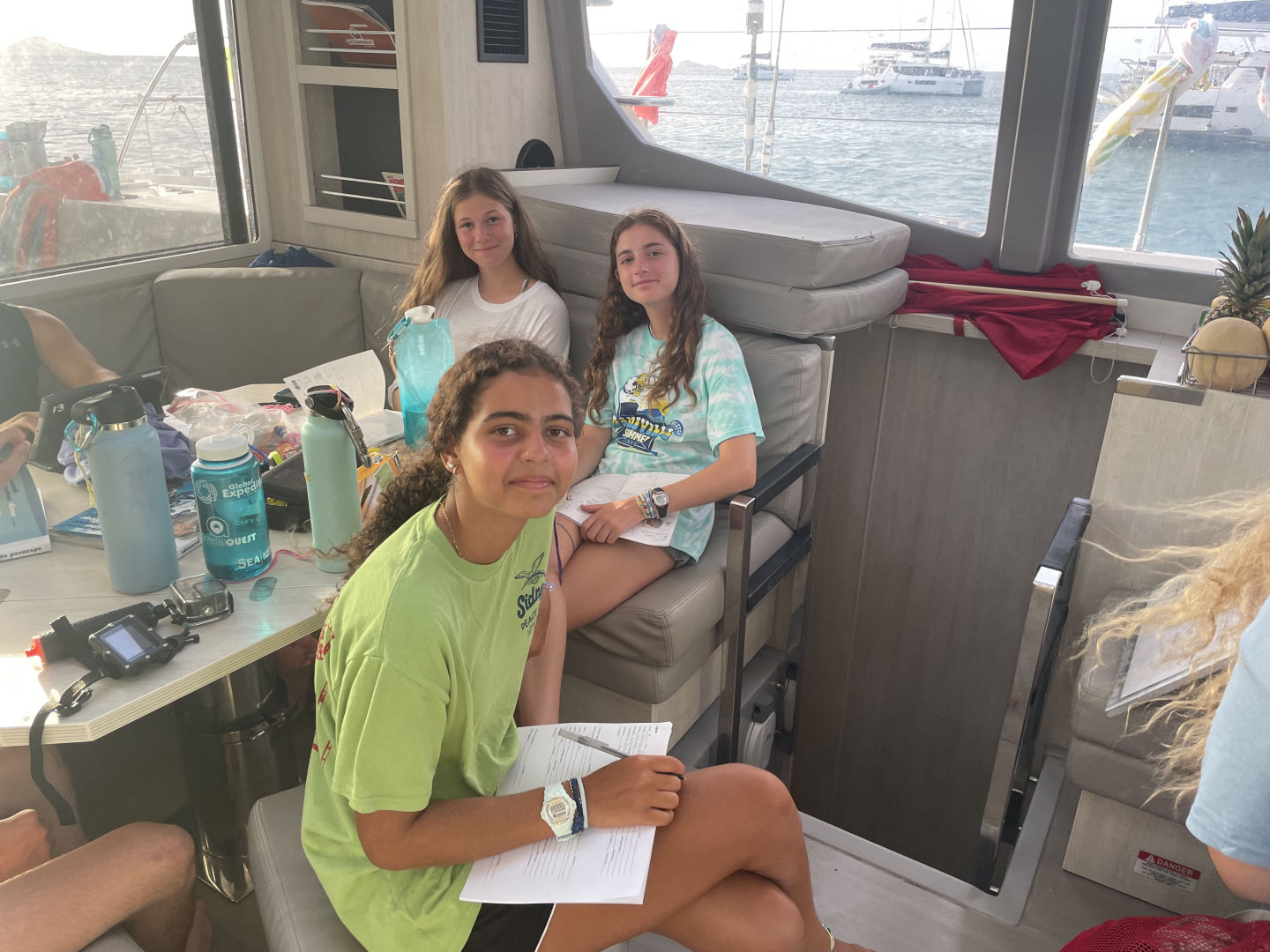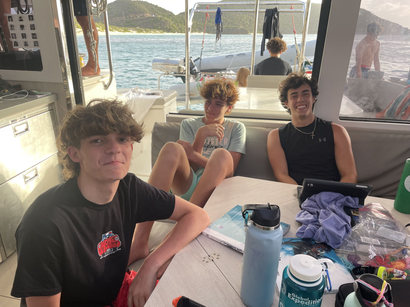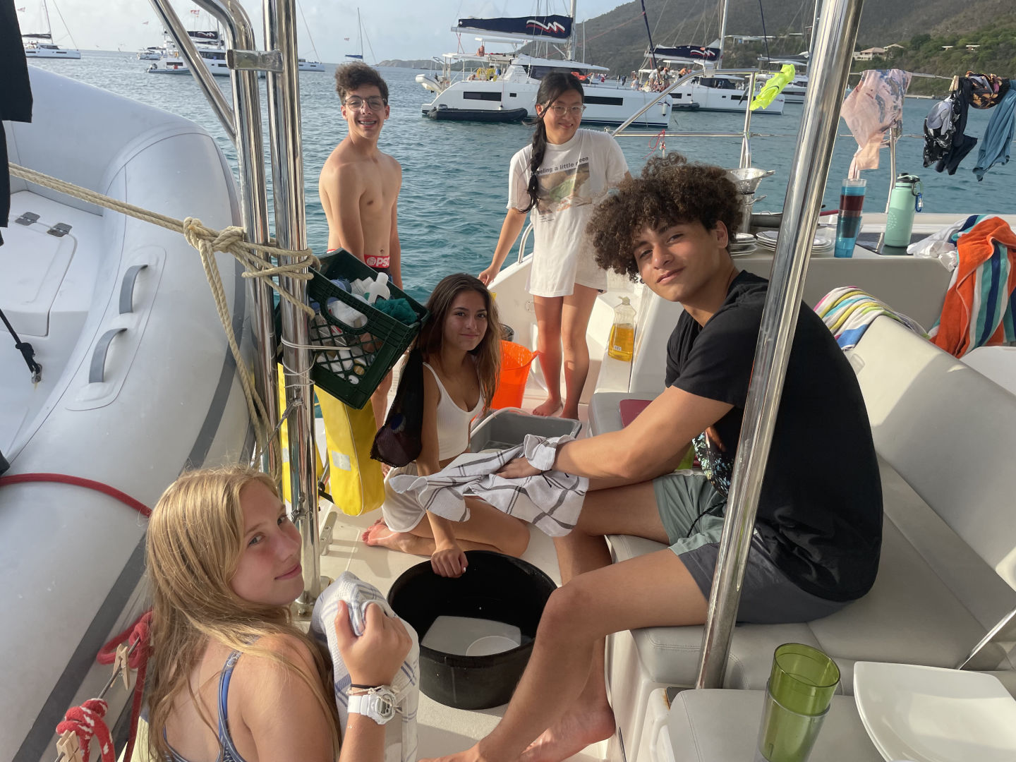 Sunday- Today was incredible. Eric and I woke up early enough to see the sunrise before we set out to sail to a new island called Cooper. When we arrived, we got to do our first real dive of the trip at the Blue Chromis Reef. We got to see all types of colorful fish, such as trumpet fish, surgeon fish, parrot fish, and triggerfish, as well as lots of coral. Everyone really enjoyed it. After we came back up, we set sail to Virgin Gorda and got to swim and tan as a group for a few hours. We also did flips and dives off of the boat. I cooked dinner with Katie tonight. It was delicious pasta Alfredo that we ate while we watched the sunset. After eating, we spotted a barracuda around 5 feet long. Tonight we are all going to sleep on the roof and look at the stars. We will also be able to enjoy the first good breeze we have gotten yet.