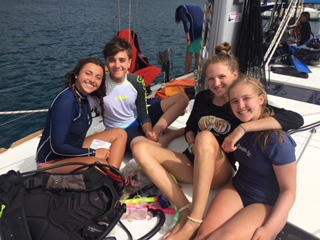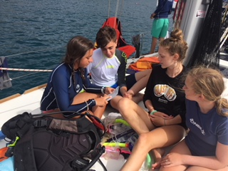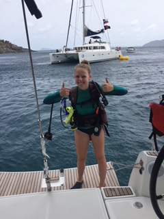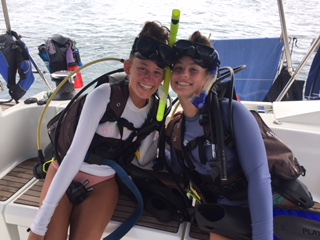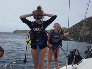 Today was one to remember. We woke up as usual with the sunrise and filled up on some oatmeal and began preparations for our PADI open water final at 8:30 am. Once we were finished, we picked up anchor from Mountain Point and headed down to the Dogs, where we spent our morning learning to tie Turk’s Head anklets/bracelets. We then sailed to our dive spot where we had a quick lunch before we splashed in the Chimneys. Here we fulfilled our skills training of clearing a fully flooded mask, recovered our regulator, and ascended while sharing air from 35 feet. Once our instructors were satisfied with our demonstrations of the skills, we used our remaining air to go for a swim through of the Chimneys. Here we saw all types of fish, coral, and jellyfish. Thirty minutes later we surfaced and broke down our gear and returned to Return of the Macks for a nice warm dinner of tortellini and garlic bread. We ended up the night with our nightly squeeze question where we all got to learn more about each other, bringing us closer together each night.