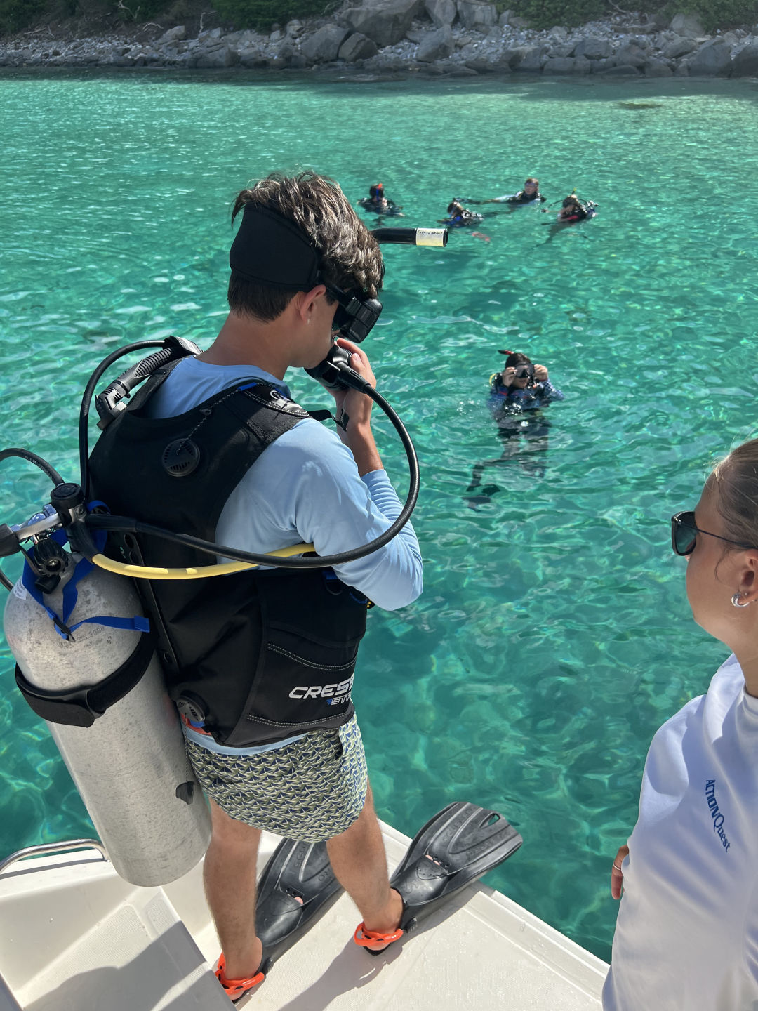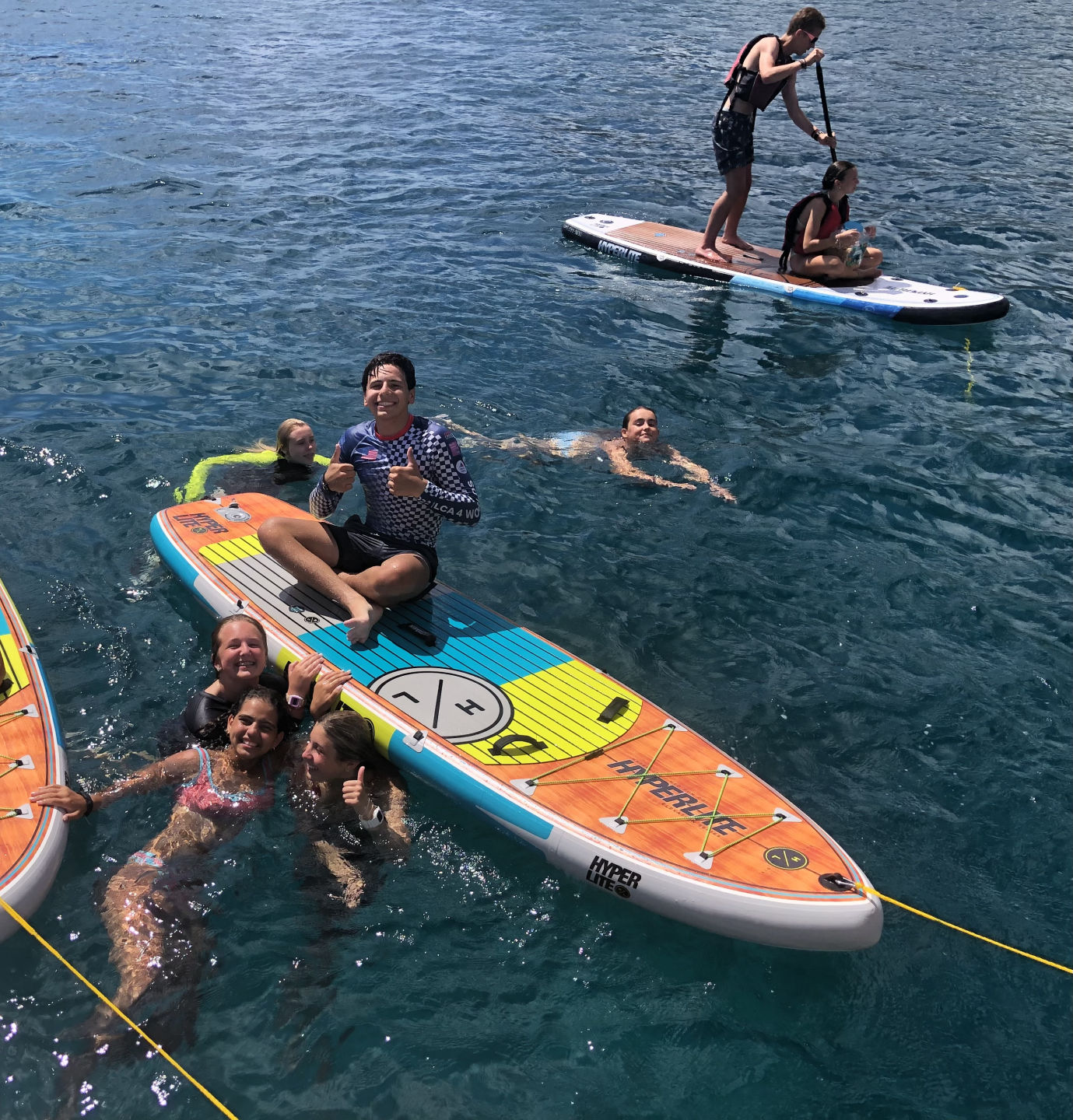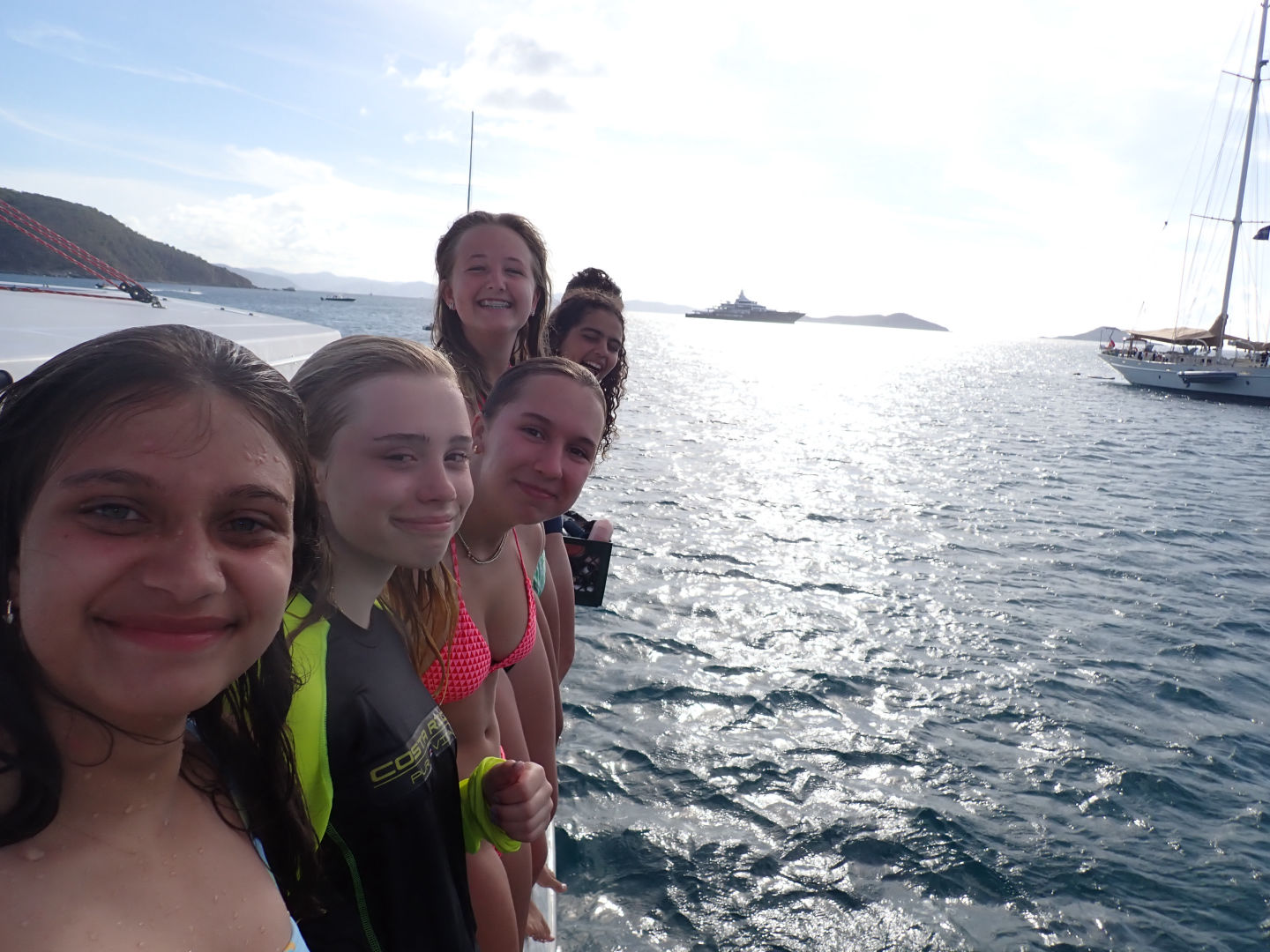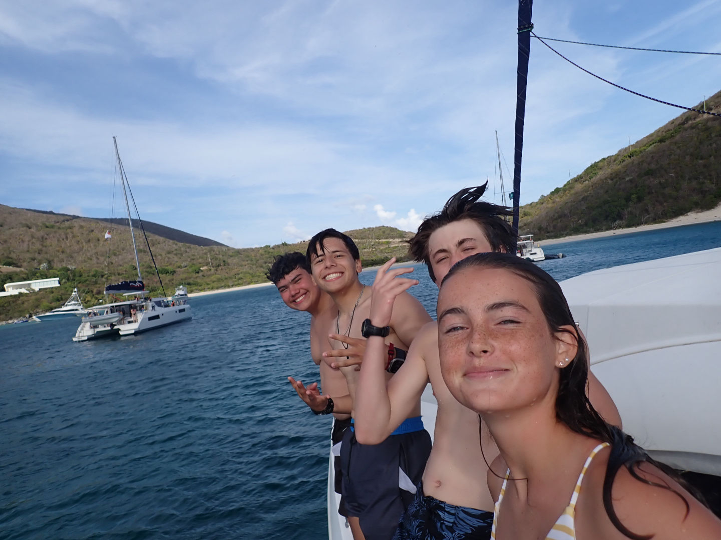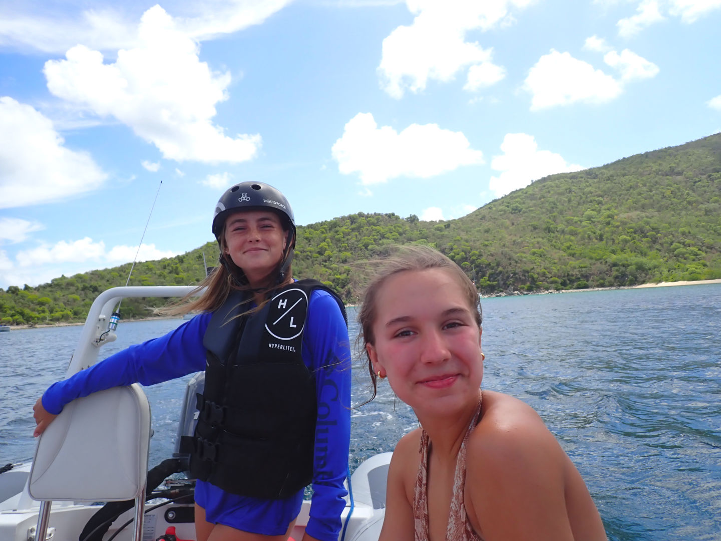 On day five, we all had to wake up really early, around six, because we had a longgggggg day ahead of us. The chefs for the day (Sophie and Lilly/south side) cooked us oatmeal which was okay. After that, we got ready to go for our first scuba dive. We dove for around 30 minutes at Mountain Point. Carlo’s mask got really fogged up, and he couldn’t see anything at all, but Myles, as his scuba buddy, was able to lead him along the way. At the same time, Riley, Sophie, Asa, Julian, Ana, Shane, Zoe, and Maya all saw a really cool-looking turtle and a bunch of shells. After that, we did water sports, including kneeboard, waterskiing, and wakeboarding. The group was mostly divided into boys and girls, and in the boys’ fleet, everyone got up, and Ace even did a flip.