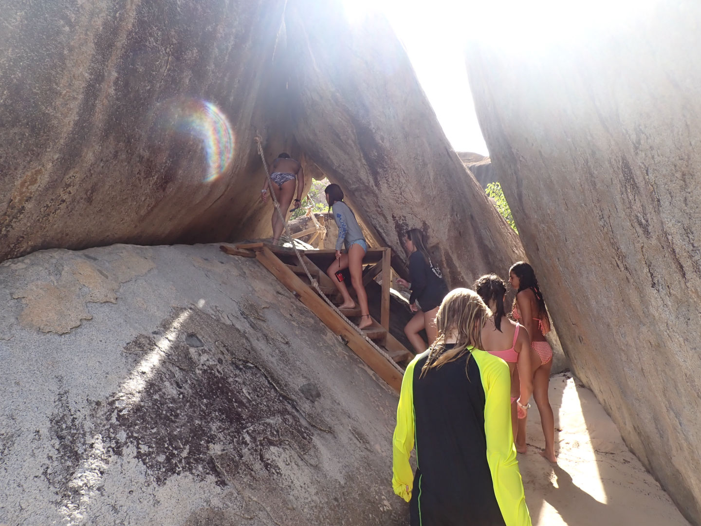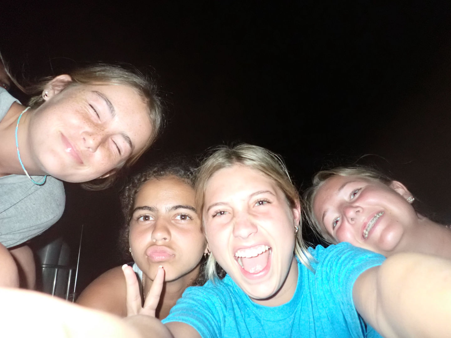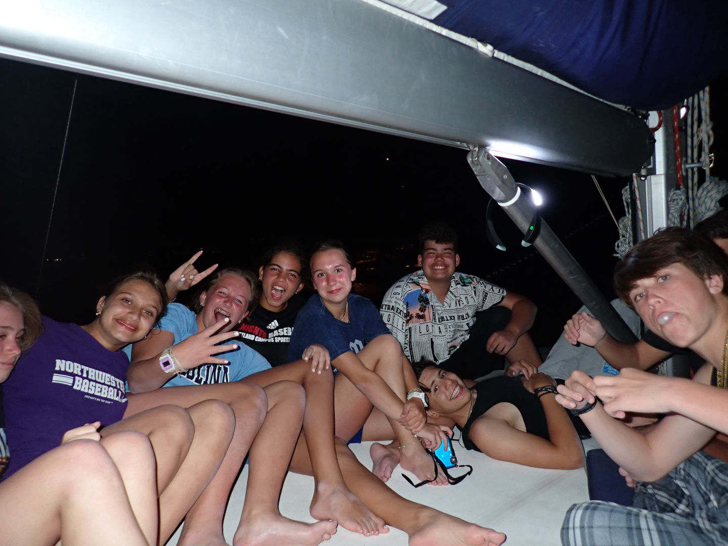 In the girl’s fleet, almost everyone got up on the wakeboard, including Zoe, Sophie, Lilly, Alta, and Ana. After that, we all practiced doing a few basic knots for sailing, as well as practicing driving the dinghies. When we were done with that, we had a couple of hours to relax and chill in the water. Some of us took the paddle board close to the island, and we relaxed on top of them. Since our boat was being used by other students, we were hanging around the boat ‘Meow or Never,’ and they even gave us apples and bananas with peanut butter. Around 5 in the afternoon, we got picked up, and after we bathed, we prepared dinner. Today we ate Beef Stroganoff, and it was really, really, really good. While we were cleaning up our plates, Davis noticed something in the sky…for the FIRST TIME in the last five days, we finally saw the moon. We’ve been extremely confused why we couldn’t see it, and today we finally got to see it. Everyone got so happy they started clapping. Later tonight, we are going to be doing a new activity we haven’t done yet called ‘Life Works.’ After, we are going to hang around the boat for a while before getting ready for another day in ActionQuest. Goodnight everyone!!!