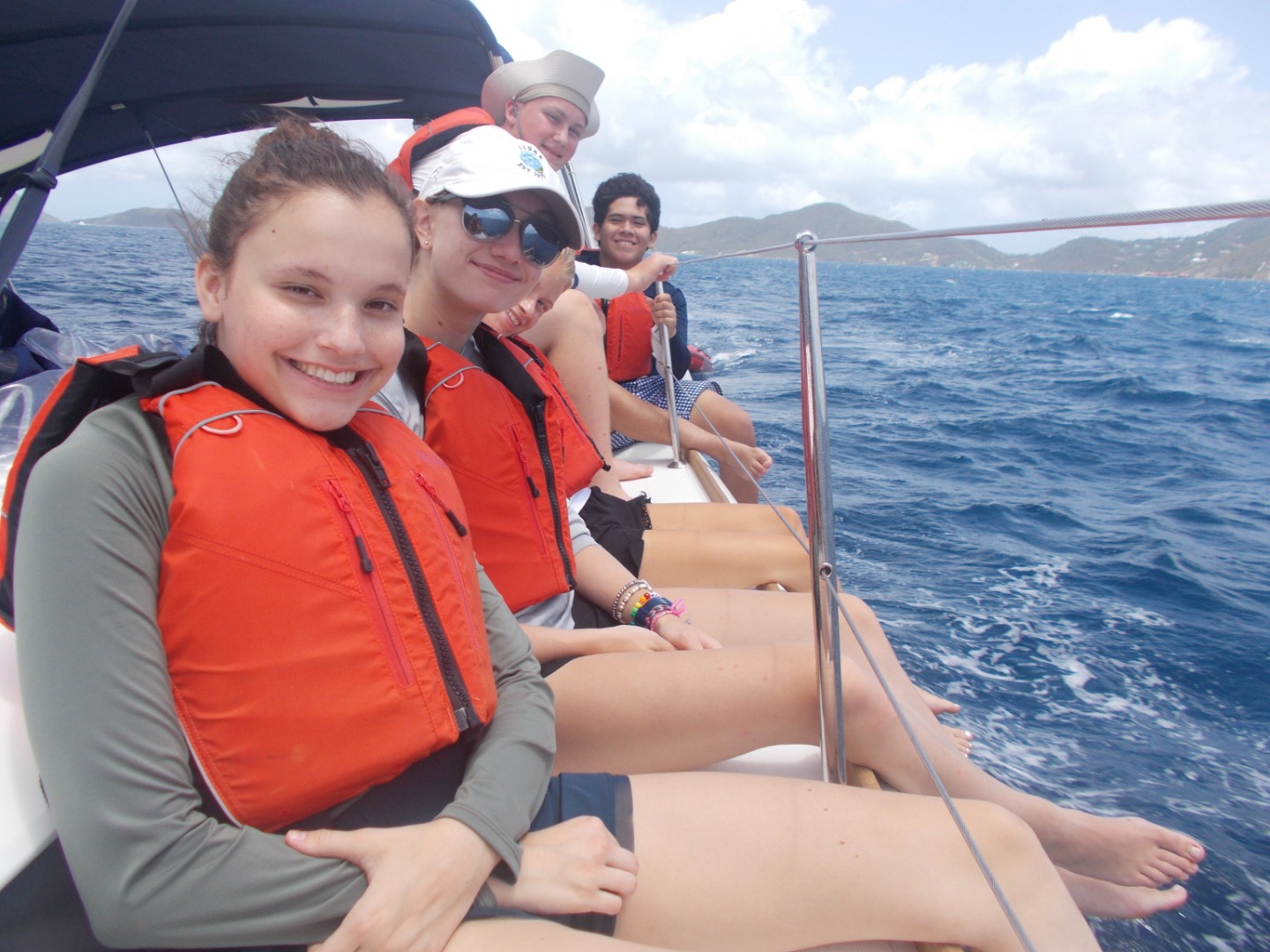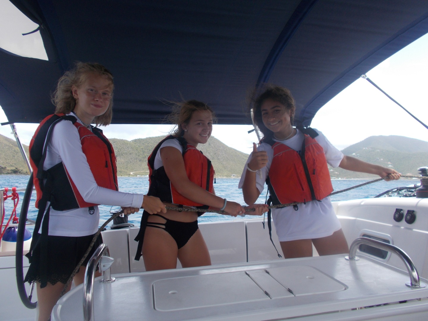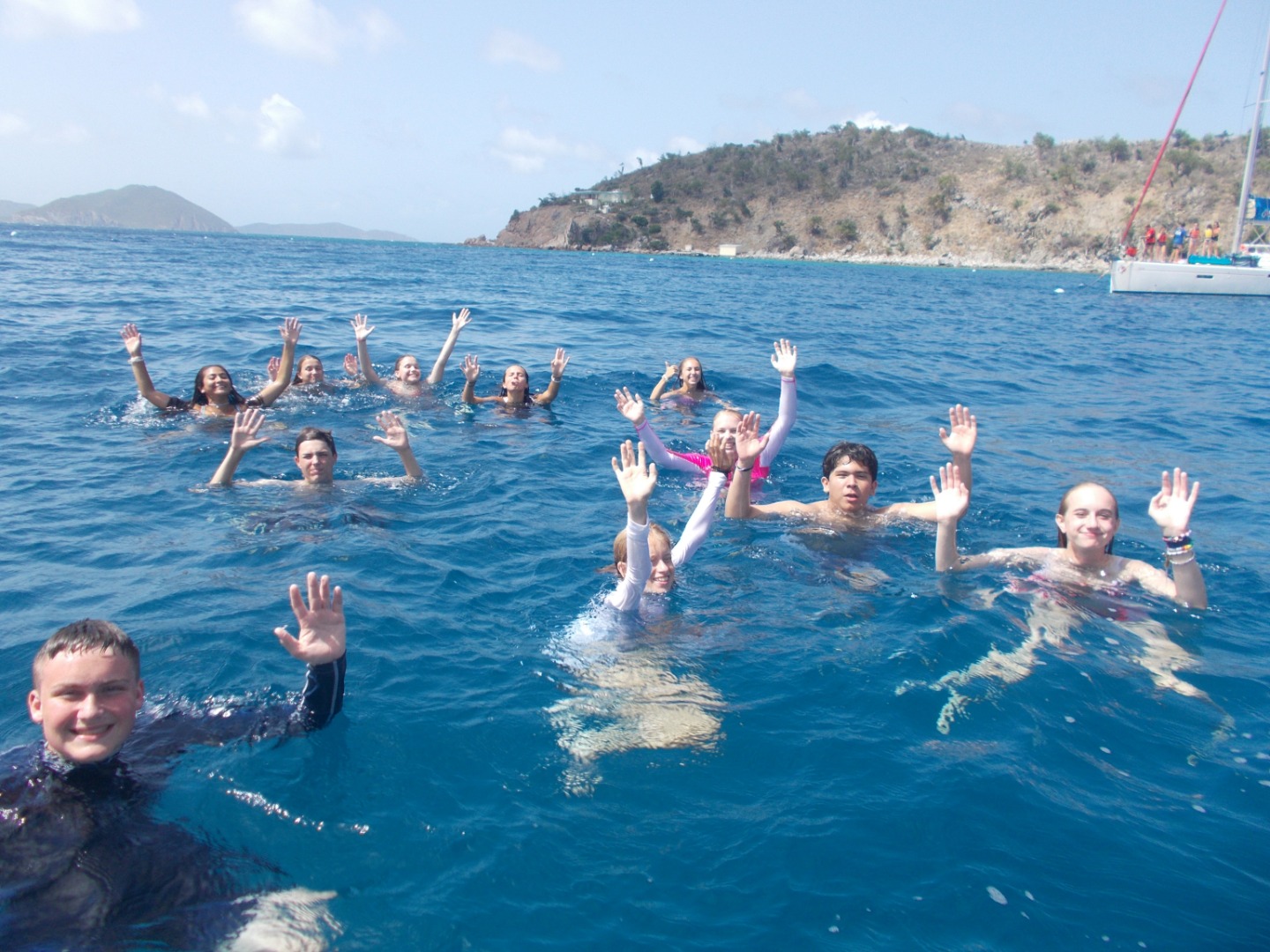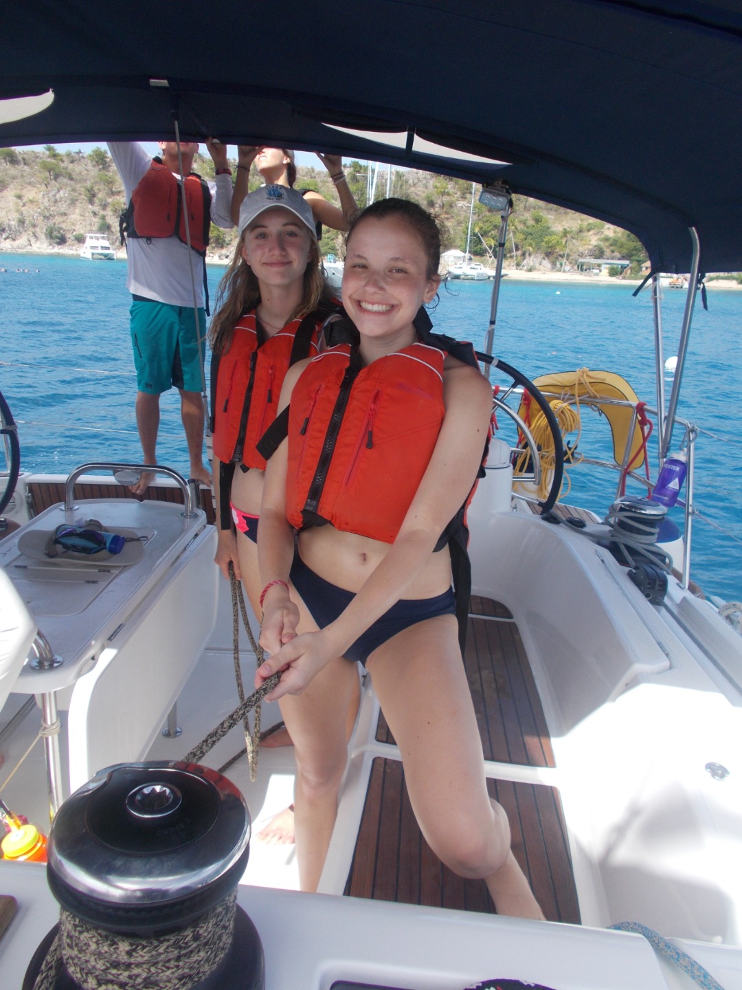 My first job today was the challenge of getting the boat off of the dock. After we got out of the marina, we put up our sails for the first time to head to our first destination: Cooper Island, led by our navigator Emma. After three hours of constant tacking and learning had to sail, we got to Cooper Island and had a swim test, which was to swim six laps around the boat and tread water for 10 minutes. After we had peanut butter and jelly sandwiches for lunch and saw a huge sea turtle! Then we continued sailing to our final destination, Savanna Bay, where we will eat sloppy Joe’s and learn about our scuba gear and get ready to start diving tomorrow.