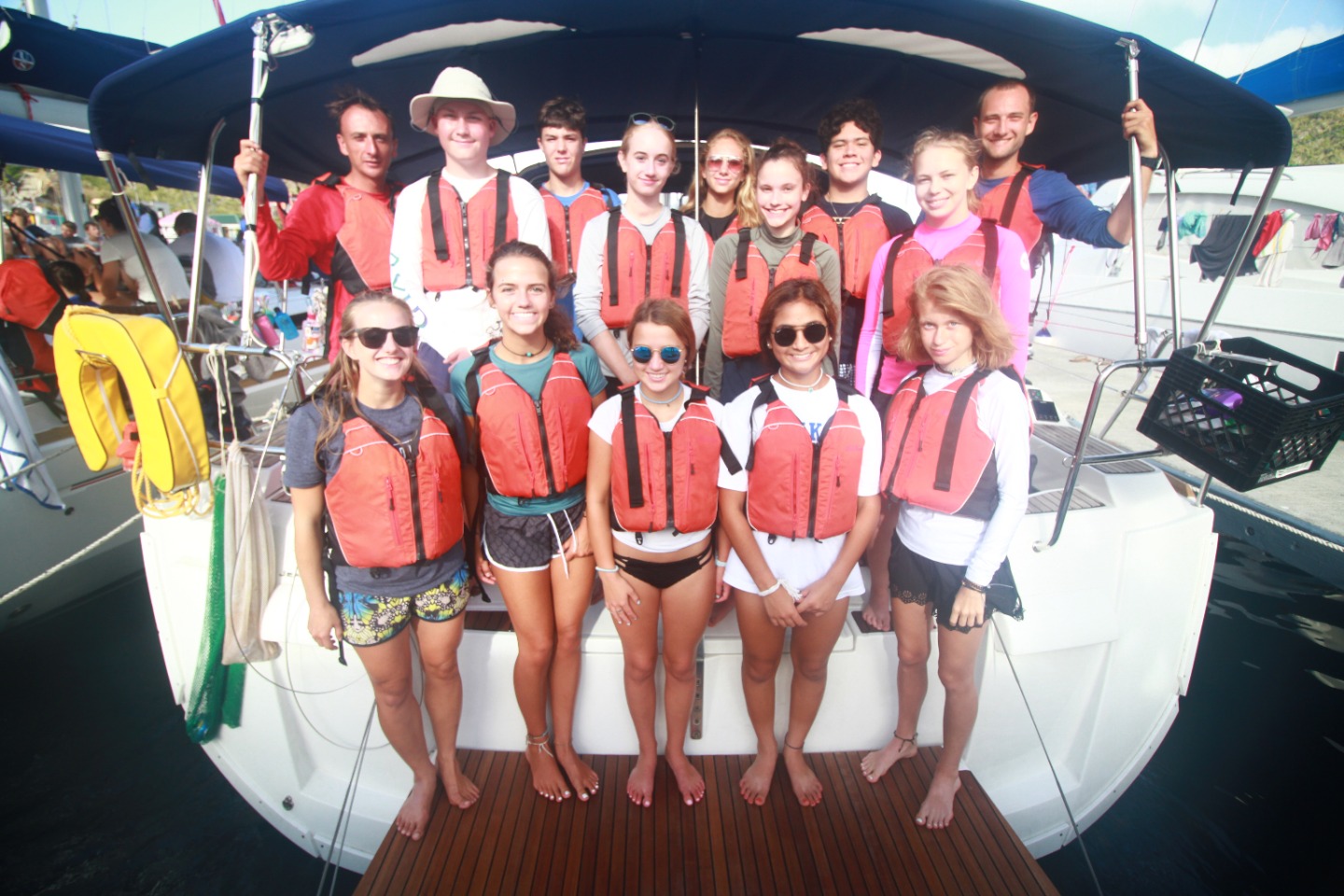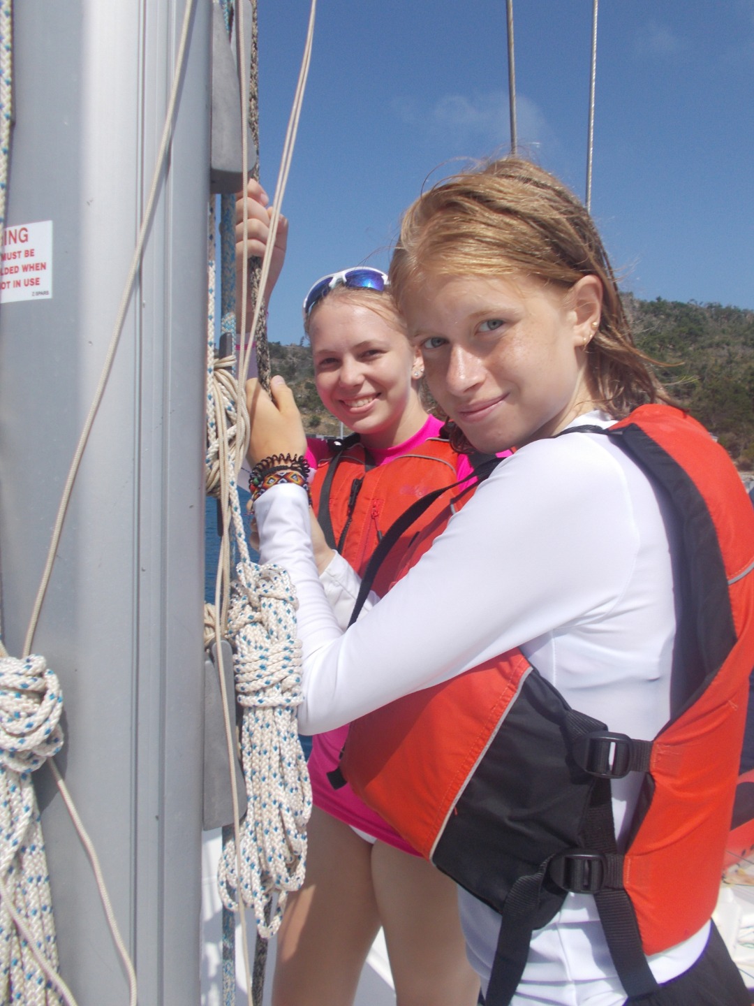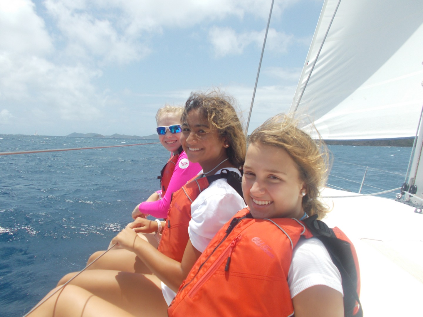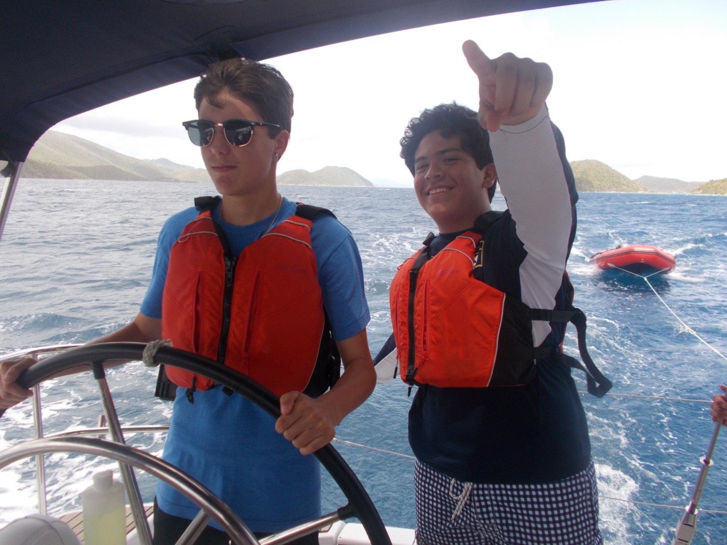 My first job today was the challenge of getting the boat off of the dock. After we got out of the marina, we put up our sails for the first time to head to our first destination: Cooper Island, led by our navigator Emma. After three hours of constant tacking and learning had to sail, we got to Cooper Island and had a swim test, which was to swim six laps around the boat and tread water for 10 minutes. After we had peanut butter and jelly sandwiches for lunch and saw a huge sea turtle! Then we continued sailing to our final destination, Savanna Bay, where we will eat sloppy Joe’s and learn about our scuba gear and get ready to start diving tomorrow.
