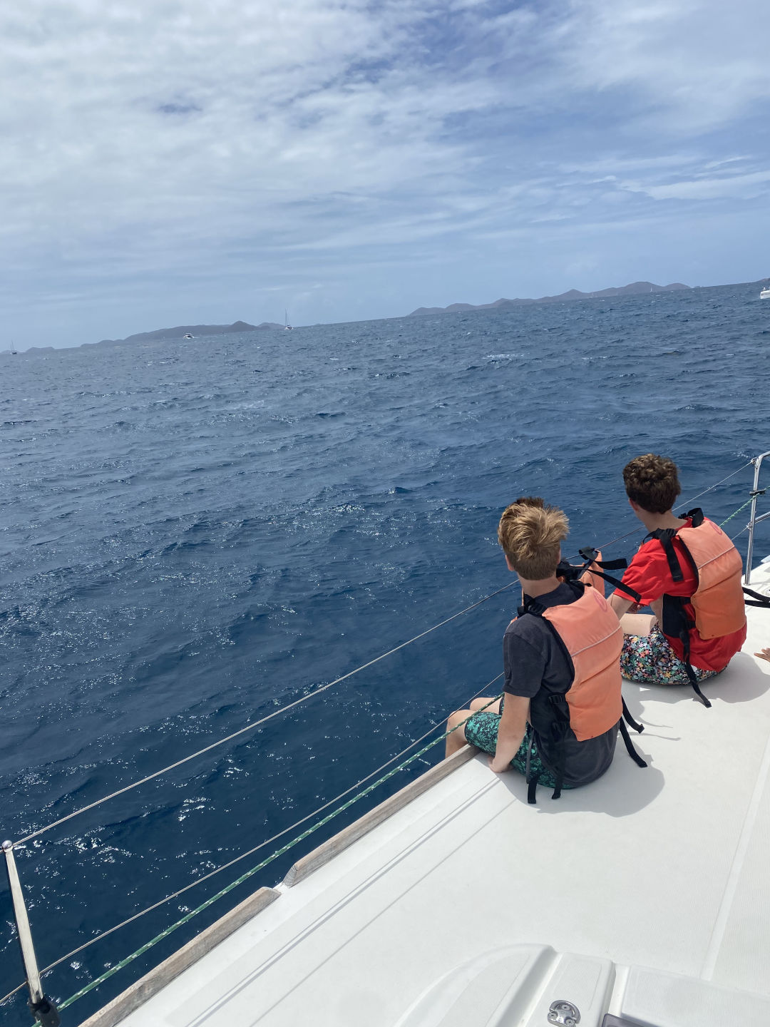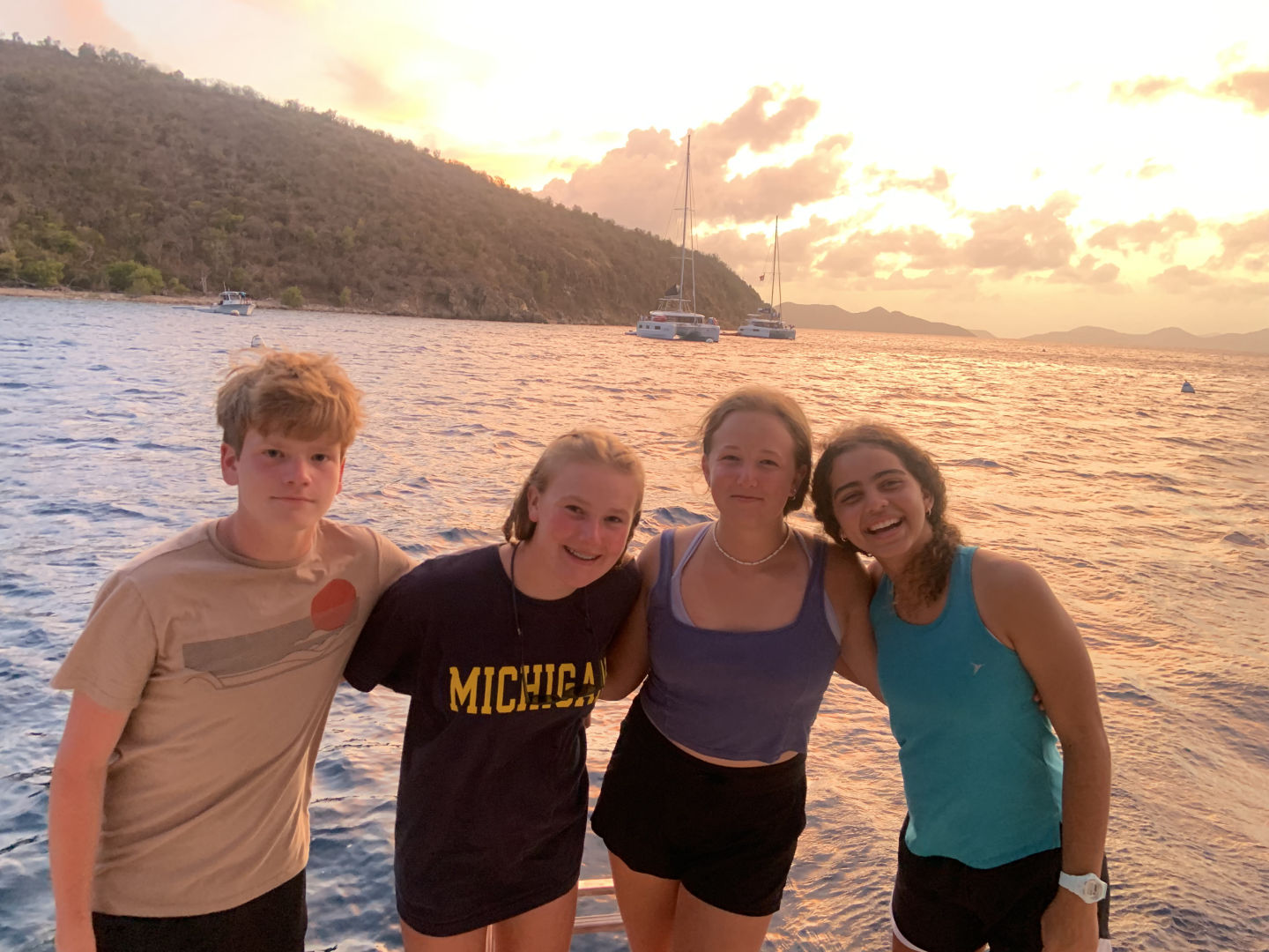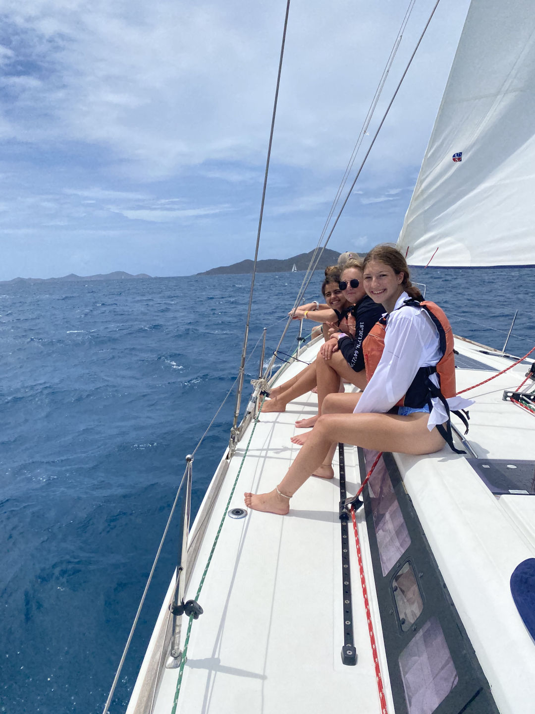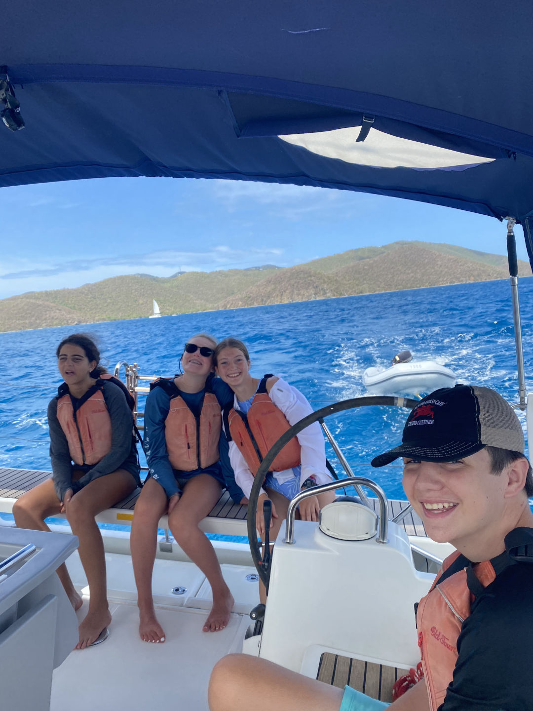 This morning we started with a 7:30 am wake-up after staying up late the night before talking and getting to know each under the stars. Then, we did our first sail to Norman Island! We learned how to rig the boat and worked on our tacks. Noah was our first skipper, then Violet, Johnathan, and I each took over the helm. For the returning AQ students, we enjoyed getting to sailing again, and the whole crew had a ton of fun learning how to sail. After mooring at Norman Island, we ate lunch, and all passed our swim test (6 laps around the boat and 10 minutes treading water). In the afternoon, we snorkeled in the caves and saw a turtle. We had some time to relax, and Audrey, Ana, and Sophie made friendship bracelets. Then, Alex and Johnathan cooked a delicious dinner of Sloppy Joe’s and mashed potatoes. We ended the day with a dance party and a game of cards.