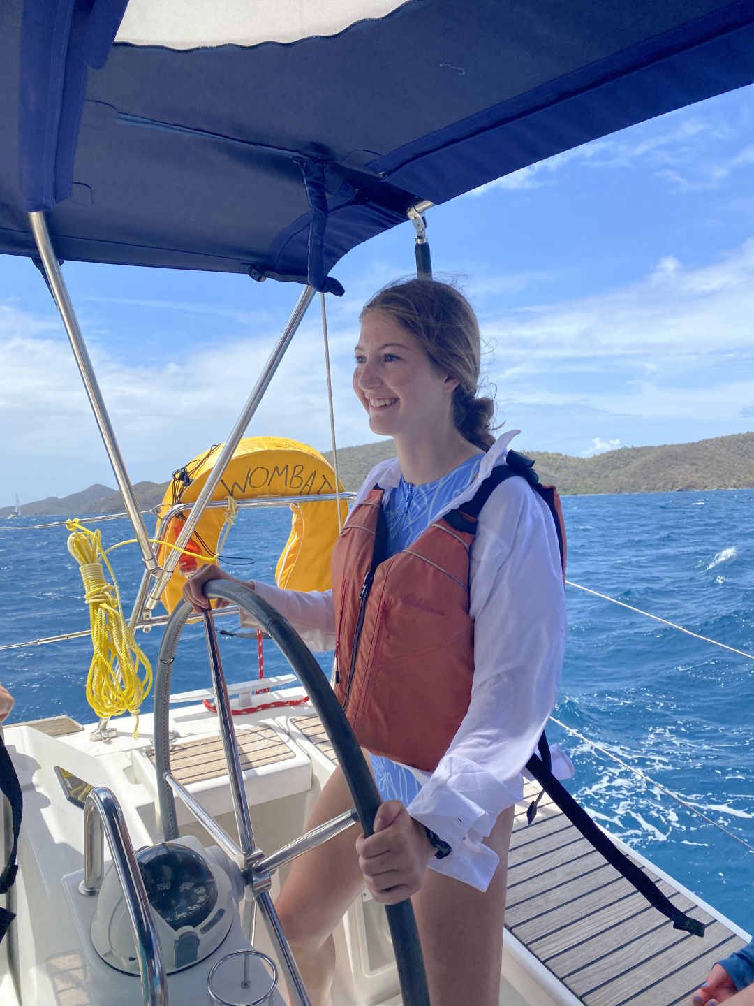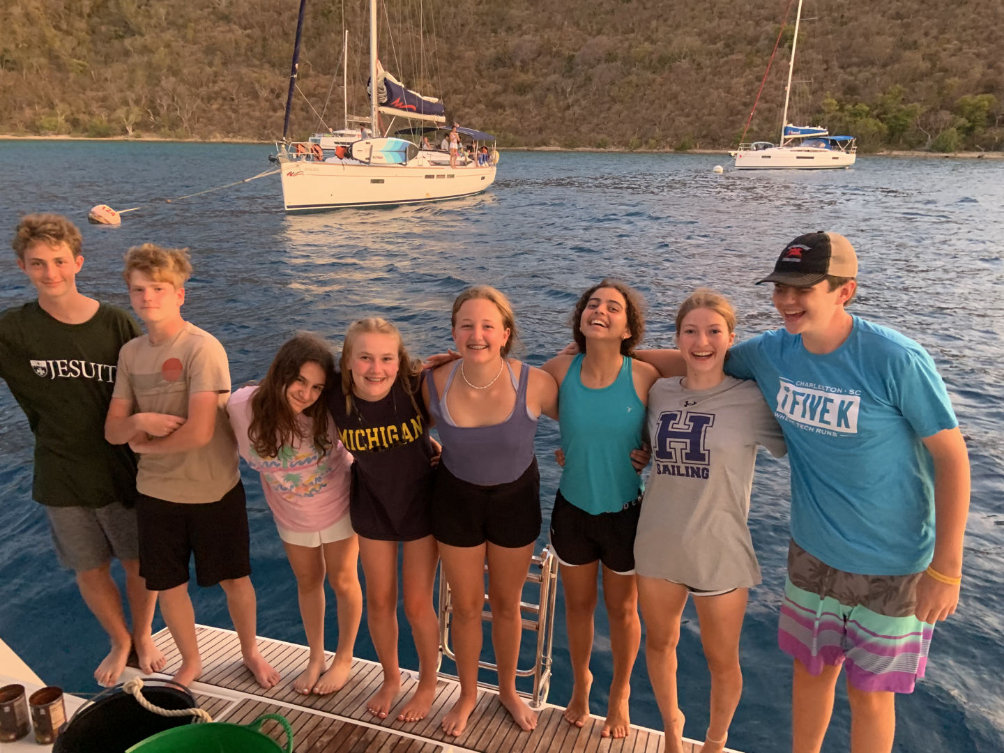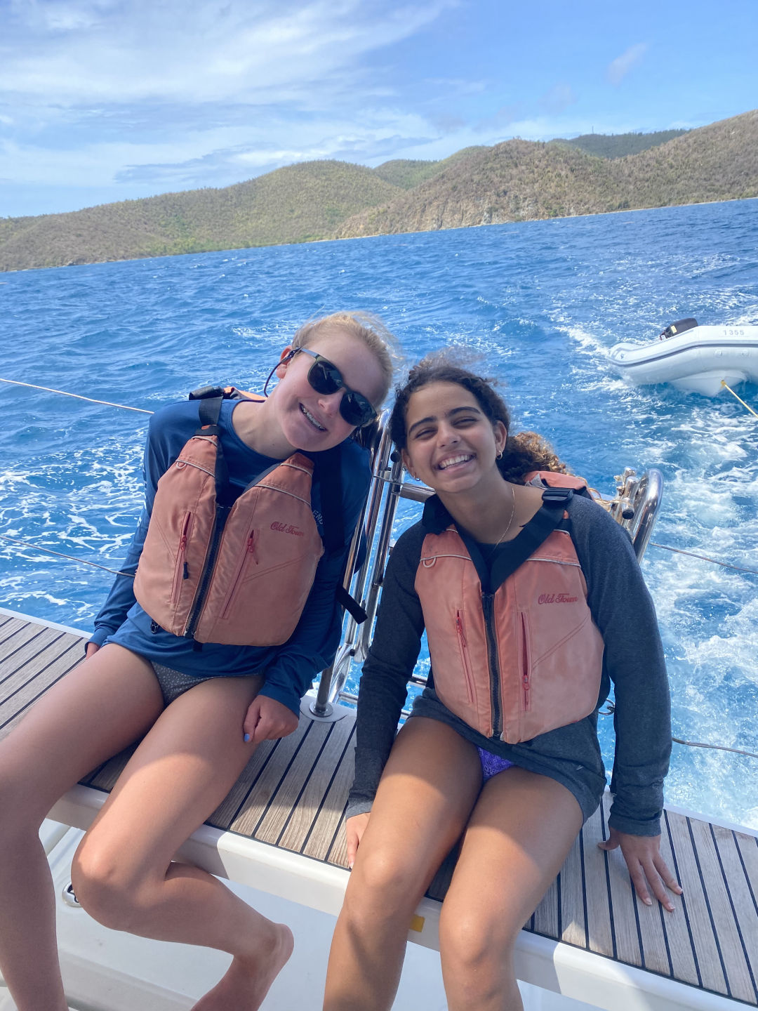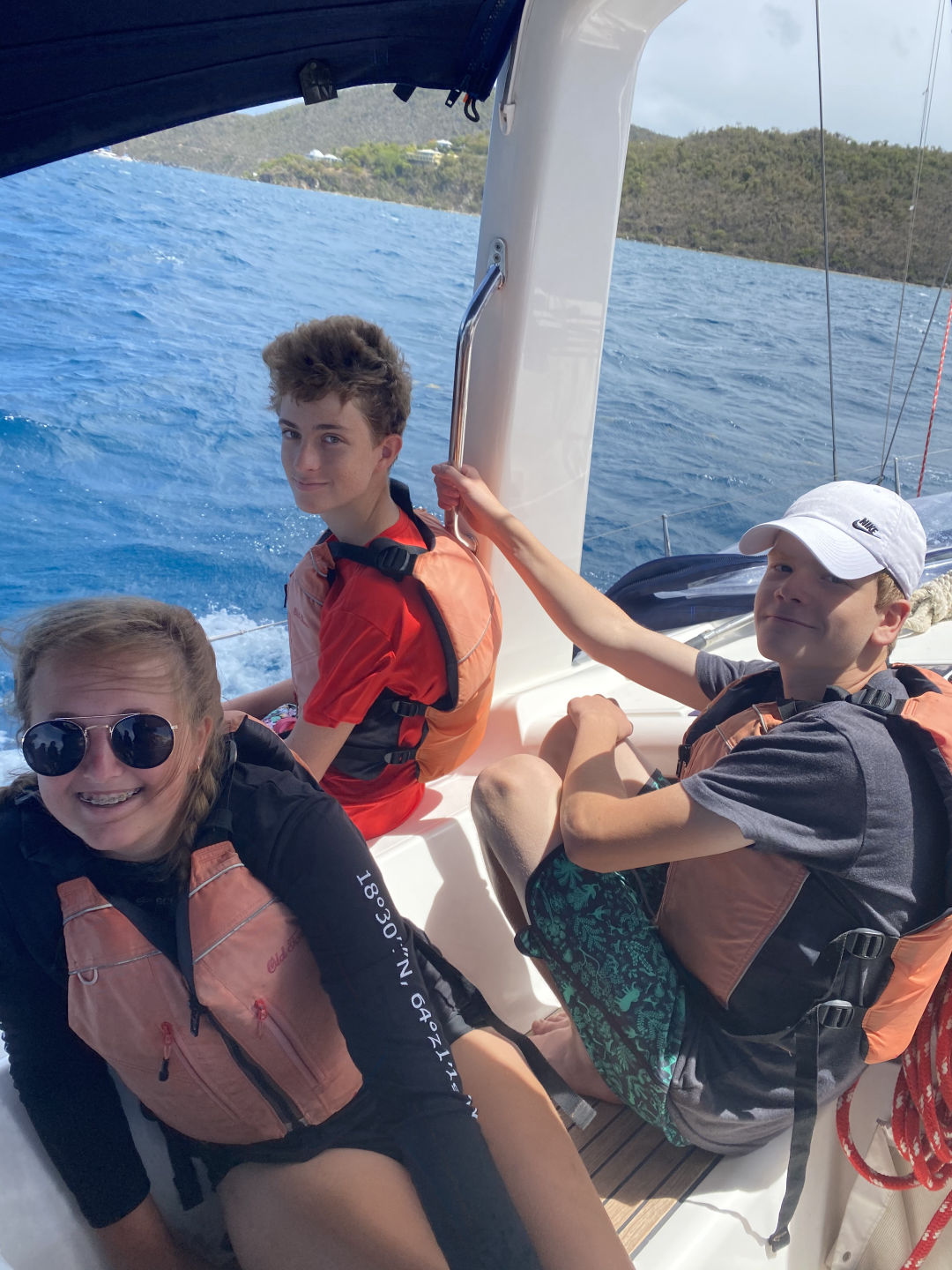 This morning we started with a 7:30 am wake-up after staying up late the night before talking and getting to know each under the stars. Then, we did our first sail to Norman Island! We learned how to rig the boat and worked on our tacks. Noah was our first skipper, then Violet, Johnathan, and I each took over the helm. For the returning AQ students, we enjoyed getting to sailing again, and the whole crew had a ton of fun learning how to sail. After mooring at Norman Island, we ate lunch, and all passed our swim test (6 laps around the boat and 10 minutes treading water). In the afternoon, we snorkeled in the caves and saw a turtle. We had some time to relax, and Audrey, Ana, and Sophie made friendship bracelets. Then, Alex and Johnathan cooked a delicious dinner of Sloppy Joe’s and mashed potatoes. We ended the day with a dance party and a game of cards.
