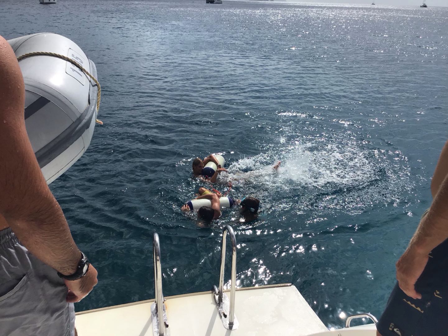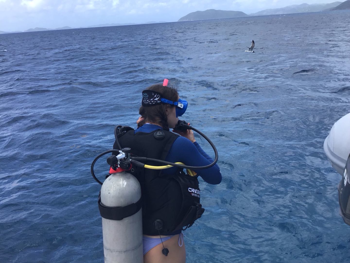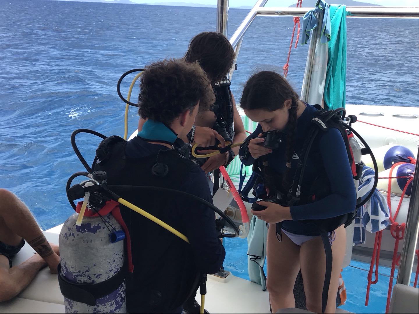 Nevertheless, the lack of eye-catching marine animals was totally made up for by taking pictures of Gene lying on a towel on the ocean floor. Once we surfaced and got back on the boat, we were greeted by some muffins that Ri cooked up, and we had a little while to chill as we moved across the corner of the island to get to our (highly anticipated) next dive spot: The Sharkplanes. This dive actually hit two birds with one stone because we started it off by practicing some navigational skills with our buddies before going off and exploring the sunken shark-shaped airplanes. Between pretending to bull-ride each other underwater and dancing during our safety stop, this dive was really eventful. Also, we managed to see a decently-sized stingray and a nurse shark, which a couple of people had on their fish wishlists. After the dive, we munched on some chicken salad wraps, but Liam and River inevitably went rogue and snuck some peanut butter, onions, and cheese into their chicken salad wraps. Next, while sailing back to Mountain Point, we had a brief knot workshop, where Lindsay and Gene walked us through the knots we needed to know how to tie for our search-and-recovery dives. Upon blazing arrival back at Mountain Point, we broke into four intense rescue scenarios where half of the boat would be in the water, acting as a tired, unconscious, or panicked diver.