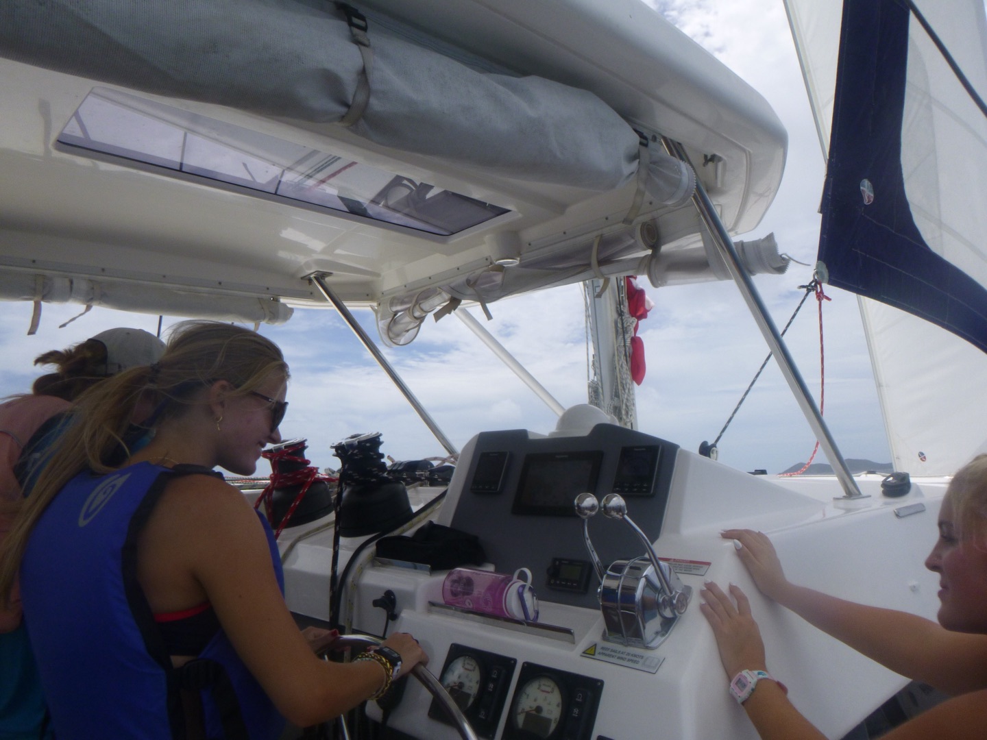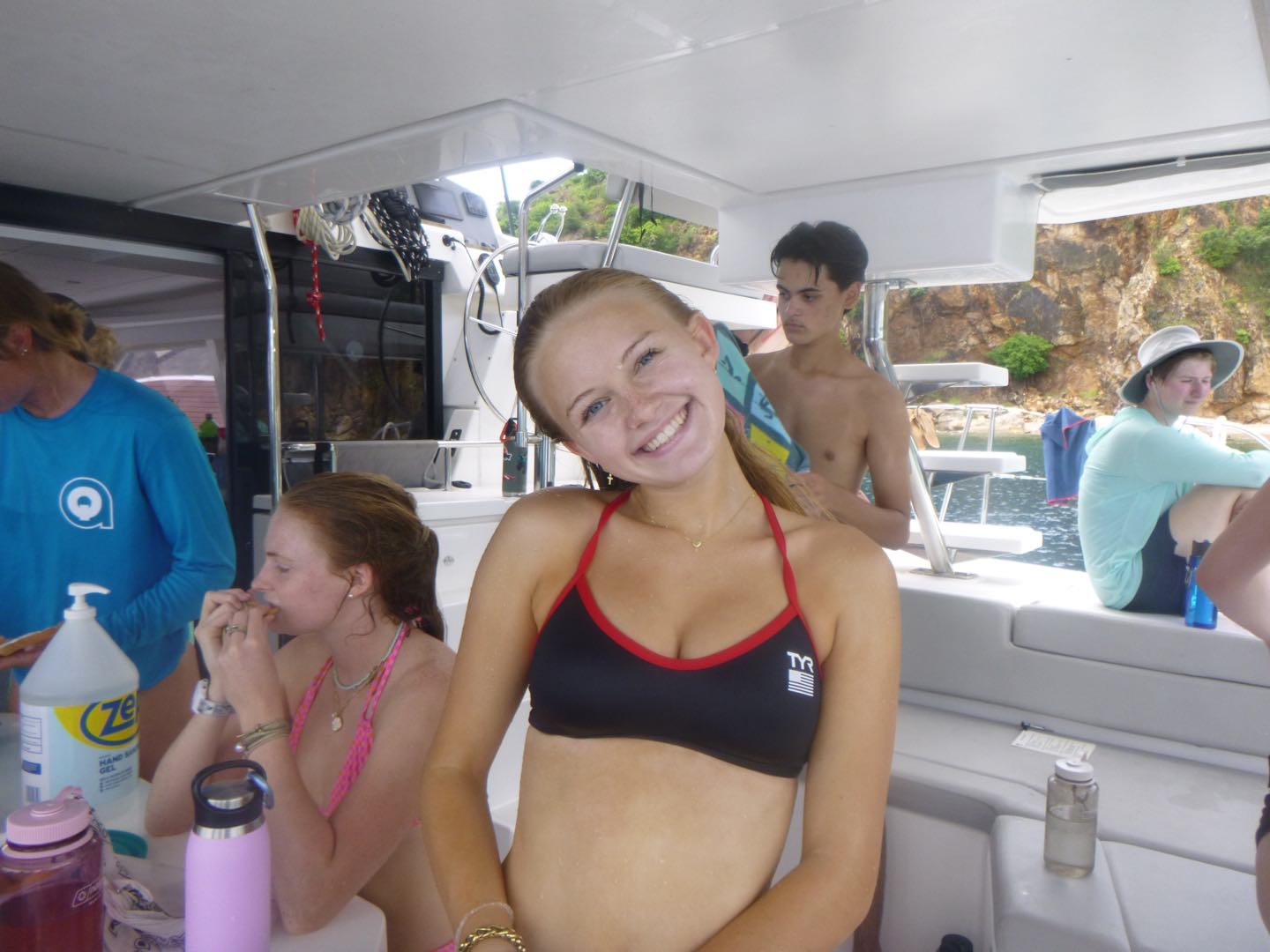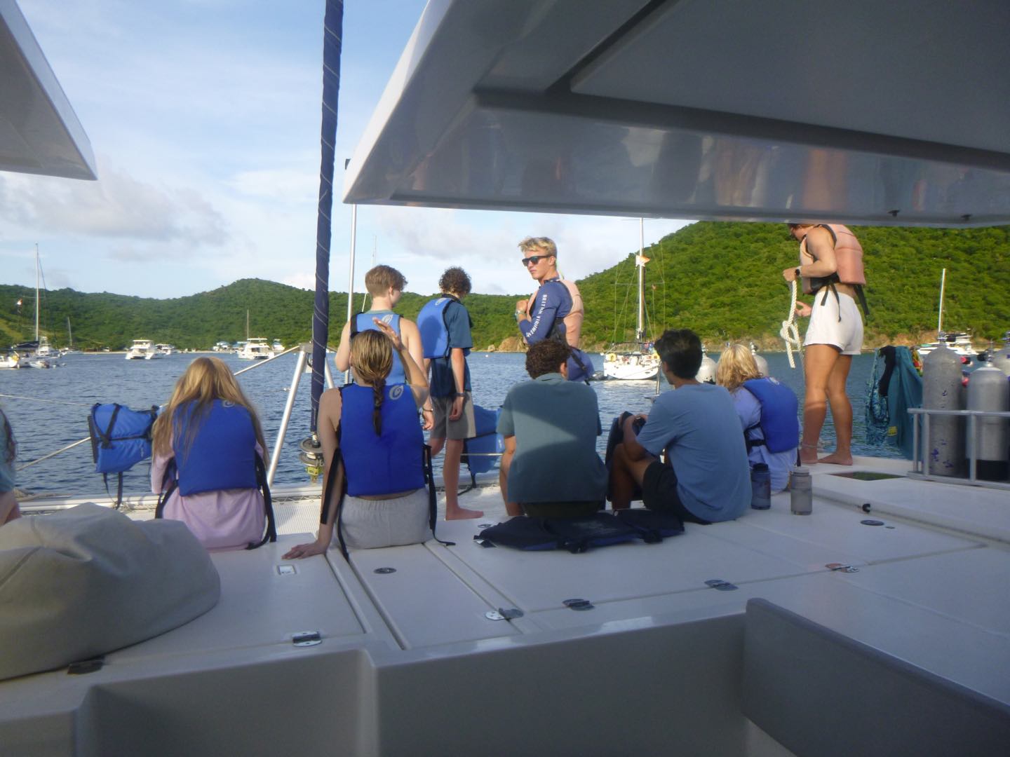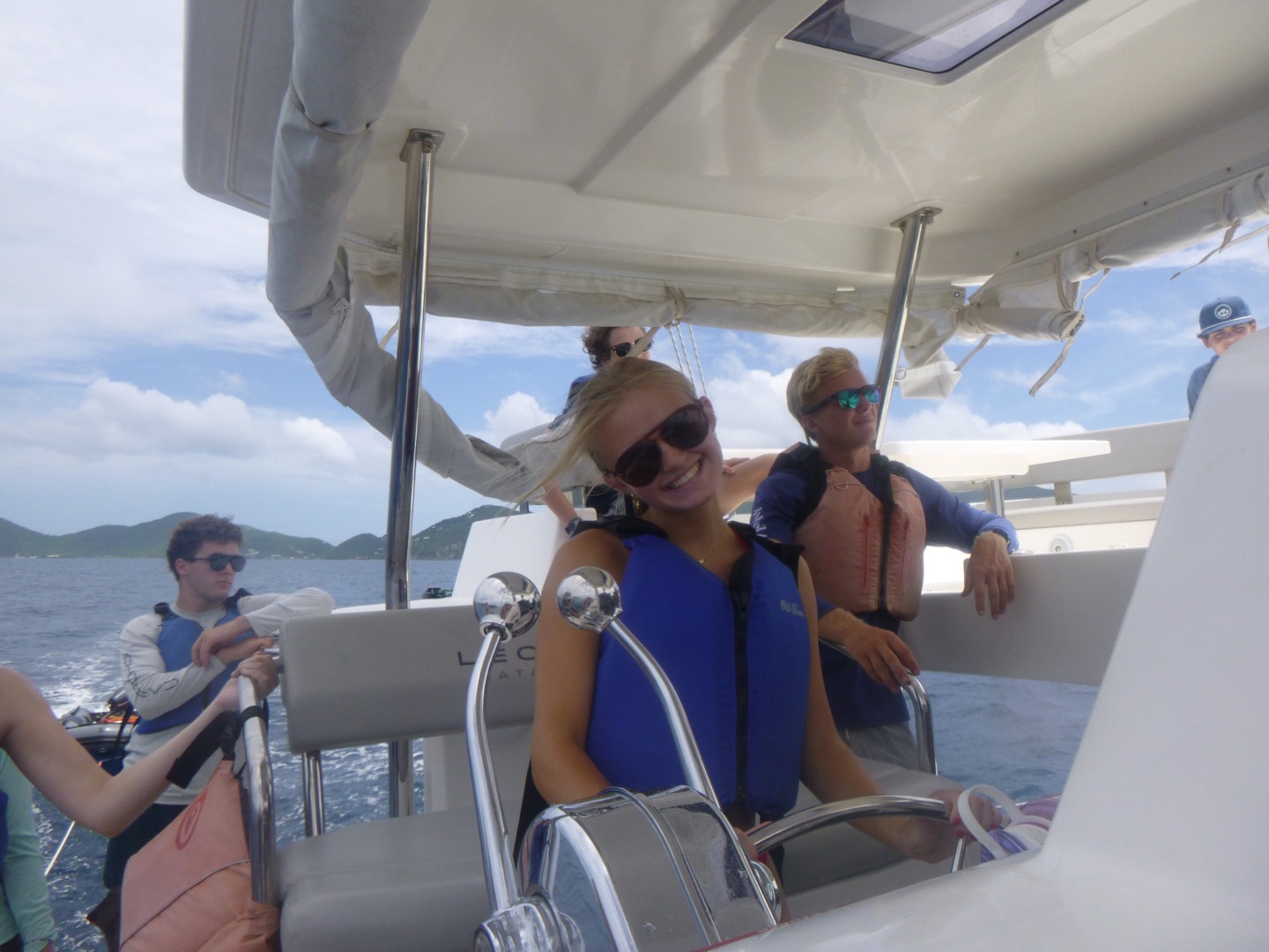 Everyone on Grayteful got woken up with some fun music this morning, thanks to our amazing staff member,r India. Our chefs for the day, Ty and Micah, got the cereal out so we could have a quick breakfast before we headed to Pusser’s for the fleet meeting. Mike talked us through the protocols and sent us on our way to our first sail of the trip! We got our PFDs assigned to all of us and then headed out. Macy, August, Madeline, and Annika got the chance to learn some helmsmen skills while the other Vega students helped with the sheets. We were able to reach full sail while underway!!! While they were having fun, the dive master candidates (Ty, Alexis, Scott, and I) got to watch a PADI video, “Yay.”