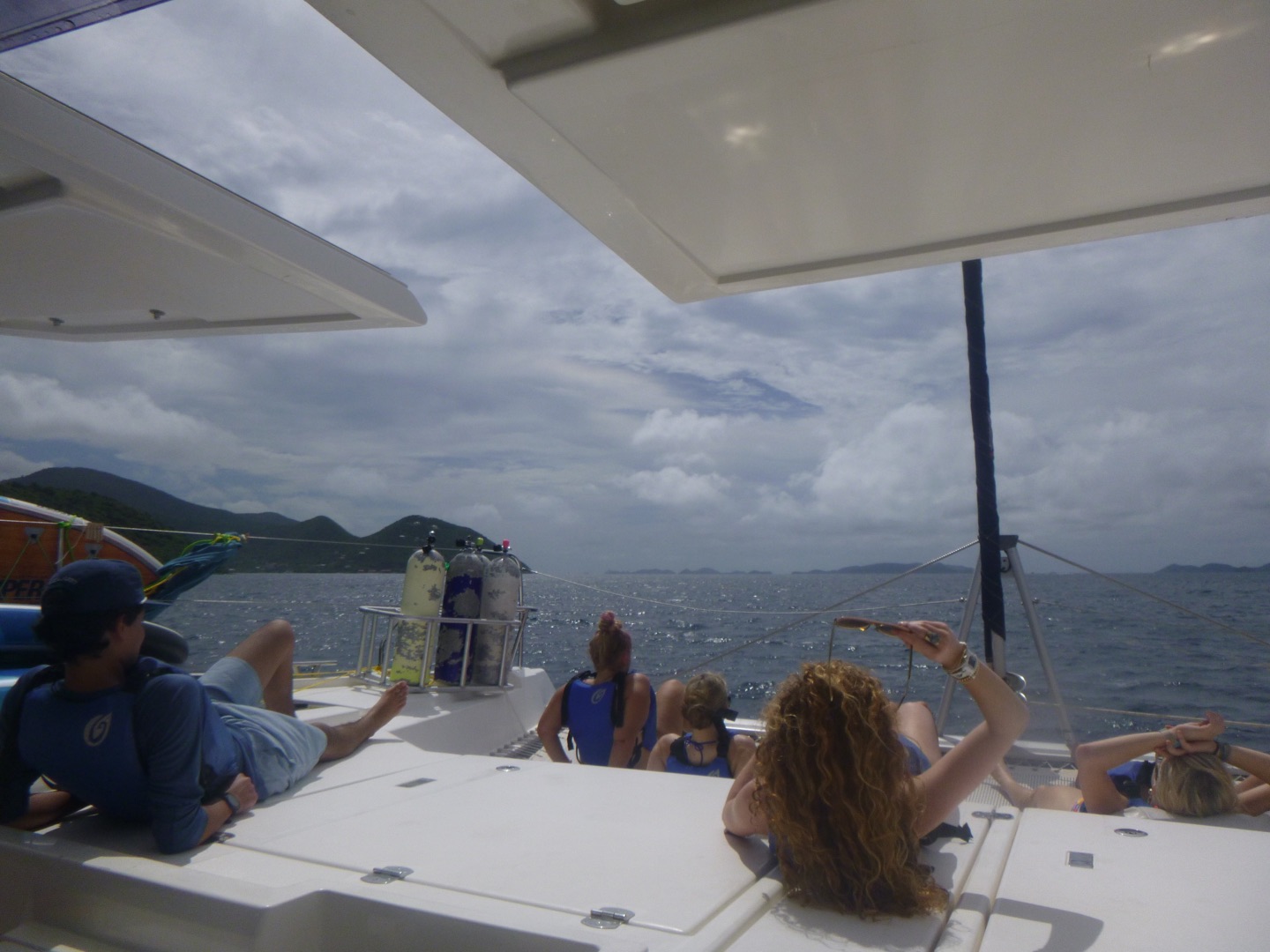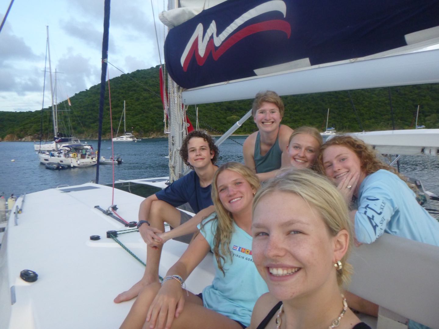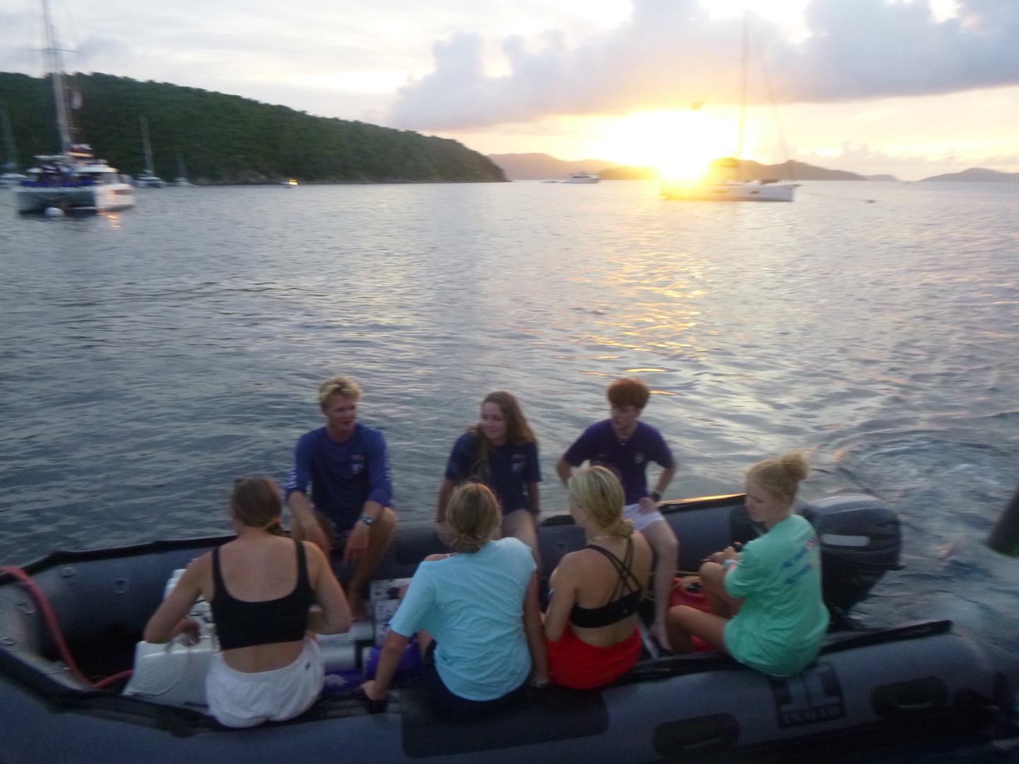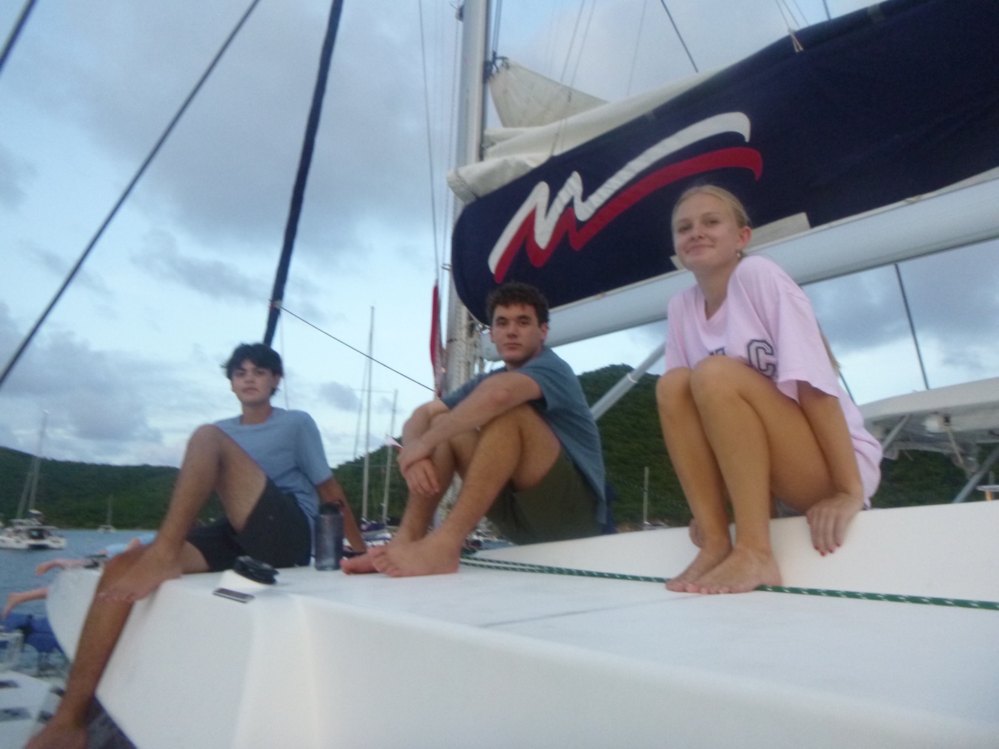 Everyone on Grayteful got woken up with some fun music this morning, thanks to our amazing staff member,r India. Our chefs for the day, Ty and Micah, got the cereal out so we could have a quick breakfast before we headed to Pusser’s for the fleet meeting. Mike talked us through the protocols and sent us on our way to our first sail of the trip! We got our PFDs assigned to all of us and then headed out. Macy, August, Madeline, and Annika got the chance to learn some helmsmen skills while the other Vega students helped with the sheets. We were able to reach full sail while underway!!! While they were having fun, the dive master candidates (Ty, Alexis, Scott, and I) got to watch a PADI video, “Yay.”