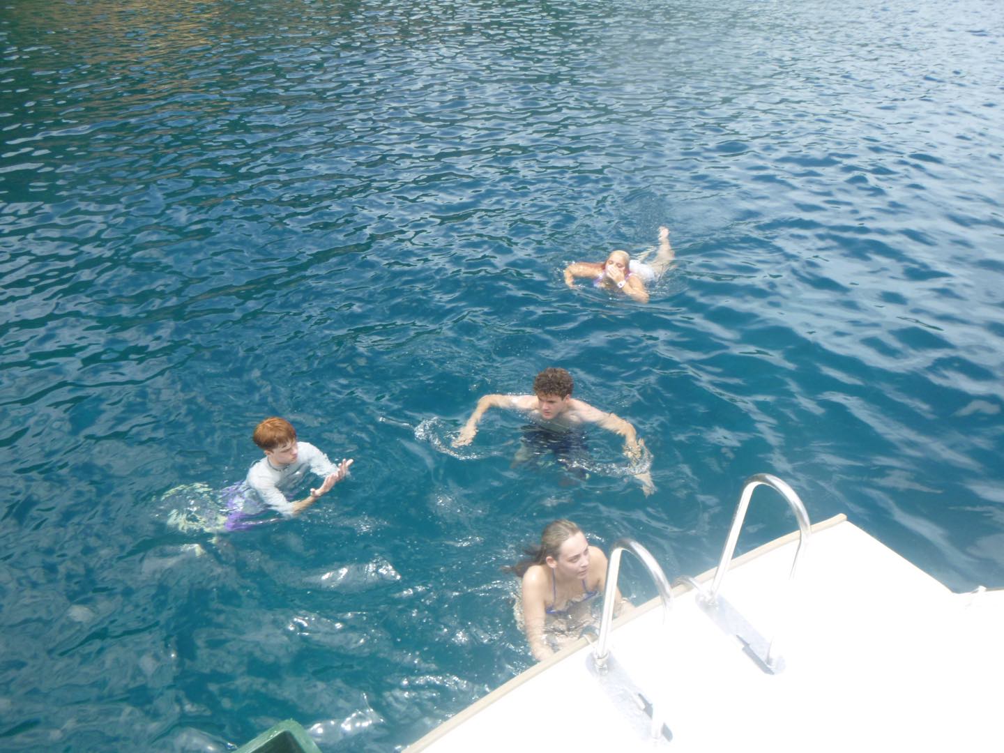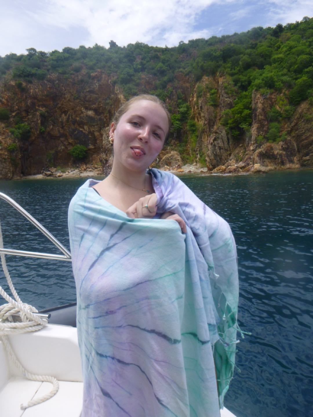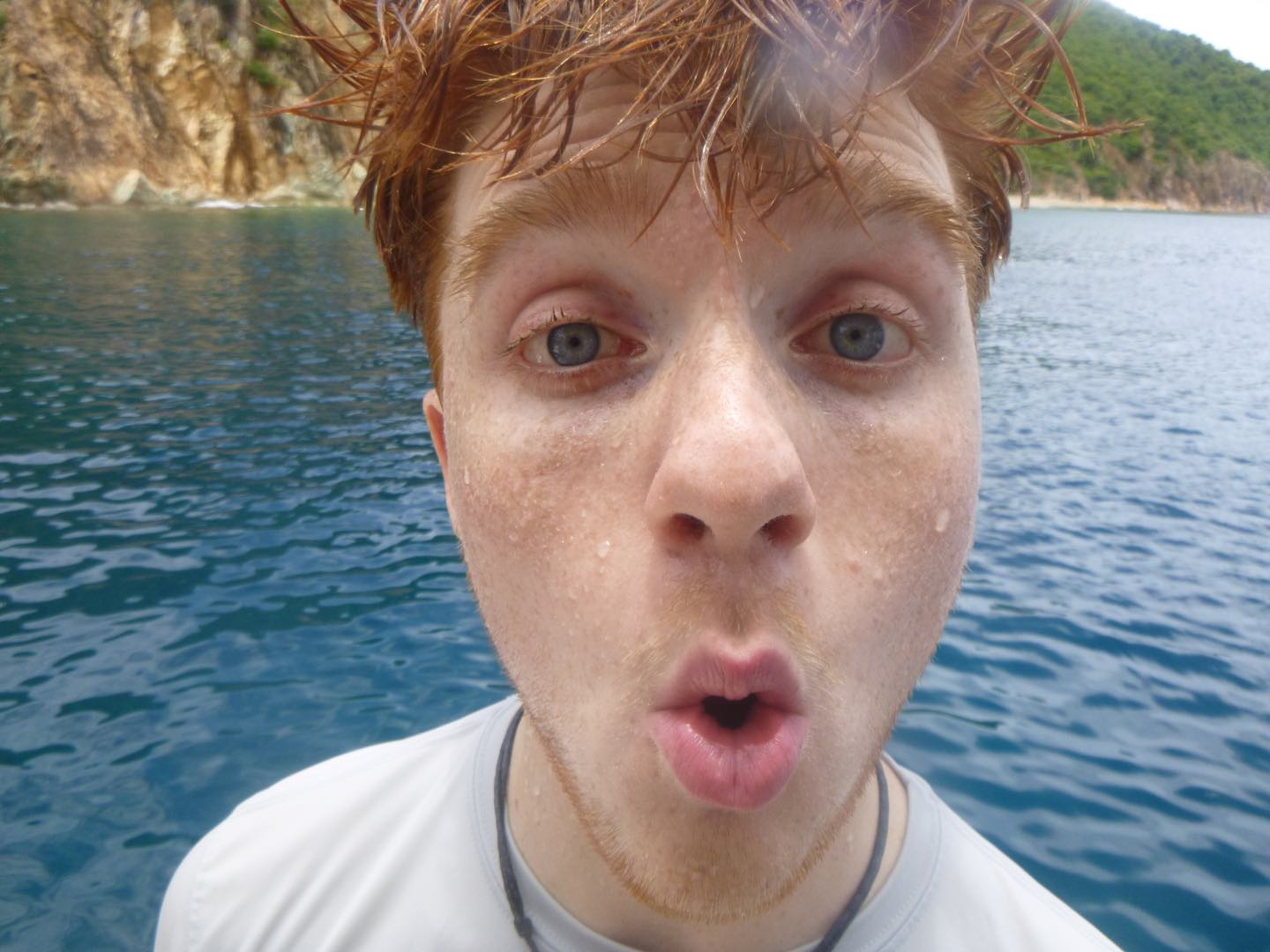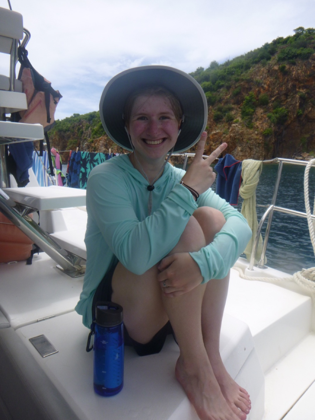 Everyone on Grayteful got woken up with some fun music this morning, thanks to our amazing staff member,r India. Our chefs for the day, Ty and Micah, got the cereal out so we could have a quick breakfast before we headed to Pusser’s for the fleet meeting. Mike talked us through the protocols and sent us on our way to our first sail of the trip! We got our PFDs assigned to all of us and then headed out. Macy, August, Madeline, and Annika got the chance to learn some helmsmen skills while the other Vega students helped with the sheets. We were able to reach full sail while underway!!! While they were having fun, the dive master candidates (Ty, Alexis, Scott, and I) got to watch a PADI video, “Yay.”