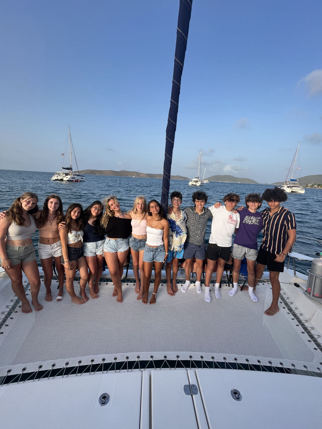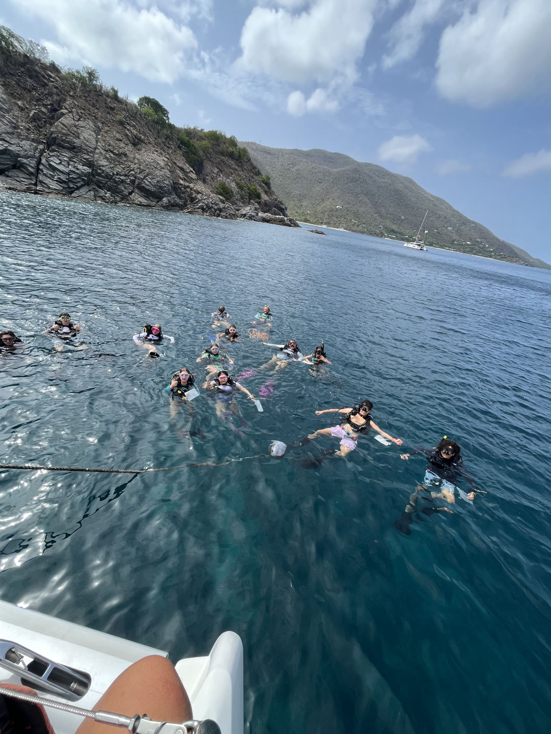 We started the day with an amazing breakfast of French toast, thanks to our wonderful chefs Gabe and also Camille. Right after we finished breakfast, we completed our second underwater naturalist dive in which we had to find symbiotic relationships among the aquatic life we saw on our dive, such as lots of parrot fish, wrasse, butterfly fish, and trumpet fish. After our dive, we sailed over to Leverick Island, where we spent some time on shore. After our shore time, we sailed to a nearby beach and met up with other boats to play volleyball. Owen, Eric, Hugh, Sophia, Ana, and I spent some time at the shore while Alivia, Camille, Sasha, Rina, and Ellie stayed on the boat and swam. Now, we are getting ready to go to our weekly BBQ with the other boats!