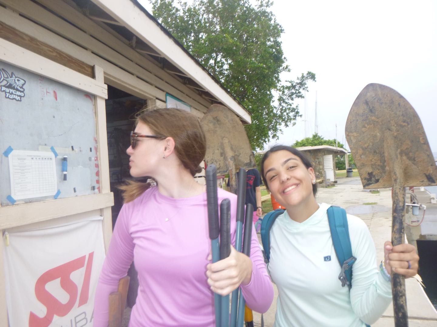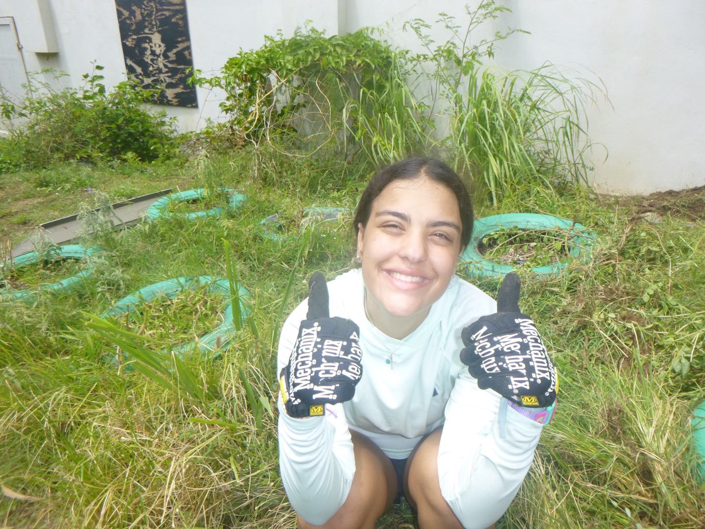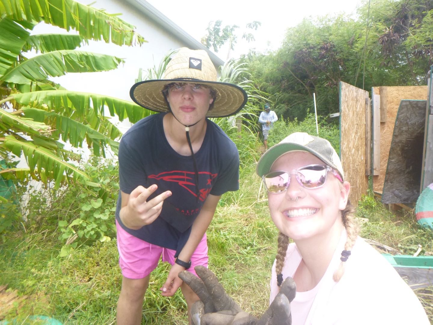 Today was our first day of service projects on the island! We woke up early and had yogurt and bagels for breakfast before heading to the dock. We worked in a garden at a local school in Virgin Gorda for a youth outreach project. We put up fences, pulled out weeds, and tidied up the area. After a few hours, we stopped for lunch, which was peanut butter and jelly sandwiches, and then we fed some tortoises and spotted some chickens. Prentice tried and failed to catch a chicken with his lunch but Grace got a nice cute flick (which you can see below). After lunch, Grace, Augusta, and I dug some nice holes to plant grape trees, and we put up trellises to support the grape vines and the passion fruit growing in the garden. We all got to taste some fresh sugar cane. We were all happy to have a bathroom on land and some cold, fresh water. After we finished up, we headed to get some ice cream which was very yummy. We took the dinghy back to the boat and jumped in the water to clean up and cool off. After that, Hayes and Violet made beef stroganoff with garlic bread and salad for dinner, and we settled in for a chill evening after clean up. Prentice and Addison washed the dishes, Grace cleaned off the deck, and everyone else tidied up. BYE!