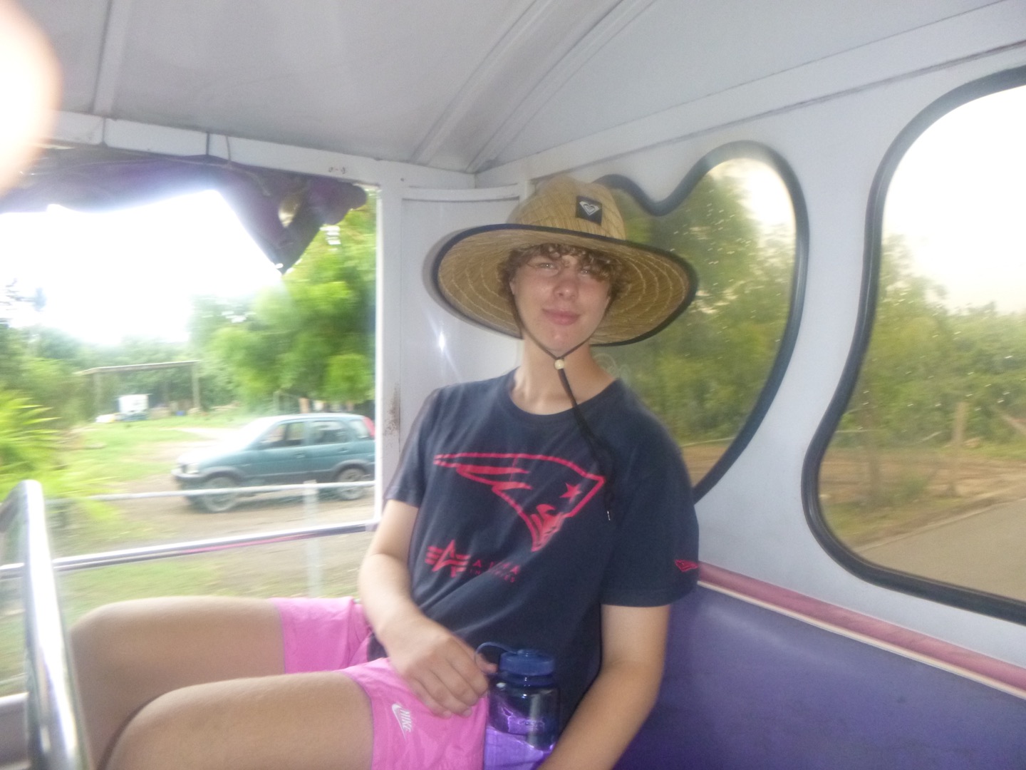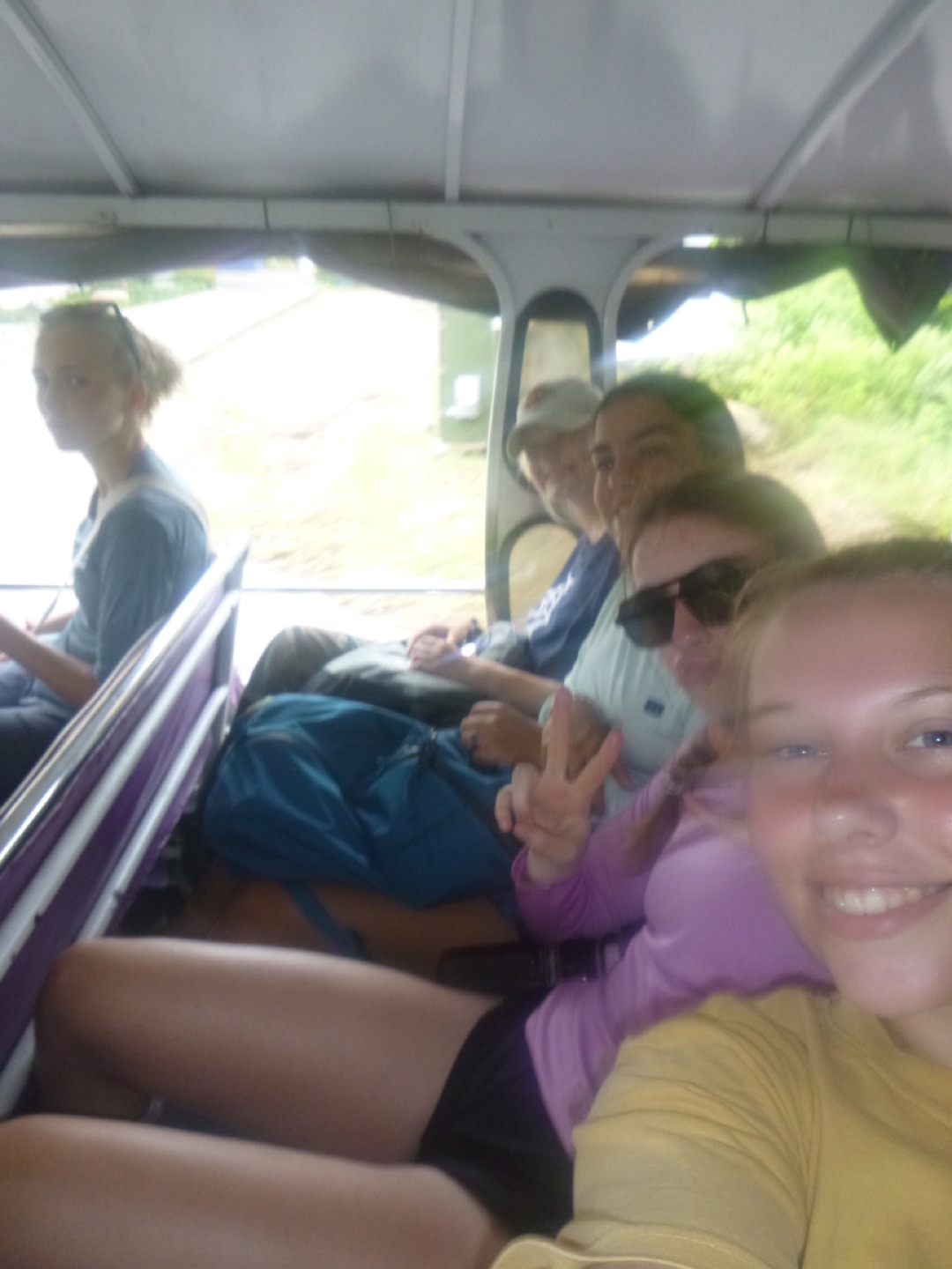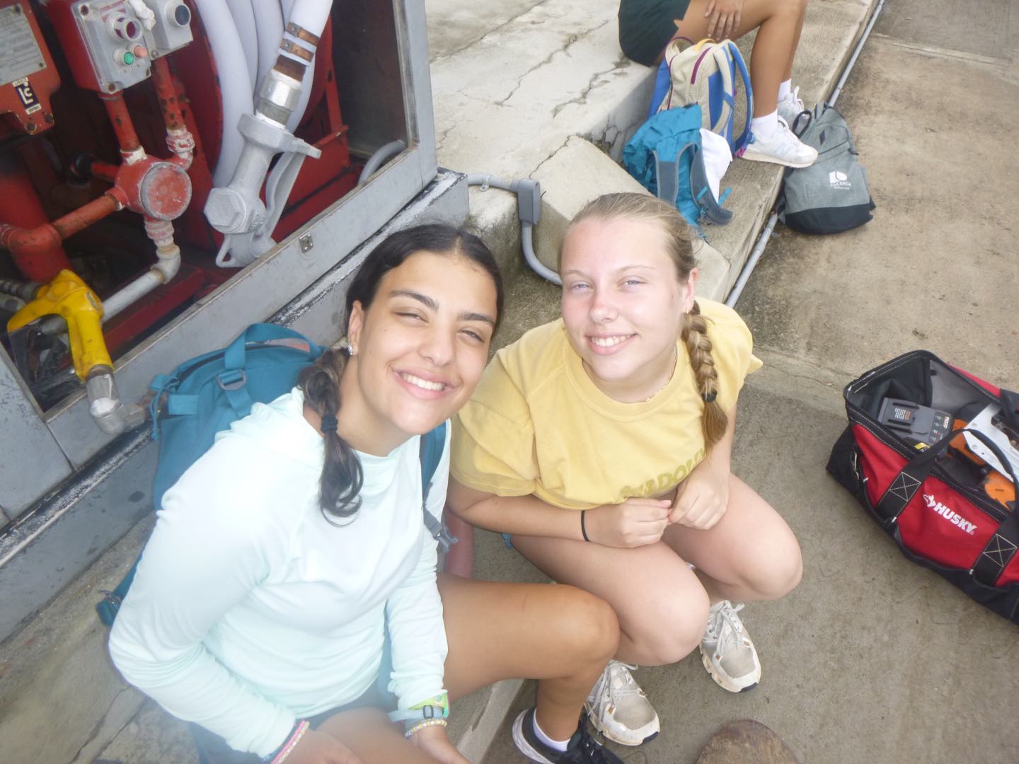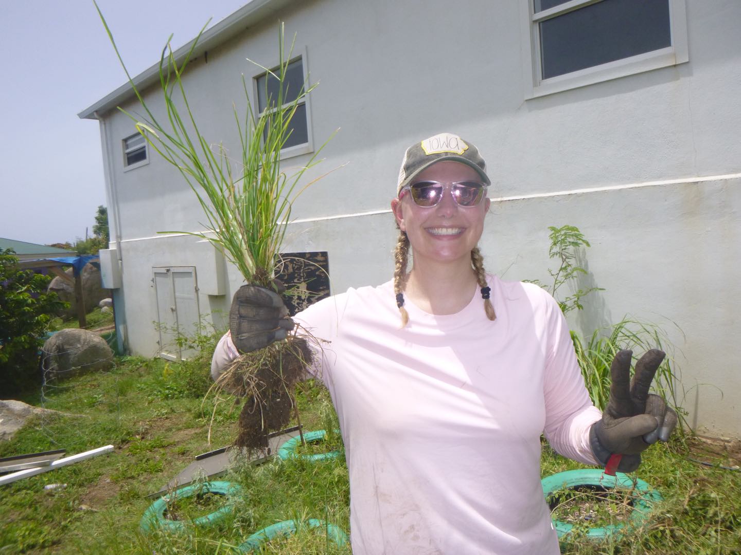 Today was our first day of service projects on the island! We woke up early and had yogurt and bagels for breakfast before heading to the dock. We worked in a garden at a local school in Virgin Gorda for a youth outreach project. We put up fences, pulled out weeds, and tidied up the area. After a few hours, we stopped for lunch, which was peanut butter and jelly sandwiches, and then we fed some tortoises and spotted some chickens. Prentice tried and failed to catch a chicken with his lunch but Grace got a nice cute flick (which you can see below). After lunch, Grace, Augusta, and I dug some nice holes to plant grape trees, and we put up trellises to support the grape vines and the passion fruit growing in the garden. We all got to taste some fresh sugar cane. We were all happy to have a bathroom on land and some cold, fresh water. After we finished up, we headed to get some ice cream which was very yummy. We took the dinghy back to the boat and jumped in the water to clean up and cool off. After that, Hayes and Violet made beef stroganoff with garlic bread and salad for dinner, and we settled in for a chill evening after clean up. Prentice and Addison washed the dishes, Grace cleaned off the deck, and everyone else tidied up. BYE!