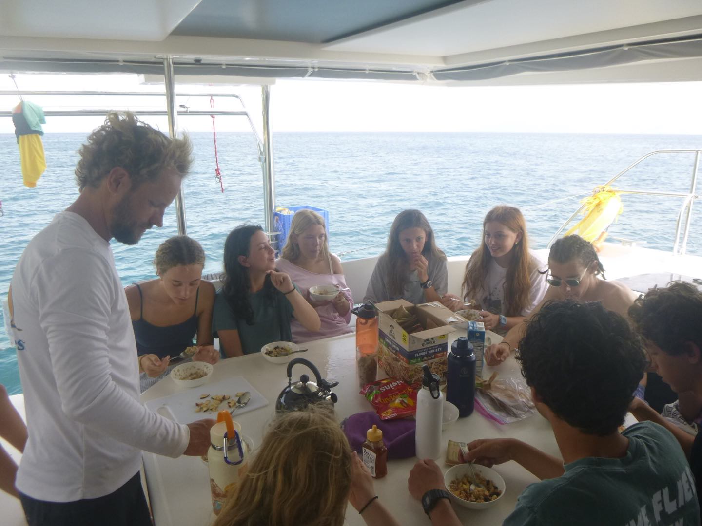 Then, having to cross the tar again, where girl Ari (not boy Ari) fell victim to the mud, and Macie ended up breaking her “trusted” flip flops of many years 😪. After all of this we all got ready to dive a shipwreck. Gene gave us the entire backstory of the wreck; then we went diving. In the dive, we saw what was left of the sunken ship, which had many intriguing swim-throughs, many parrotfish 😏 and some very large lobsters. Unfortunately, there were no shark or apricot sightings🦈🍑. Some also say you could have seen the captain’s teaspoon in the wreck, but no teaspoons were spotted under the water today. We came back on the boat for lunch and had some mac and cheese 🍝🧀 and crumpets 🍪🐴. After lunch, we had some free time, and some of us went water skiing while the others stayed on the boat. Then we all came back and had dinner. Then got back in the water and went on our second night dive. When we got back, we had brownies, and now we’re about to go have our daily midnight chats.
