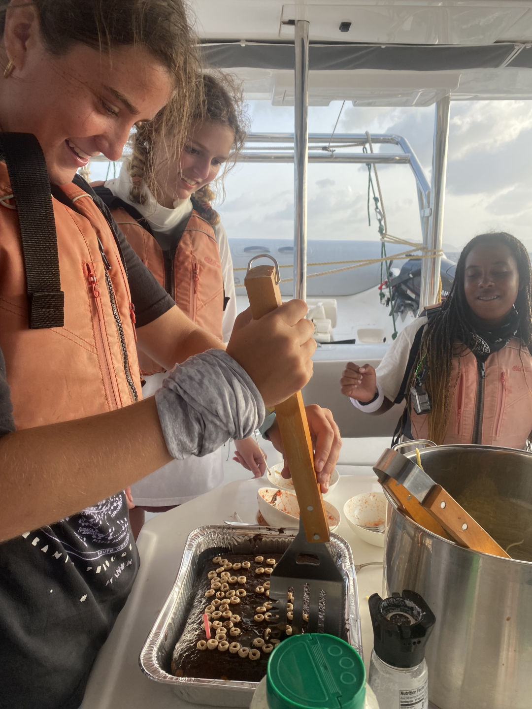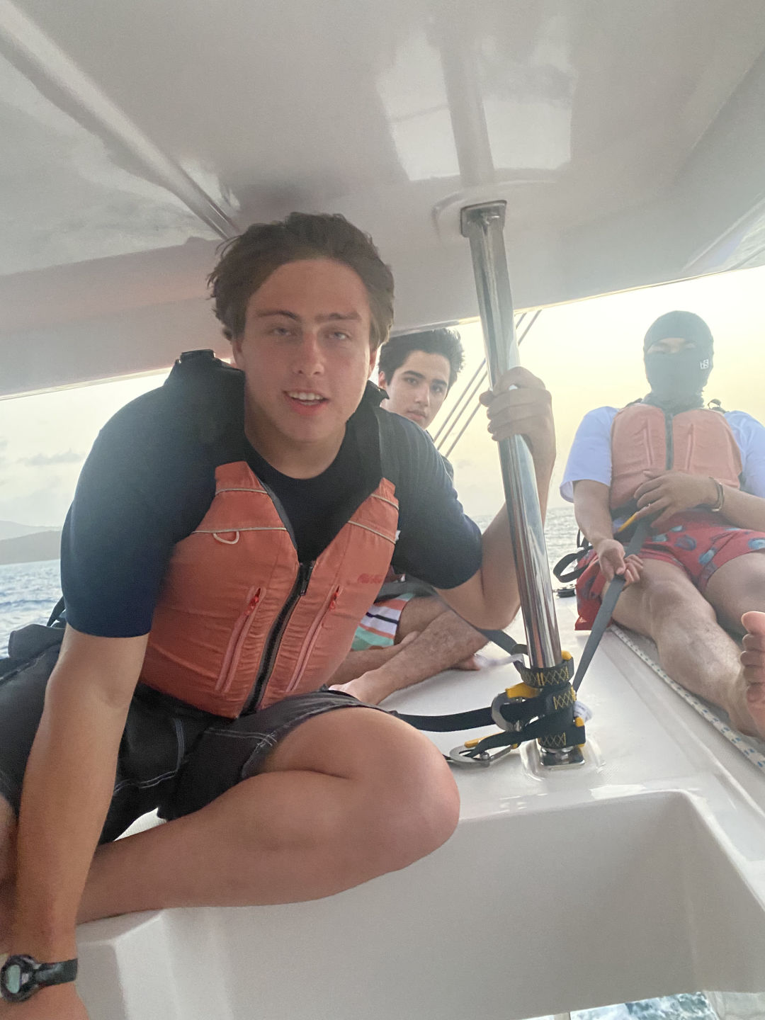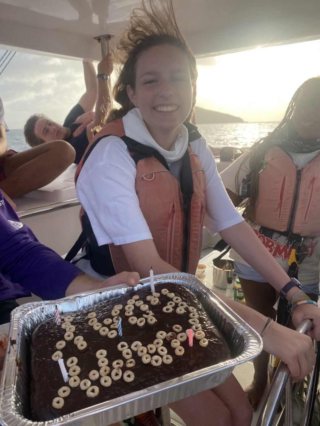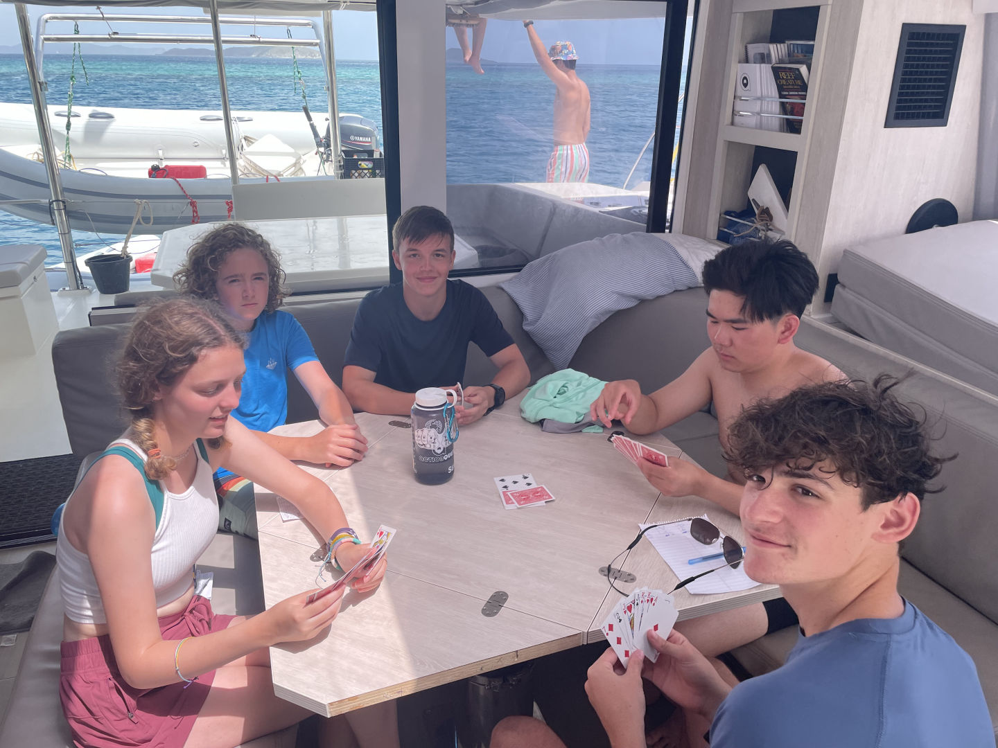 The day started with a wake-up call at 7 am. However, Mary and I woke up at 5:15 am to watch the sunrise for her birthday. Aidan and Matty P snuckily hung a Happy Birthday banner up in the salon, which was super sweet. After breakfast, we started our day with some water sports. While waiting for our turn to go out on the water, we had the opportunity to hang out with the other ship in our fleet, “Mary Lee”. We played a bunch of different card games, including Hearts and Spoons. Eventually, it was my turn to go out on the dinghy to try some cool sports. I got to try kneeboarding for the first time alongside Anno. It’s pretty much this board you kneel on. On the flip side, Ari and Ethan were pros.