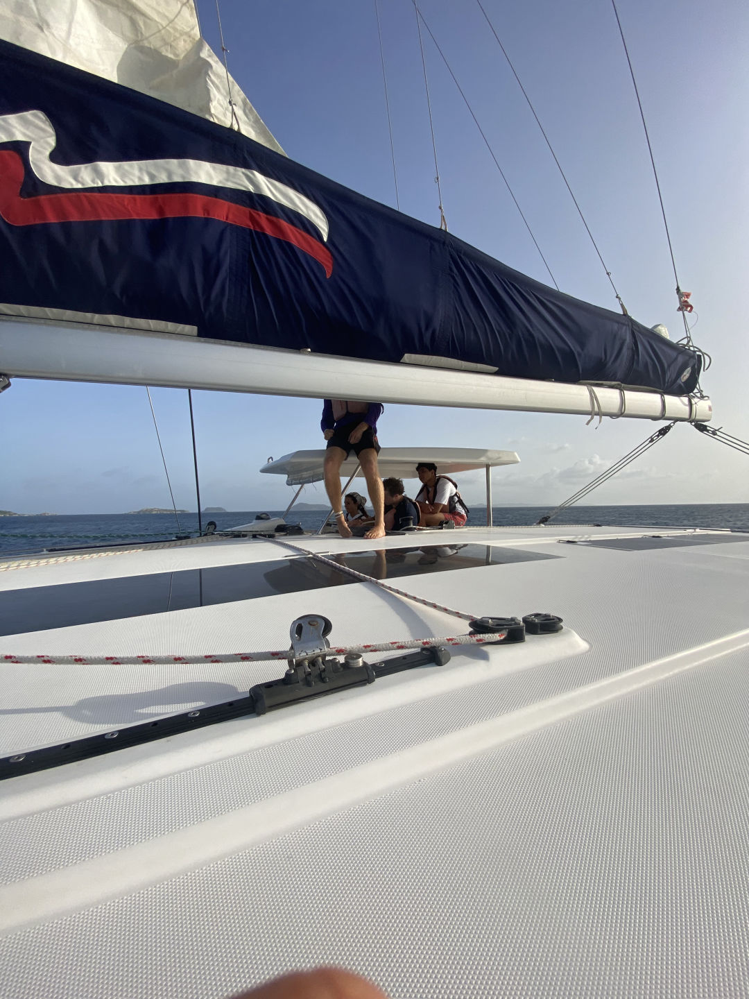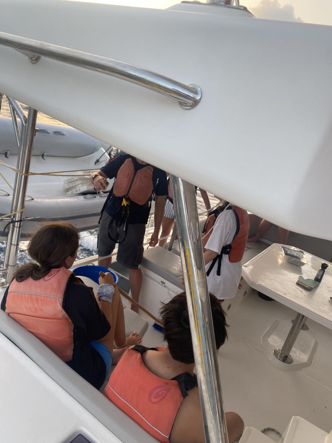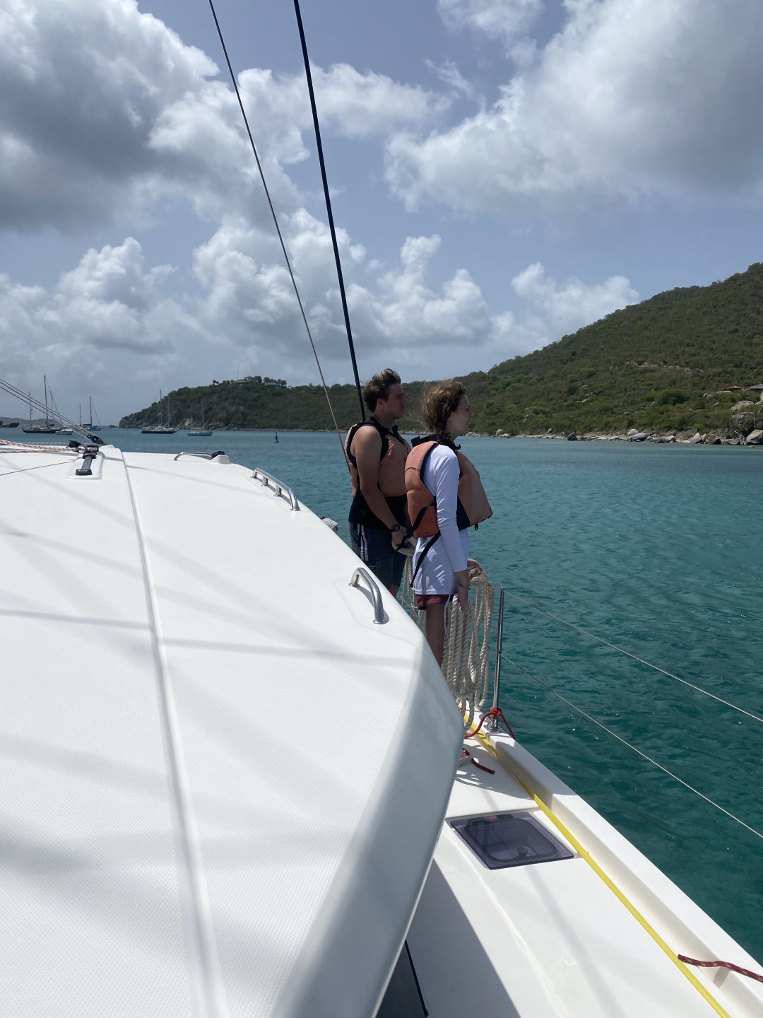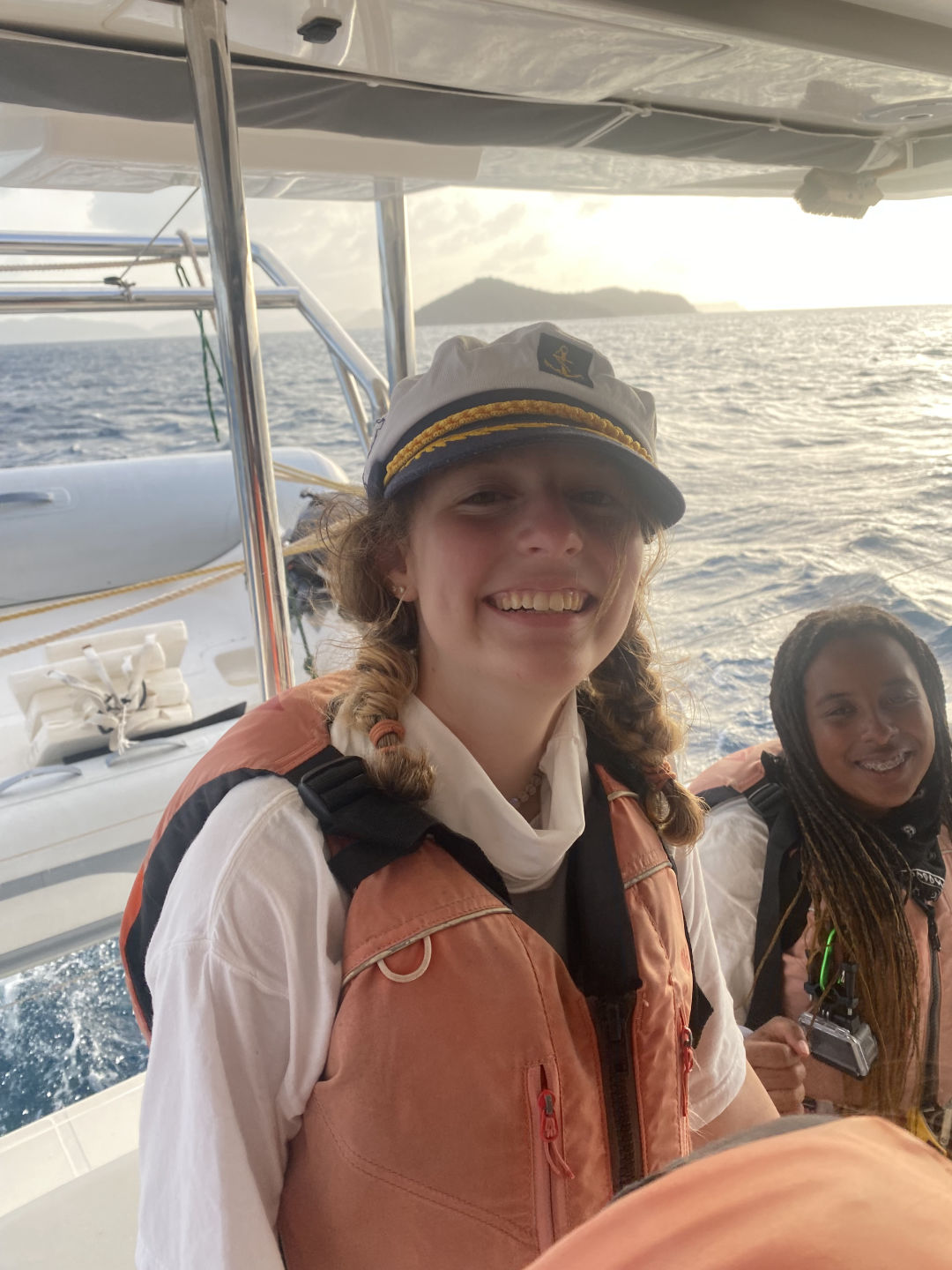 The day started with a wake-up call at 7 am. However, Mary and I woke up at 5:15 am to watch the sunrise for her birthday. Aidan and Matty P snuckily hung a Happy Birthday banner up in the salon, which was super sweet. After breakfast, we started our day with some water sports. While waiting for our turn to go out on the water, we had the opportunity to hang out with the other ship in our fleet, “Mary Lee”. We played a bunch of different card games, including Hearts and Spoons. Eventually, it was my turn to go out on the dinghy to try some cool sports. I got to try kneeboarding for the first time alongside Anno. It’s pretty much this board you kneel on. On the flip side, Ari and Ethan were pros.