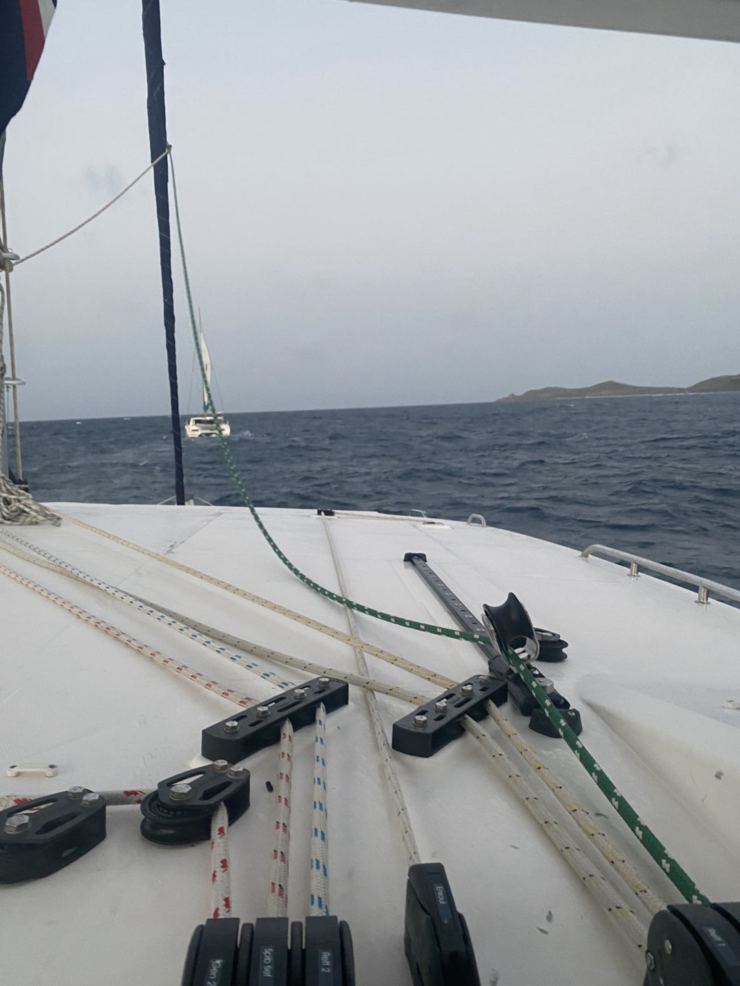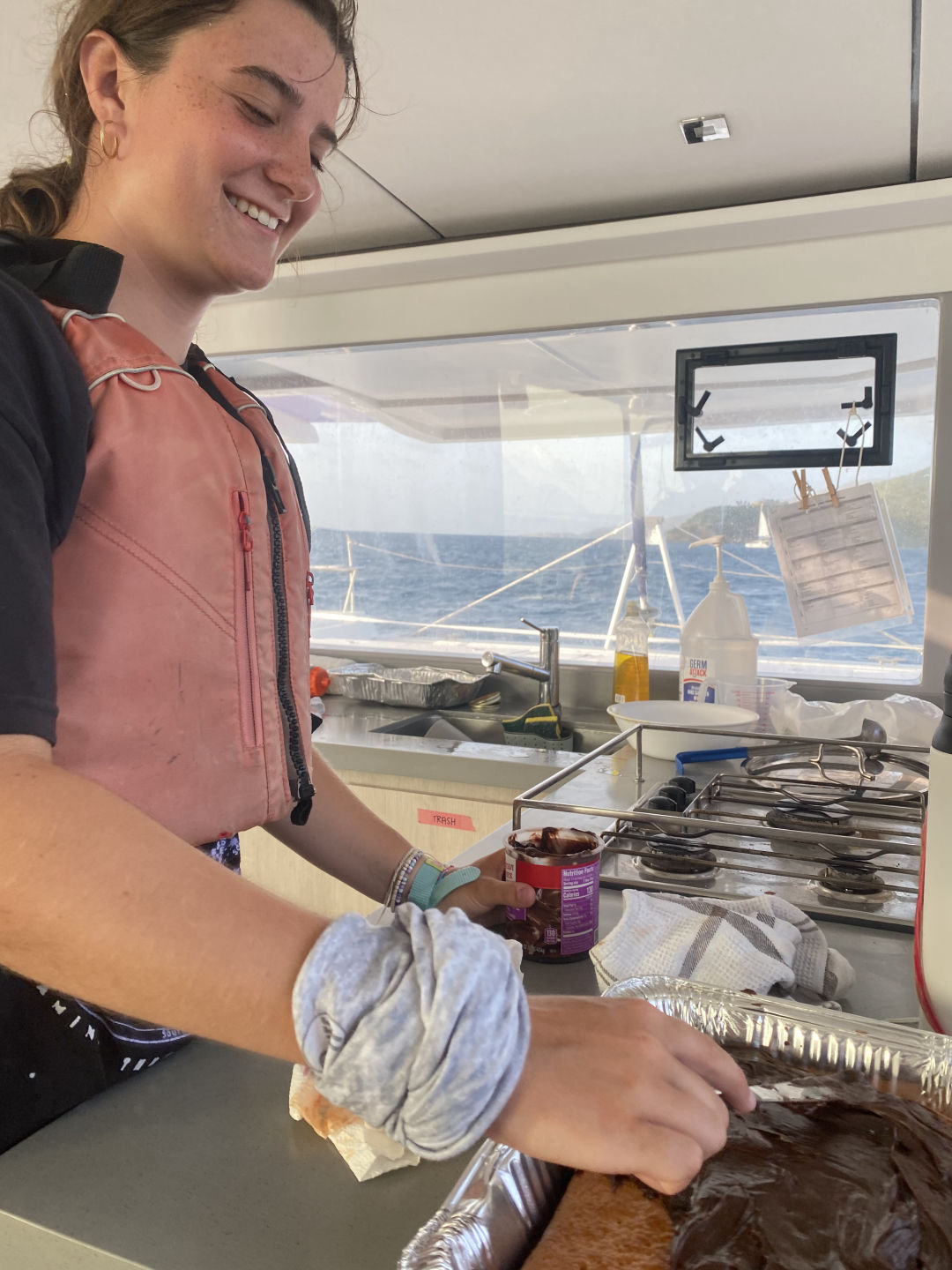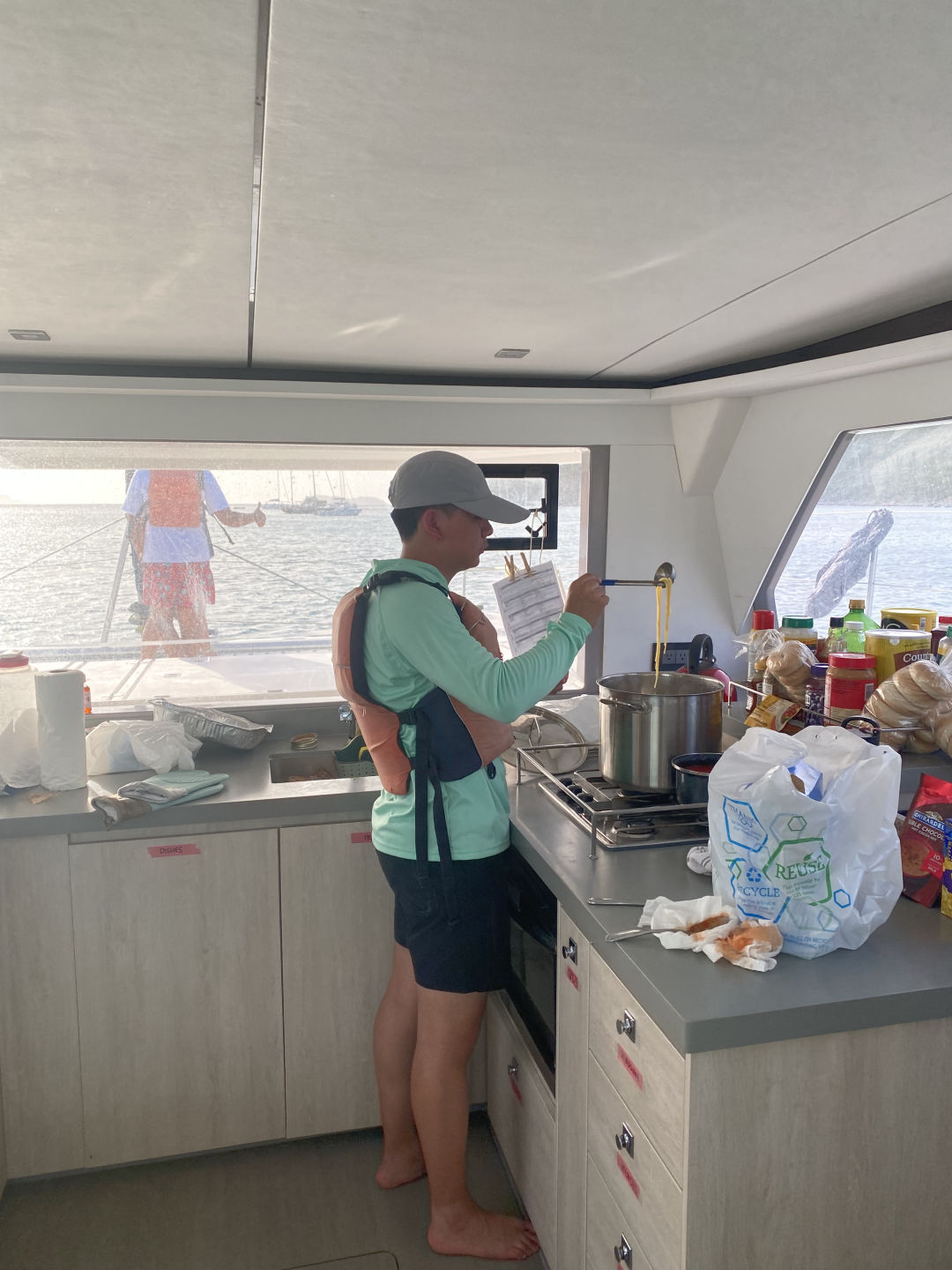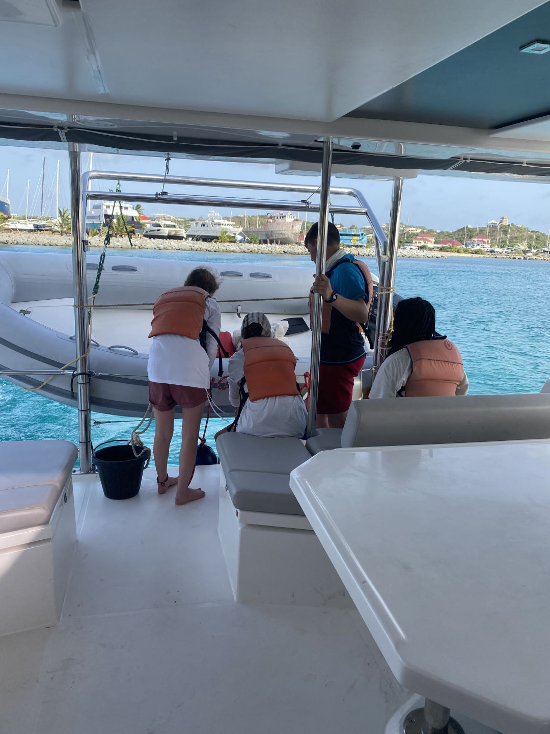 The day started with a wake-up call at 7 am. However, Mary and I woke up at 5:15 am to watch the sunrise for her birthday. Aidan and Matty P snuckily hung a Happy Birthday banner up in the salon, which was super sweet. After breakfast, we started our day with some water sports. While waiting for our turn to go out on the water, we had the opportunity to hang out with the other ship in our fleet, “Mary Lee”. We played a bunch of different card games, including Hearts and Spoons. Eventually, it was my turn to go out on the dinghy to try some cool sports. I got to try kneeboarding for the first time alongside Anno. It’s pretty much this board you kneel on. On the flip side, Ari and Ethan were pros.