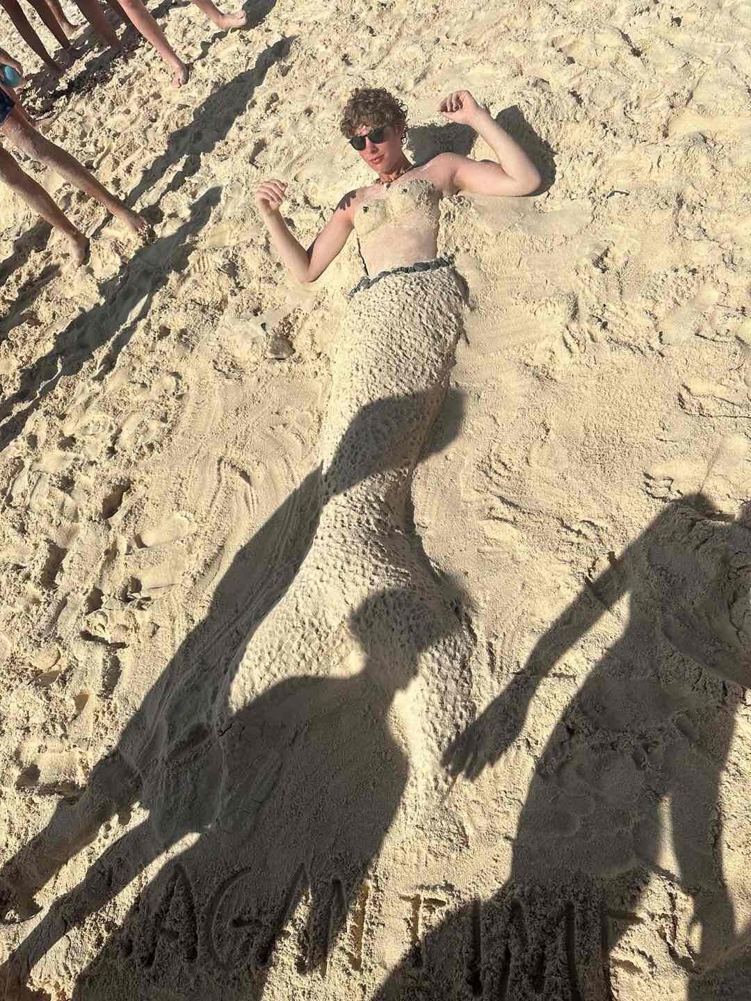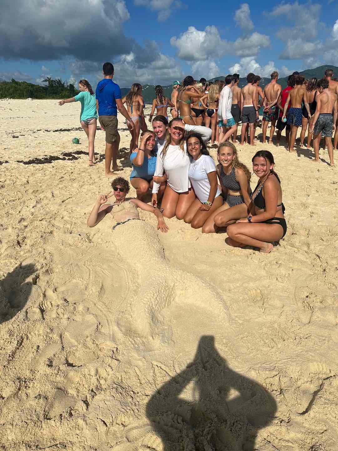 Today, we woke up bright and early at 6 am to our beautiful wake-up song, Shark Reggae (I highly recommend you check it out). We fueled ourselves with cereal before we all decided as a team we would go on a beautiful 6-mile hike with the rest of the fleet. We dingeyed over to Cane Garden and started the hike to the highest point in the BVI’s. Personally the hike started off a wee bit rough because the hike starts very steep. The goat she is, Augusta, offered to carry my backpack while we continued up. It took about 2 hours to get to the highest point of the mountain, where we all drank some delicious banana smoothies and enjoyed the view. It took Addy a bit longer to get up because she got lost looking at cows. But all is well because we came down the mountain to enjoy the town of Cane Garden and enjoyed lunch and some shopping. After lunch, we sailed maybe 20 minutes to a beautiful national park beach, where we participated in the fleet-wide sand-making castle competition. We all came up with the idea for our sand castle to turn Prentice into a sand mermaid. Violet and Grace picked up rocks from the ocean while Augusta and Addy worked on building the tail up. And Gigi enjoyed a nice beach nap. While we didn’t win the competition because it was rigged, we won in our hearts. Dinner was a great fleet-wide barbecue on the beautiful island of Jost Van Dyke, and we all enjoyed chicken and some delicious sides. While Addy, Grace, Prentice, Augusta, Hayes, and I went to buy some souvenirs, Violet and Gigi were tearing up the dance floor. Back on the boat, we were all knocked out because of our very long day, but we were all very excited for tomorrow’s next adventure.
