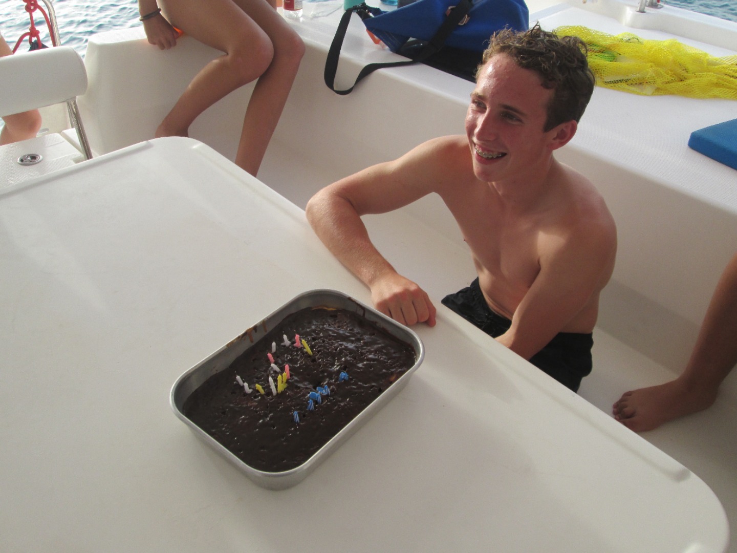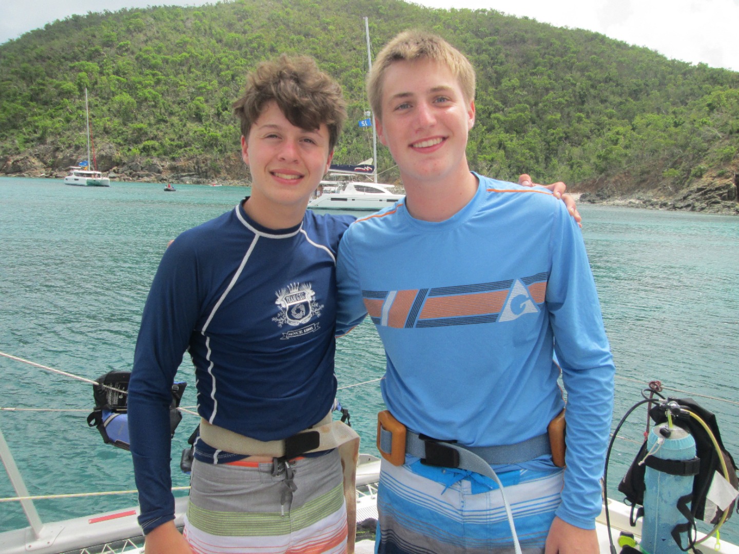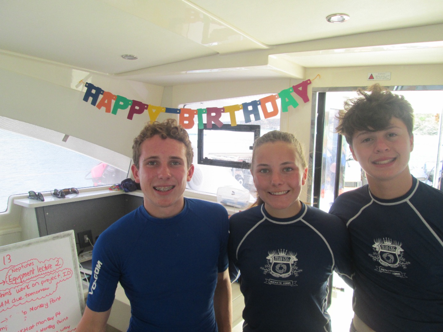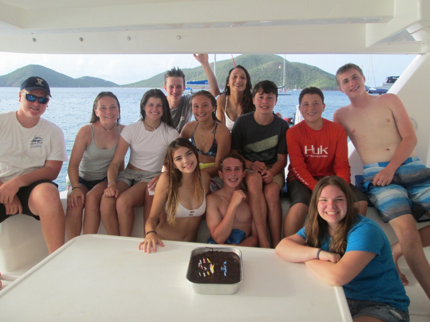 Today we woke up to another very beautiful morning in the BVI! It was Jackson’s birthday, so we sang to him over breakfast, while he ate the remaining Lucky Charms. After cleaning up from last nights red velvet cake, we split ways. Neptunes headed to an equipment chat, and Dolphins went to work on their projects. At the equipment chat, we did relay races of setting up dive gear while blindfolded! Back on the boat, we took an iconic ‘Entertainer’ nap. The Dolphins went on a research dive and then dissected a shark, while Neptunes enjoyed time on the beach. Before the beach BBQ, we surprised Jackson with a cake and more singing for his 15th birthday! Now we are off to a beach party!