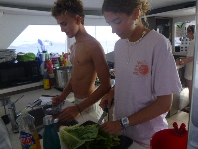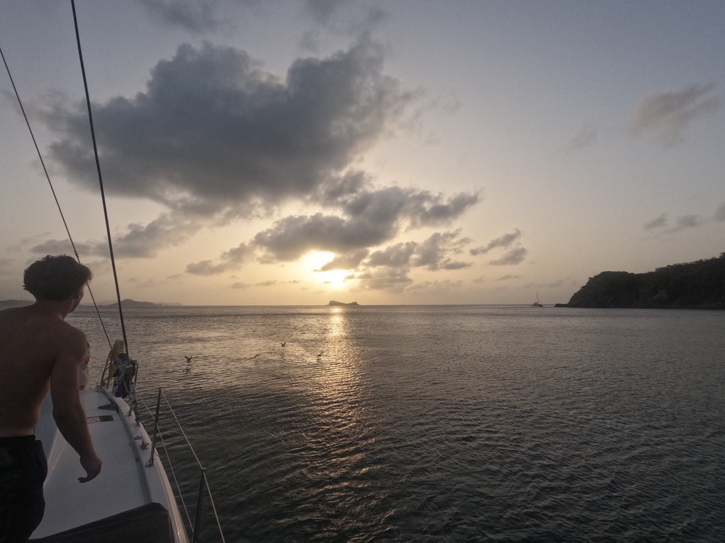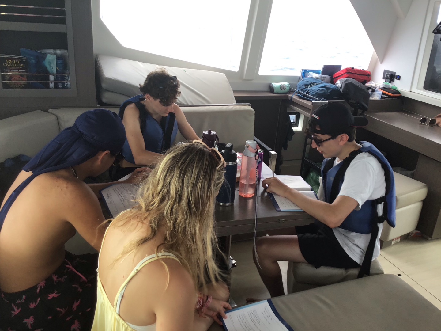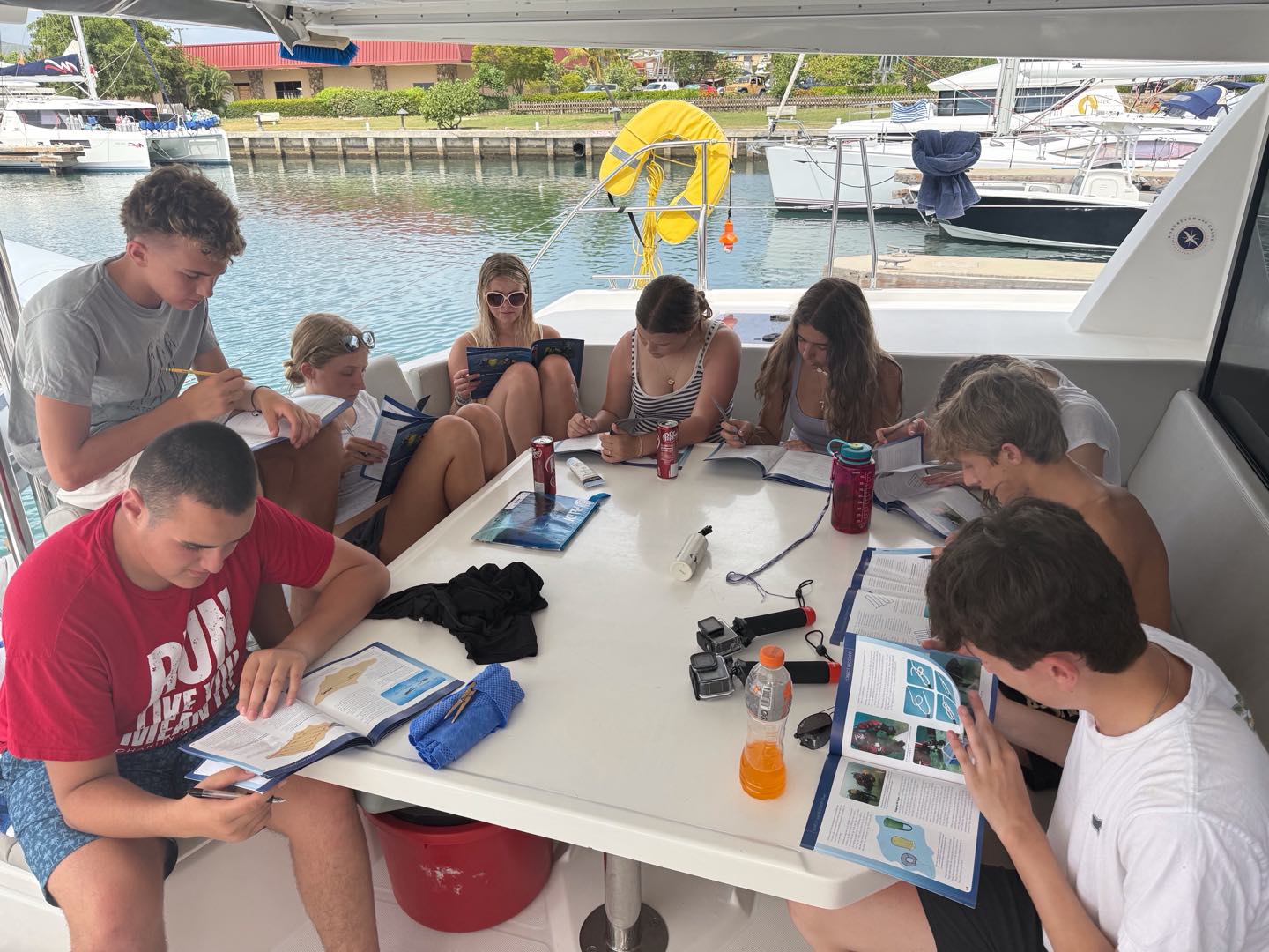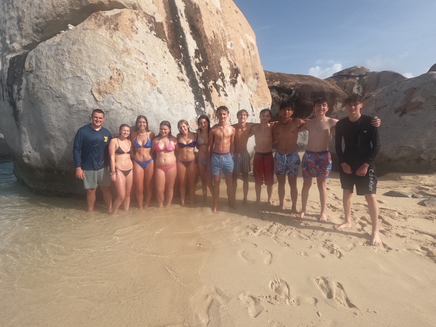 Waddup blog, it’s Matthew from Why Knot. Today, we started with a snooze and sail wake-up because the baths were waiting, and we needed to be first, per usual. Rachel and Dawson put together a nice fruit plate for us to enjoy with some oatmeal to fuel our adventures for the day. After that, we sun screened up while London gave us the rundown for the baths + Spanish town. After the talk, we all noticed Sail Caribbean was also at the Baths, but thankfully, all the AQ boats were able to find mooring balls. After that, we took Rango (our super dinghy, pride, and joy, and Ranch’s child) down to the baths. Maddie and Lucy hopped out first for the swim over because they were so eager for cave adventures. The baths are beautiful rock formations on a beach that were in the past used to bathe slaves on their journey to America, which is now a national park for travelers and locals to enjoy. After climbing and weaving our way through the rocks, Redden, Roman, Dawson, and I sent a few back flips off a rock into the ocean while we waited for the rest of the group. I thought the coolest part of it all was that the entire action quest fleet of 10 boats came to the baths at the same time. Ruby and Declan also befriended our new adopted Why Knot member, Blake from Hope, who was a nice kid looking to make some new friends. Post baths, we regrouped back on why not to sunscreen up and sail over to Spanish town. Scarlett and Evan led the rest of our group in a sailing karaoke dance party to brown eyed girl. Then once we arrived, we rotated over to turtle and bath for a delicious lunch. On our way, we stopped at the Asian market to stock up on some snacks to keep us dialed up till our next town visiting (Scarlett got like 50 lollipops to replace her strawberry açaí lemonade no inclusions venti from Starbucks). Then we went to Mr. Nice Guys, where we all got matched in PJs to do our next night dive in (photo shoot coming soon!!!). After Spanish town, we began our sail to Mountain Point while our staff, Player, and Rachel dropped crazy ball knowledge during our search and recovery review dive chat. After that we had what it seemed to be our first time to fully relax during our trip. The player put us all onto his favorite live music jams like the Grateful Dead, Widespread Panic, the Underground Spring House, and Dogs in a Pile. During our jam and chill sesh we almost lost our precious bean bags but thank goodness valentine our very own Humphrey was there to dive in on the spot to save them and bring them back to the boat, i guess we are learning a thing or too about rescues. To finish off the day, Dawson and Rachel made beef stroganoff, salad, and garlic bread, which the players rated a harsh 6.5. I’m so stoked to be on why not with all these cool people doing cool things every day. Hope you enjoyed the blog, get ready for tomorrow, BANGGGGGG!!!!