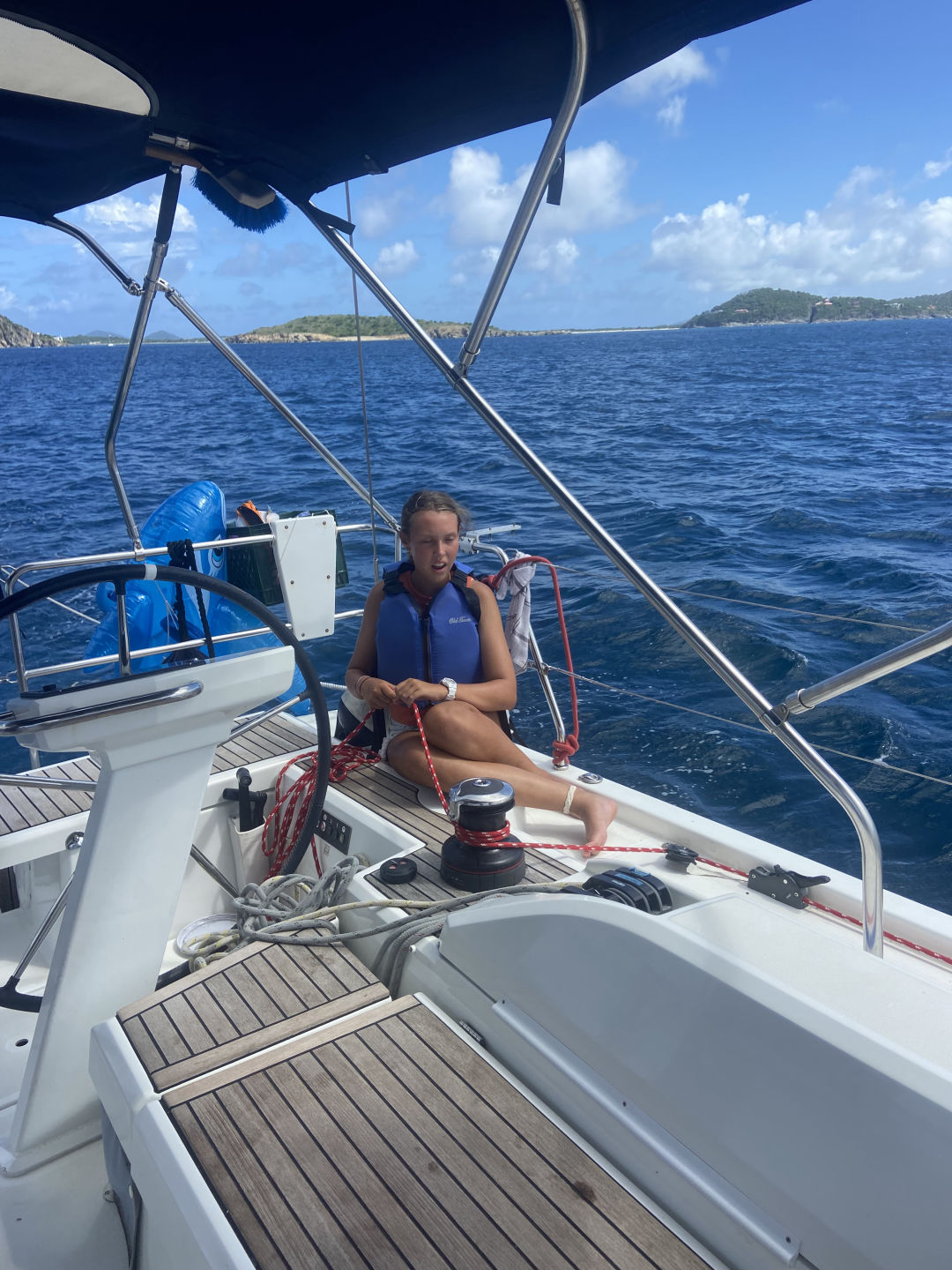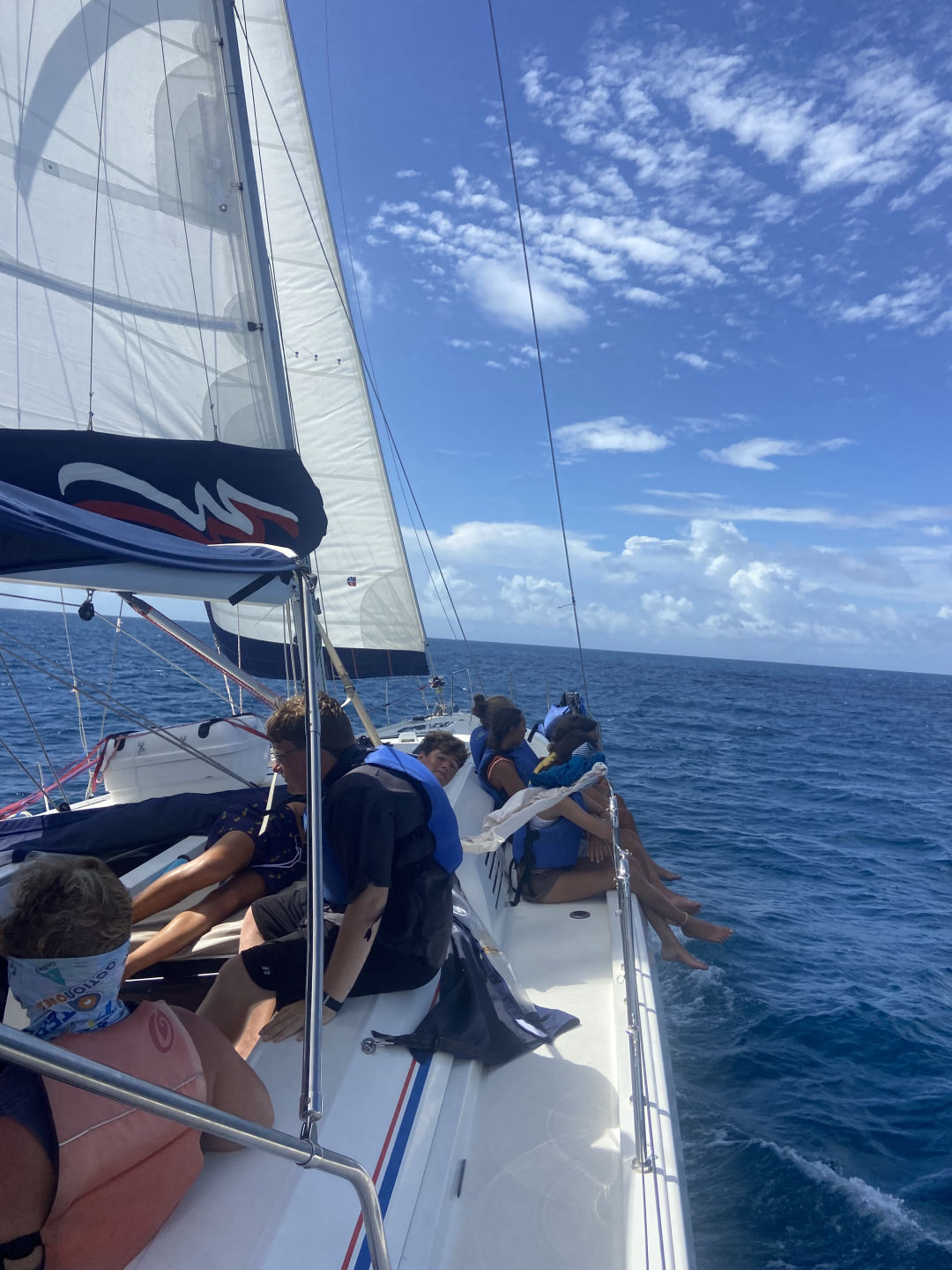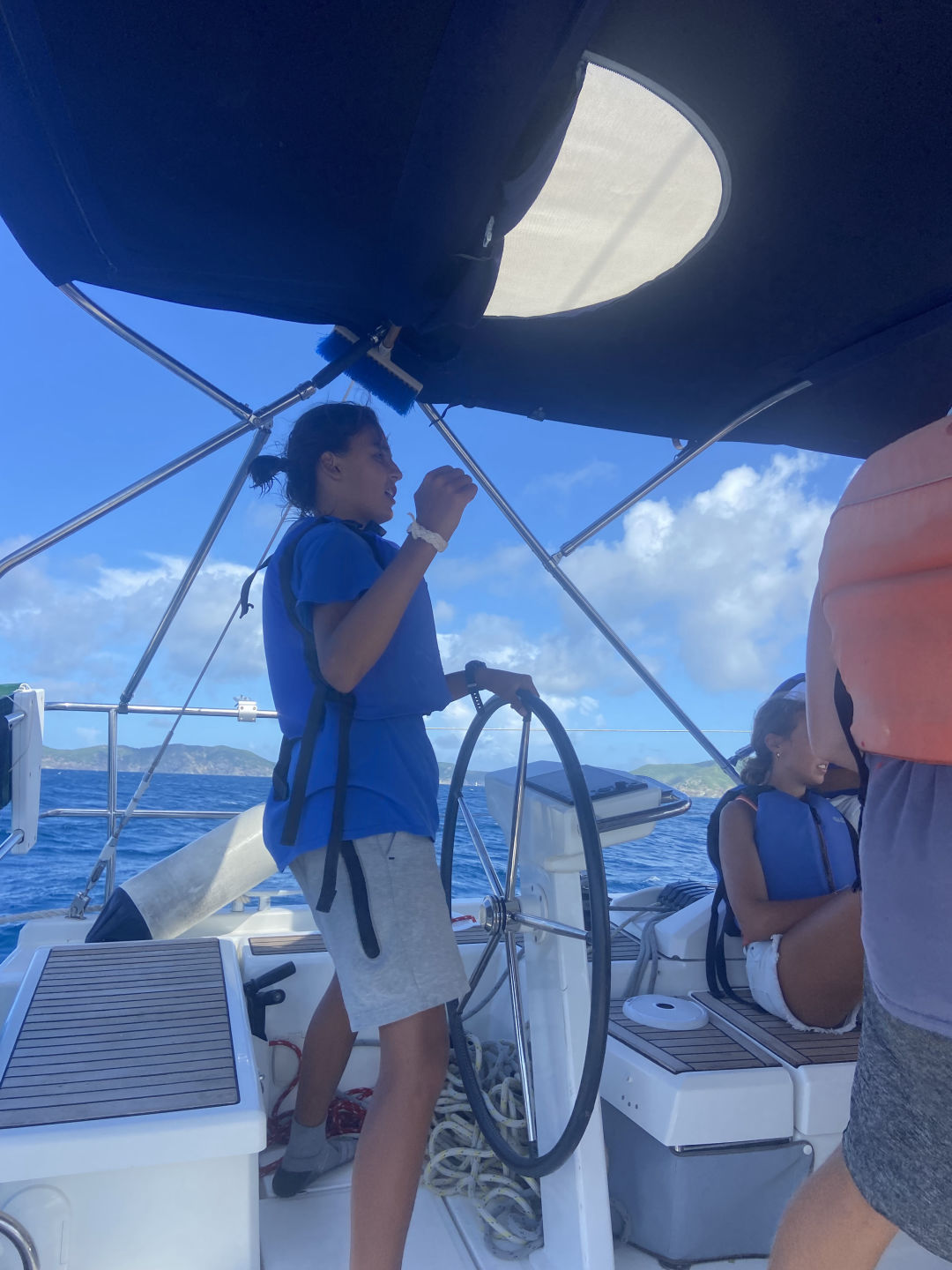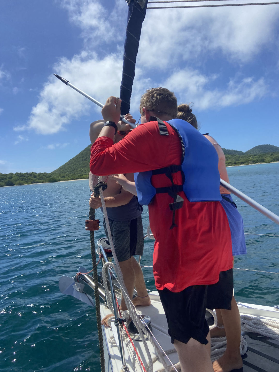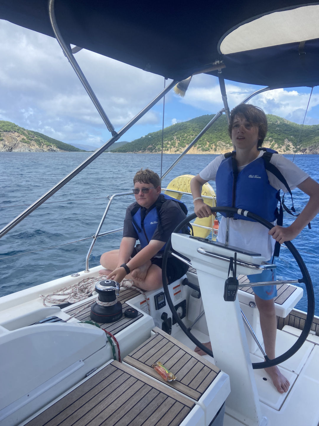 Hi, I am Alexa, and I am the skipper for today. Today was a packed day where we had shore time at Trellis Bay, then sail trained to Muskmelon Bay, where we had both scuba and sailing lessons. Here are bits and pieces of everyone’s day! Arhan went to the loose mongoose with Cameron and Conrad. They got burgers, waffles, and fried chicken, and in Conrad’s words, he had a scrumptious burger. Jasper and I went to the loose Mongoose too, and we ended up going to the cafe, where we got coffee and banana bread. Caitlin, Lilly, and Sienna all went to the loose Mongoose too, they also went to the store and got sunscreen, and Caitlin got a turquoise shirt that was beautiful and a mango chicken that looked really good. Arden went and got a pizza, and she said that it was probably the best pizza that she had ever had. Jake was shore support and made sure that nobody got hurt. Amelia got some chicken roti, and when she woke up, she went to a meeting, then drove while we picked up anchor, and drove us to the mooring ball, and we stayed there for a while. Amelia and Arden also went snorkeling around the boat for fun while we did one test. Amelia also taught us a lesson on boat physics. Giles got a rock necklace and shared some waffles with Cameron and the others. Giles also trimmed and eased the main sheet. Noah was also driving at the helm for a while as well as Adnan. Noah and Sienna both got stung by little jellyfish, and we saw thousands of moon jellies, and they were beautiful. Jacob hiked and cooked pancakes this morning with Lily, and that took probably more than an hour while, but they were amazing, and everyone ate them with Nutella or honey and other condiments. Adnan was also Batman and jumped into the water to save two dishes. Noah and Sienna both got stung by little jellyfish, and we saw thousands of moon jellies, and they were beautiful. Amelia also went out on Junior (the dinghy) and got Adnan’s shampoo which fell in the water.
