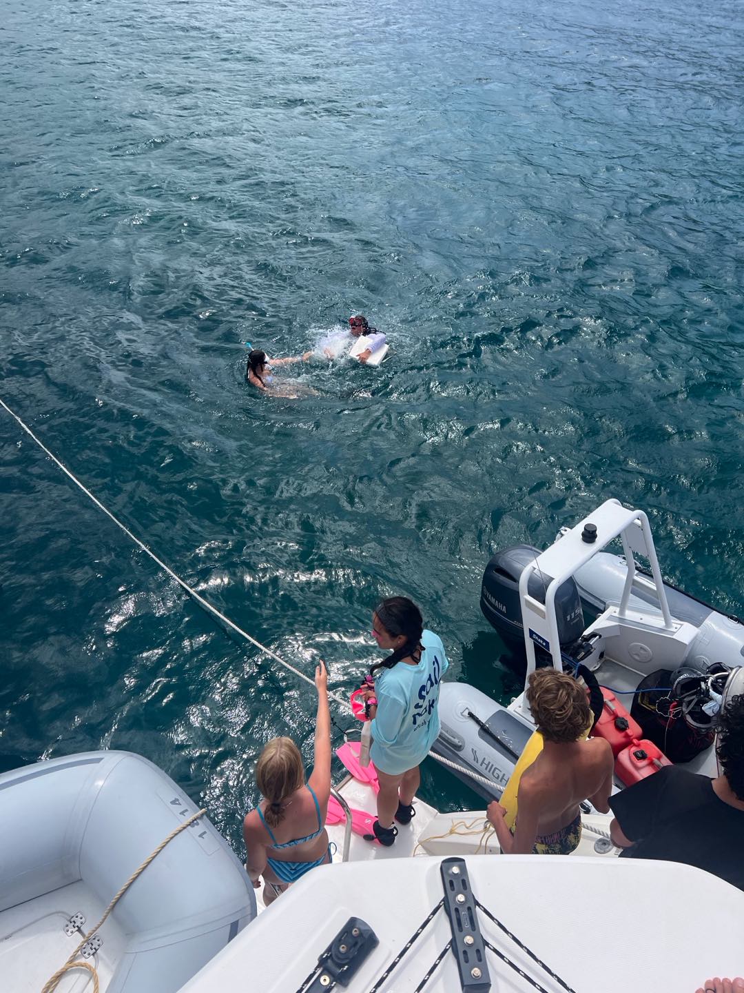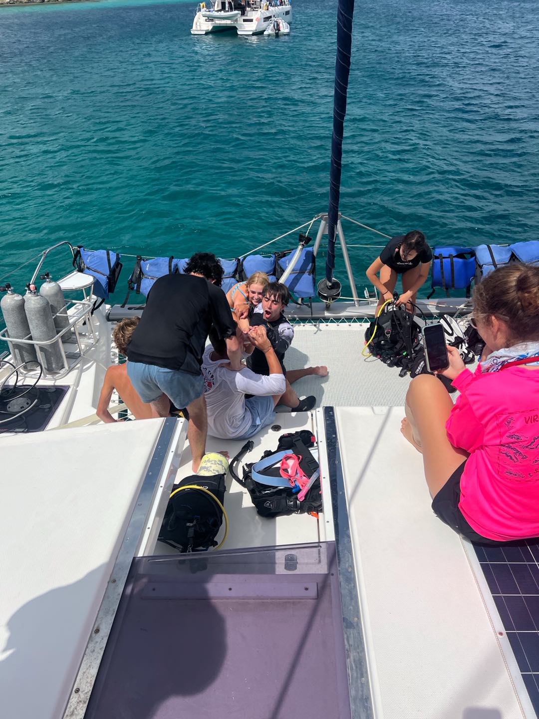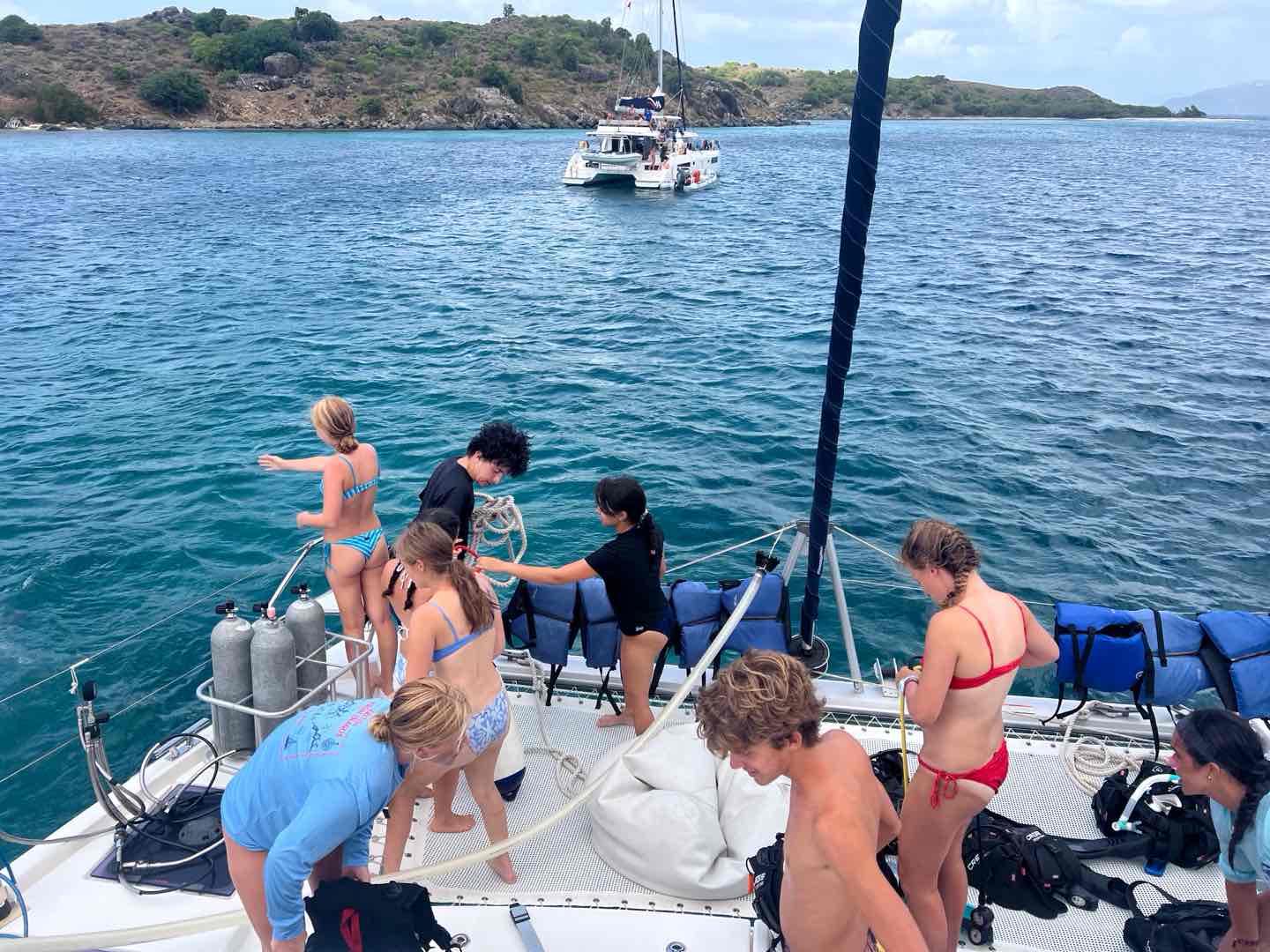 Today we started the day in Jost Van dyke by Sydney’s. Jackson and Cameron cooked French toast for breakfast while the staff had a meeting. It took a while, though. When they got back, we went underway and sailed to Sandy Spit. Ava and I played spit during the sail. After we arrived, we did our last search and recovery dive. Ava, Lorelai, and I had a little trouble because our object was super small and blended in pretty well, so it took a few tries. Then we sat around for a bit and ate lunch. After lunch, we had some paperwork to do while Ellery, Cameron, and Audrey helped clean the dinghy. But then we got surprised in the middle of paperwork with our first rescue scenario! There was a panicked diver that Lorelai kept an eye on while Casey jumped in with two Chiclets to rescue him. To add to the chaos, another panicked diver surfaced while Kate and Maya started to look for the first missing diver underwater. Jackson pulled out the first panicked diver while Casey switched gears to focus on the second. Ava and I jumped in to help look for another missing diver underwater. The panicked divers kept jumping in despite Aiden’s best efforts while Ellery, Audrey, and Cameron watched the show. After the scenario ended, we had a long debrief about all of the things that we did right and wrong, and prepared for a Fun Dive at The Playgrounds. We all saw a massive ray and completed a great dive. We came back to a great dinner of franks and beans made by our incredible chefs for the day. Now we are playing a game of extreme Uno.