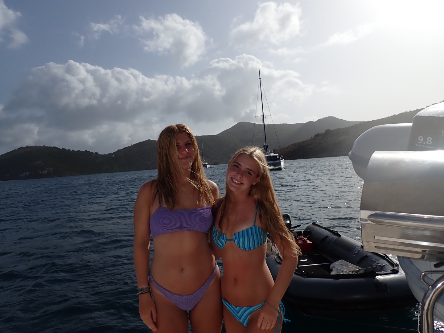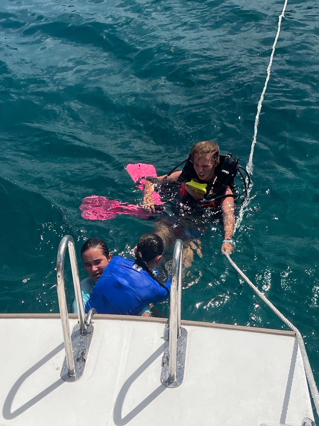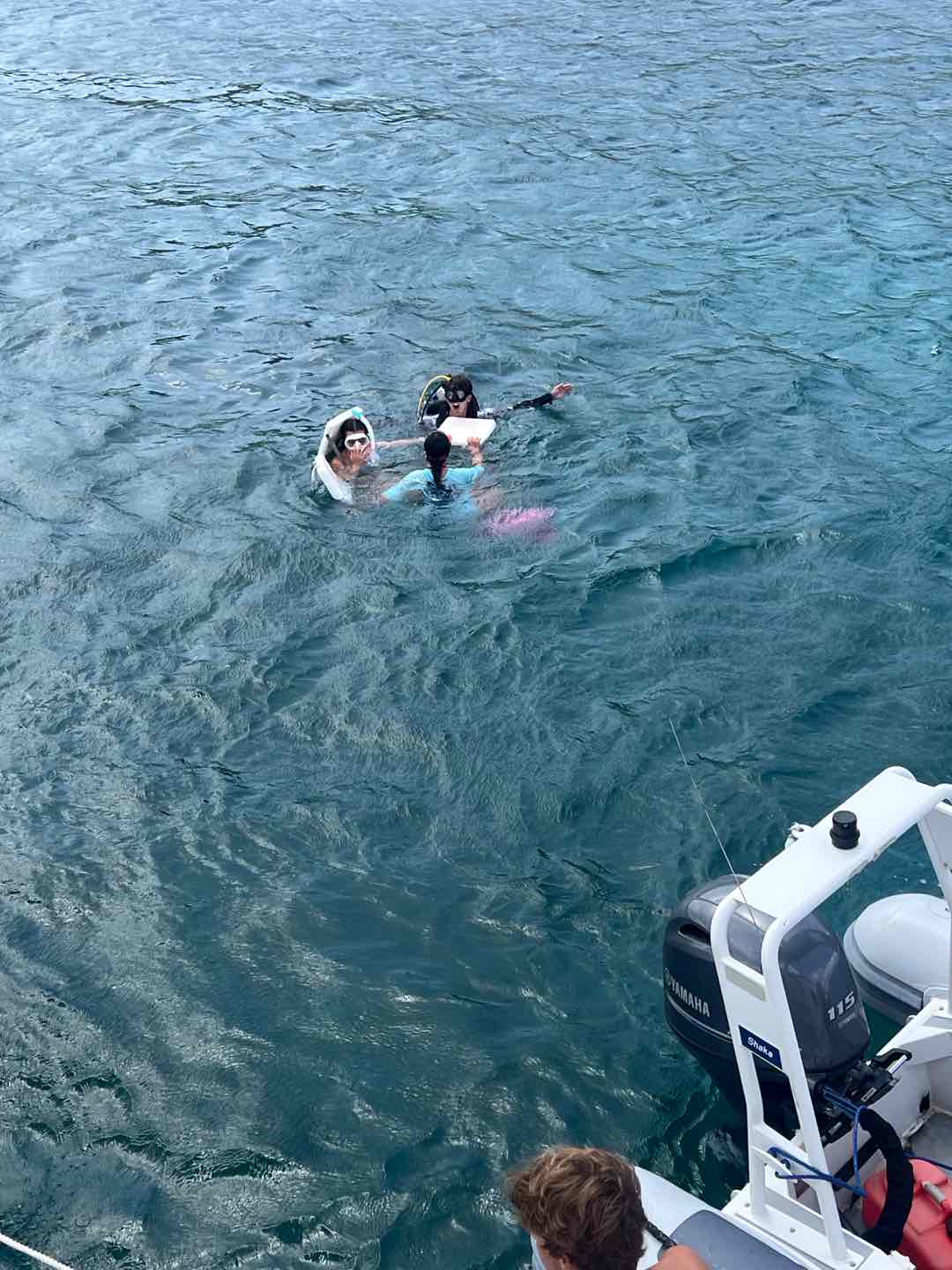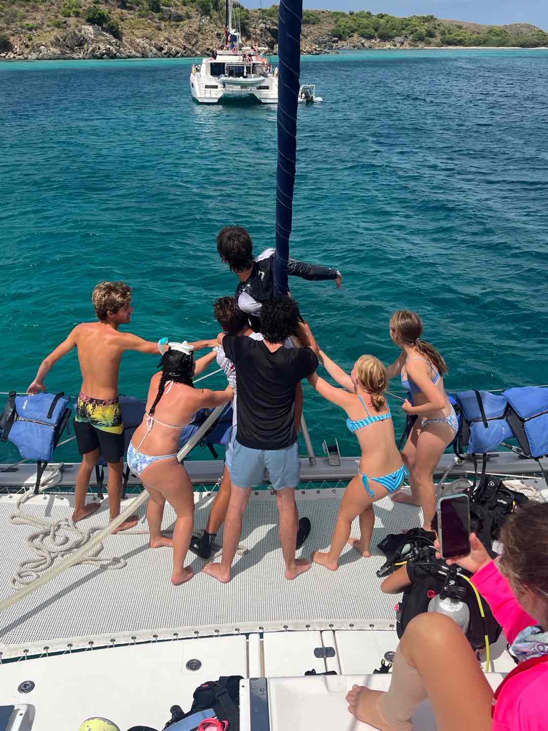 Today we started the day in Jost Van dyke by Sydney’s. Jackson and Cameron cooked French toast for breakfast while the staff had a meeting. It took a while, though. When they got back, we went underway and sailed to Sandy Spit. Ava and I played spit during the sail. After we arrived, we did our last search and recovery dive. Ava, Lorelai, and I had a little trouble because our object was super small and blended in pretty well, so it took a few tries. Then we sat around for a bit and ate lunch. After lunch, we had some paperwork to do while Ellery, Cameron, and Audrey helped clean the dinghy. But then we got surprised in the middle of paperwork with our first rescue scenario! There was a panicked diver that Lorelai kept an eye on while Casey jumped in with two Chiclets to rescue him. To add to the chaos, another panicked diver surfaced while Kate and Maya started to look for the first missing diver underwater. Jackson pulled out the first panicked diver while Casey switched gears to focus on the second. Ava and I jumped in to help look for another missing diver underwater. The panicked divers kept jumping in despite Aiden’s best efforts while Ellery, Audrey, and Cameron watched the show. After the scenario ended, we had a long debrief about all of the things that we did right and wrong, and prepared for a Fun Dive at The Playgrounds. We all saw a massive ray and completed a great dive. We came back to a great dinner of franks and beans made by our incredible chefs for the day. Now we are playing a game of extreme Uno.
